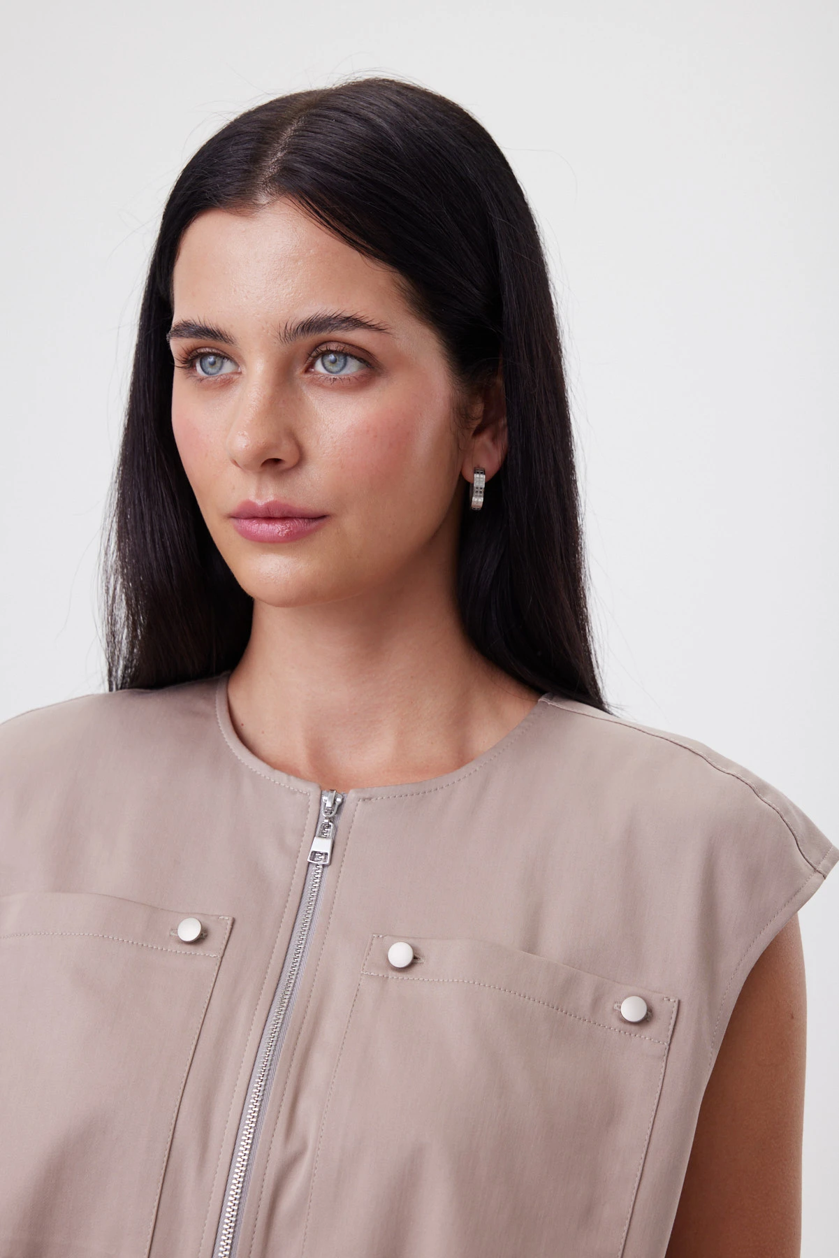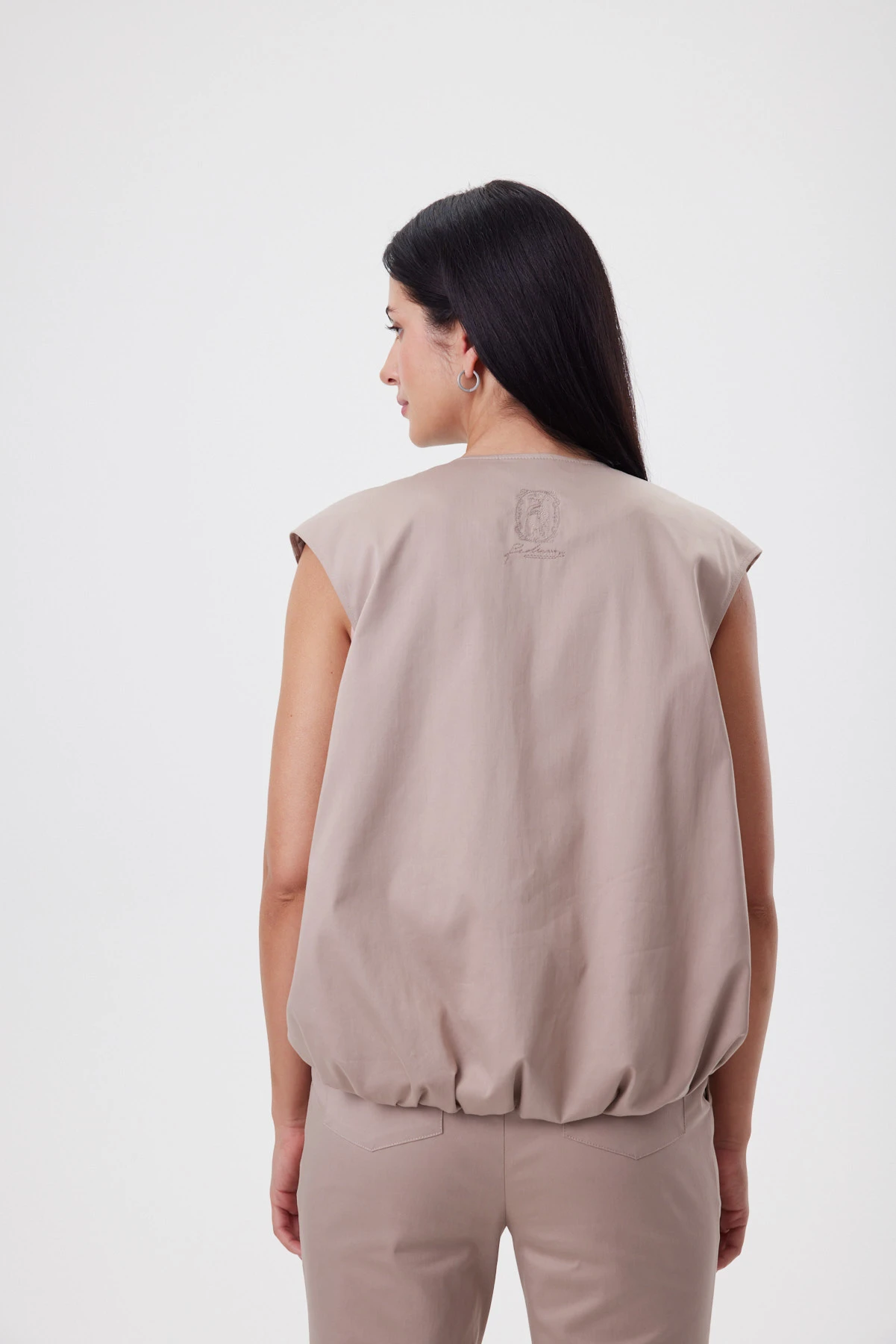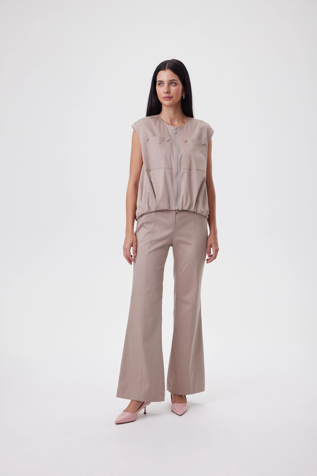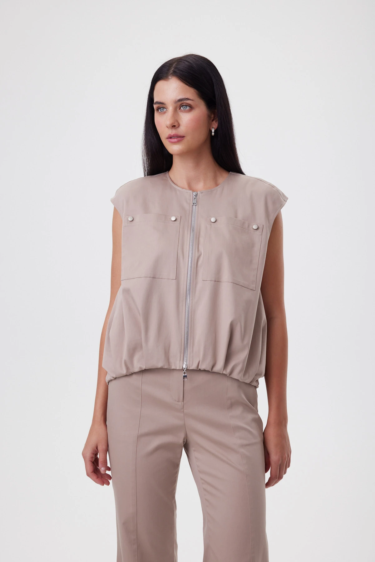 Жилет с мягким объёмом по низу создаёт вокруг фигуры лёгкое «облако» и делает талию визуально тоньше за счёт контраста формы. Укороченный перед добавляет динамики, удлинённая спинка вытягивает силуэт — образ получается лёгким, современным и очень женственным. «Миндальный нюд» мягко подсвечивает кожу и выглядит премиально даже без аксессуаров. Пластичная ткань держит красивую форму в движении. Жилет легко собирает комплект: с широкими брюками даёт эффект длинных линий, с джинсами — делает casual более элегантным, поверх платья — добавляет модную архитектуру без тяжести.