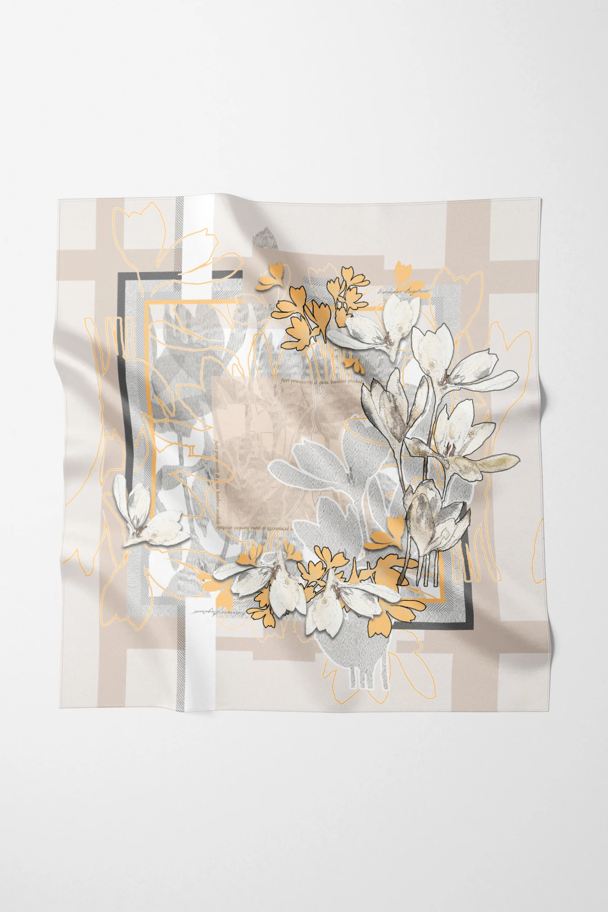 Принт погружает нас в атмосферу весеннего пробуждения, когда природа оживает, расцветая яркими красками и утончёнными формами. Светлый белый фон создаёт ощущение свежести и чистоты, подчёркивая яркие и насыщенные элементы переднего плана. В принте преобладают шафрановые и мягкие серые оттенки, которые придают принту тепло и уют, напоминая солнечные весенние дни. Тёмно-бежевые и серо-коричневые линии, прорисовывающие контуры цветов, добавляют глубины и выразительности композиции. Цветы крокусов изображены в разных стадиях цветения – от бутонов до полностью раскрытых цветков, что символизирует начало весны и пробуждение природы. Использование акварельной техники придаёт принту мягкость и нежность. Флёр импрессионизма в прорисовке деталей передаёт мимолетность момента и яркую энергию вдохновения. Благодаря сочетанию тёплых оттенков, принт излучает свет и тепло, создавая ощущение уюта и радости. Принт напоминает нам о чуде природы и непрерывном цикле жизни, который каждый год приносит новые цветы и новые надежды.
