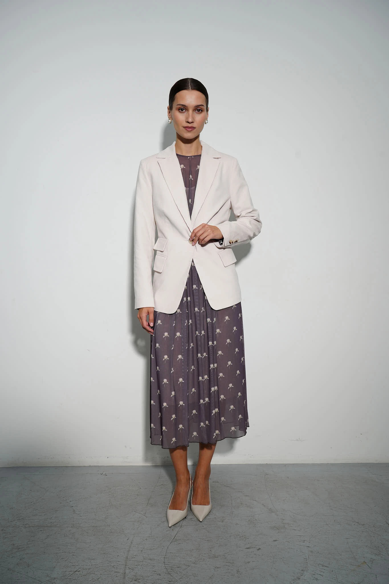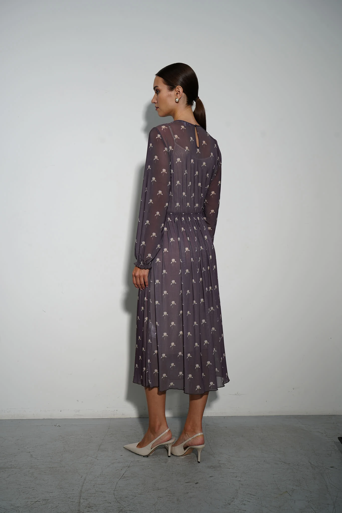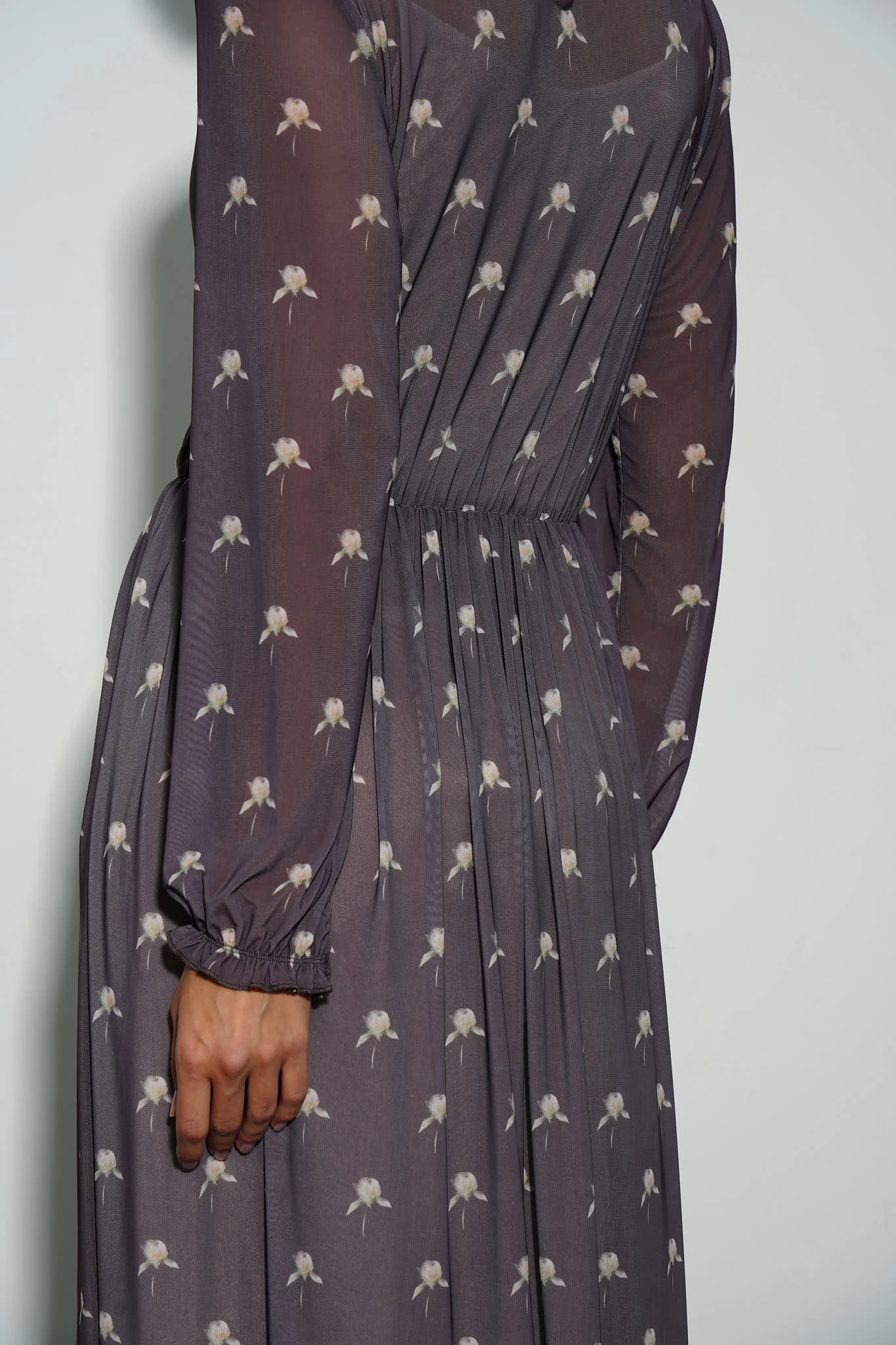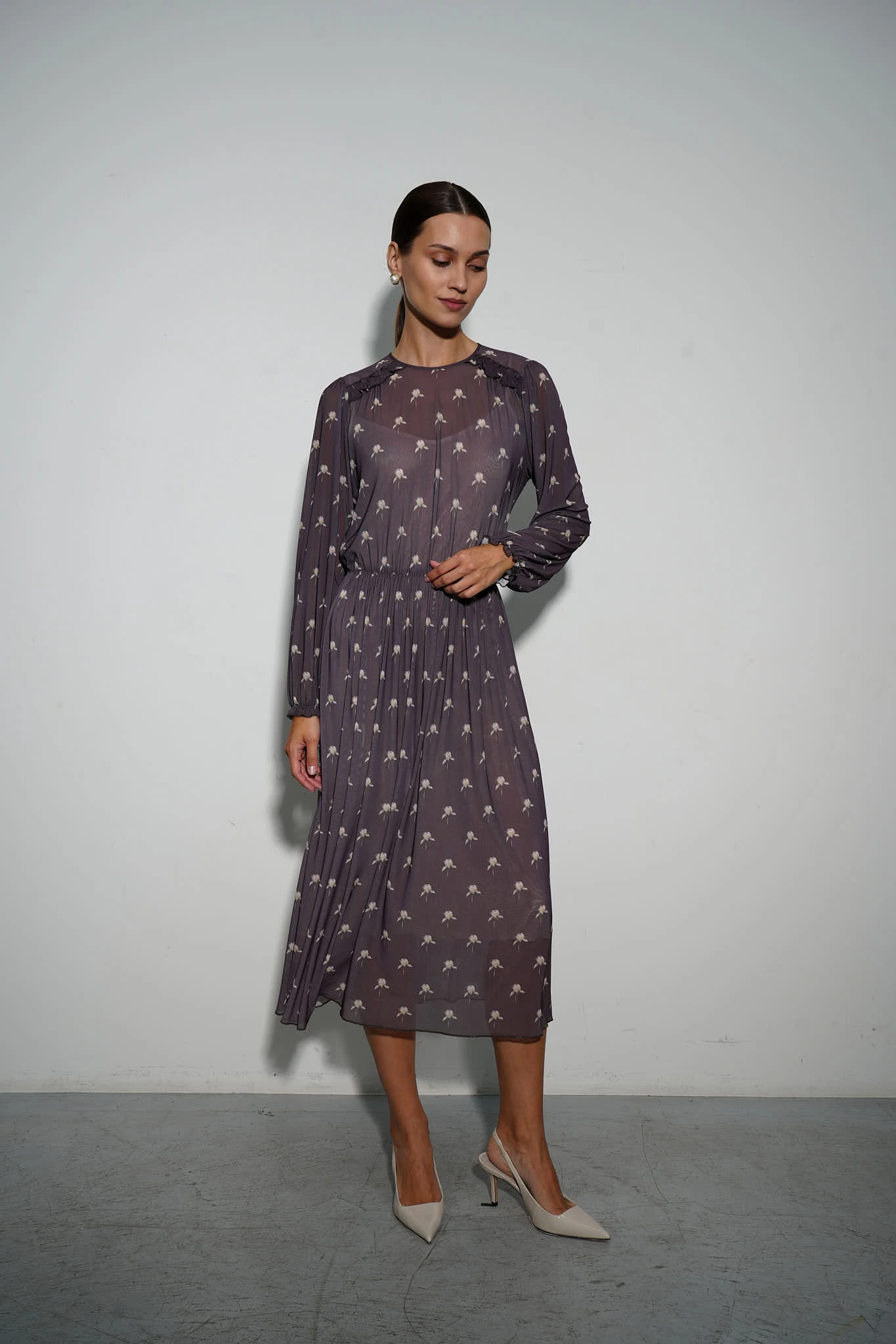 Платье из эластичной сетки с авторским раппортом в виде бутонов пионов на фоне изысканного оттенка «тауп». Платье отрезное по линии талии на эластичной ленте подчёркивает фигуру, создавая изящный силуэт. Юбка А-силуэта длины миди подойдет для любого типа игуры. Кокетливые рюши на плечах и воздушные рукава, собранные на манжетах, придают образу романтичное очарование. Лёгкая комбинация из вискозы на регулируемых бретелях обеспечивает комфорт и непрозрачность.