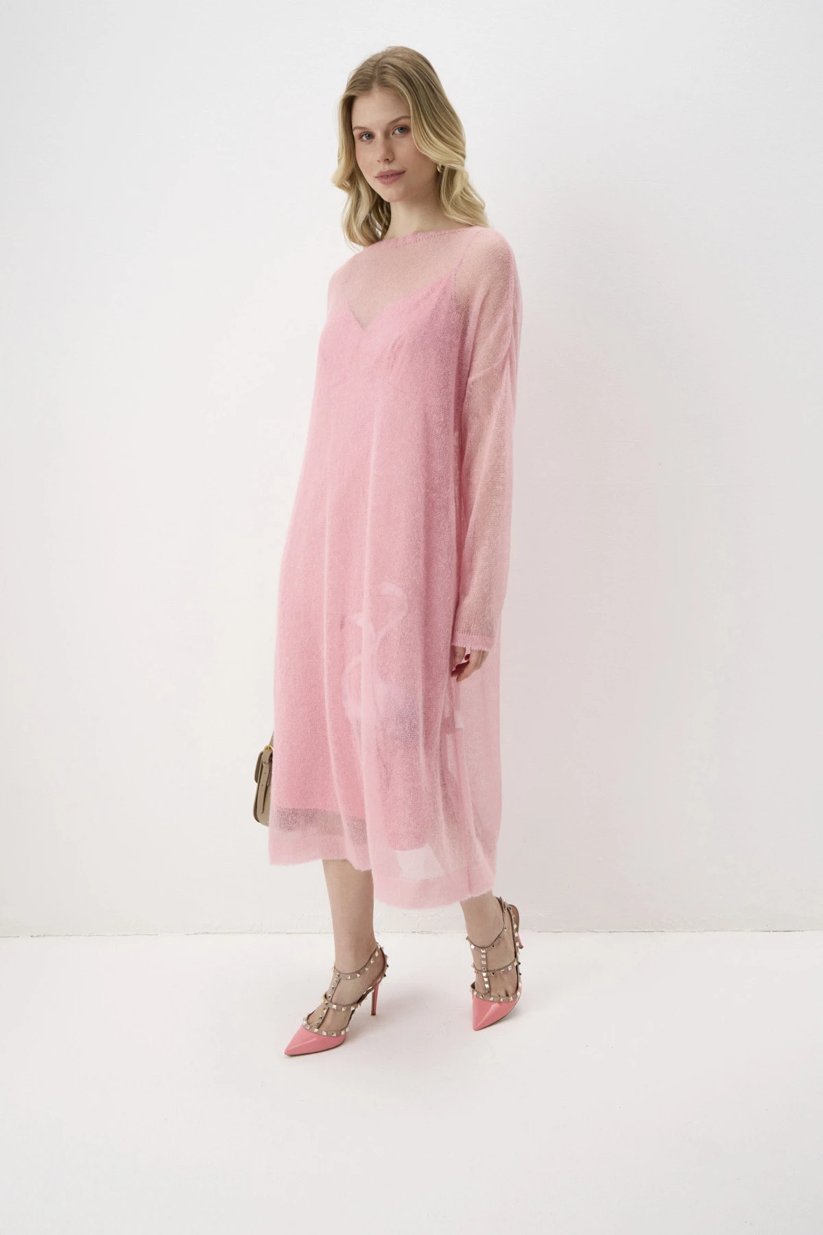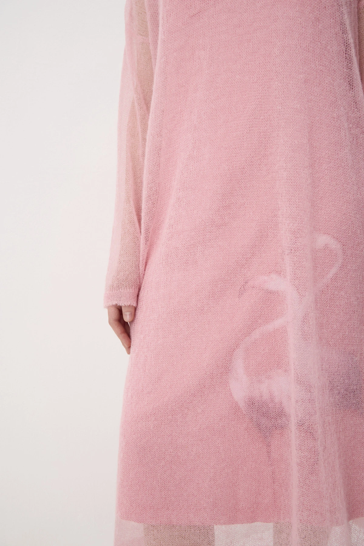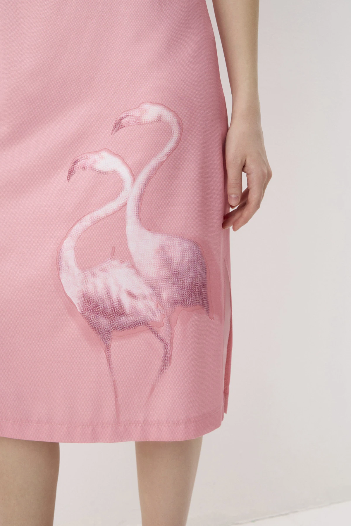 Верхнее платье из воздушного трикотажного полотна с добавлением вискозы и мохера. Нижнее платье из поливискозы имеет благородный атласный блеск. Оба платья объединяет романтичный оттенок «розовый фламинго». Мелкий раппорт нижнего платья подыгрывает ажурной фактуре верхнего. Принт с изображением пары фламинго, выполненный приёмом print placement – нанесён с левой стороны переда нижнего платья, возвращает нас к истокам бренда - именно с этого образа началась история ALEXANDER BOGDANOV. Подрезной лиф с V-образным вырезом и вытачками на тонких регулируемых бретелях позволяет носить платье самостоятельно или дополнив жакетом, кардиганом, джемпером.
