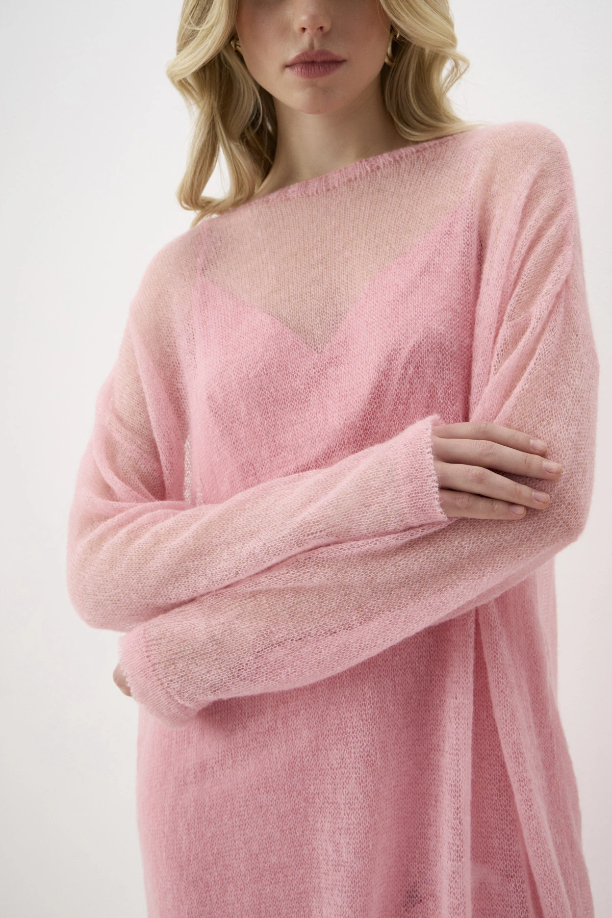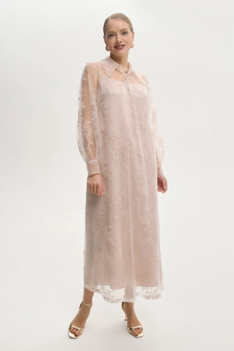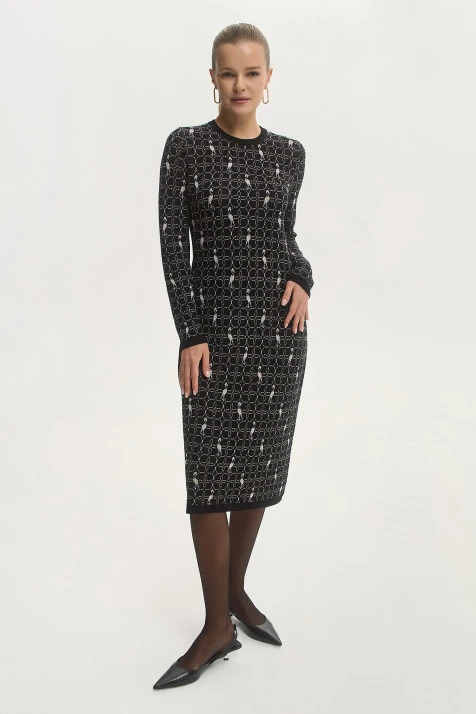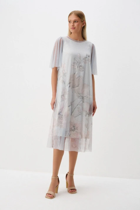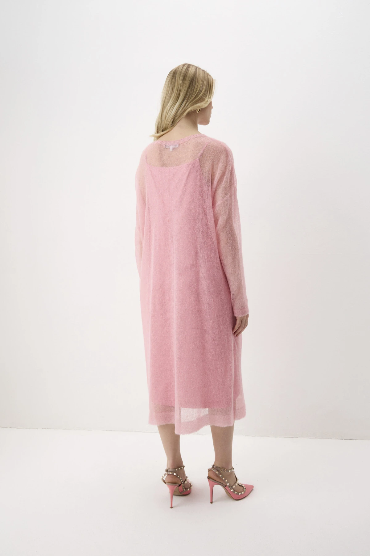 Верхнее платье из воздушного трикотажного полотна с добавлением вискозы и мохера. Нижнее платье из поливискозы имеет благородный атласный блеск. Оба платья объединяет романтичный оттенок «розовый фламинго». Мелкий раппорт нижнего платья подыгрывает ажурной фактуре верхнего. Принт с изображением пары фламинго, выполненный приёмом print placement – нанесён с левой стороны переда нижнего платья, возвращает нас к истокам бренда - именно с этого образа началась история ALEXANDER BOGDANOV. Подрезной лиф с V-образным вырезом и вытачками на тонких регулируемых бретелях позволяет носить платье самостоятельно или дополнив жакетом, кардиганом, джемпером.