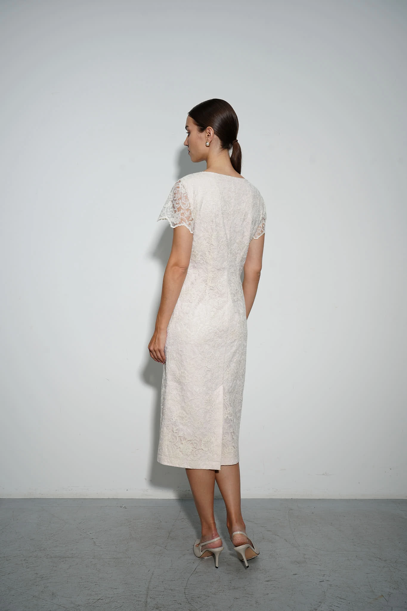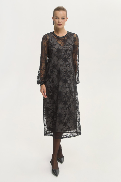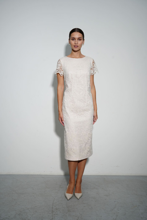 Платье прямого силуэта длины миди с вышитым по сетке хлопковой нитью флоральным узором в сливочном оттенке. Модель дополнена гигроскопичным хлопковым подкладом. Сочетание фактур и оттенков создаёт романтичный флёр. Шлица обеспечивает комфорт в движении. Застёжка на потайную молнию в боковом шве. Нежные фактуры и утончённые детали подчеркнут женственную природу обладательницы платья.