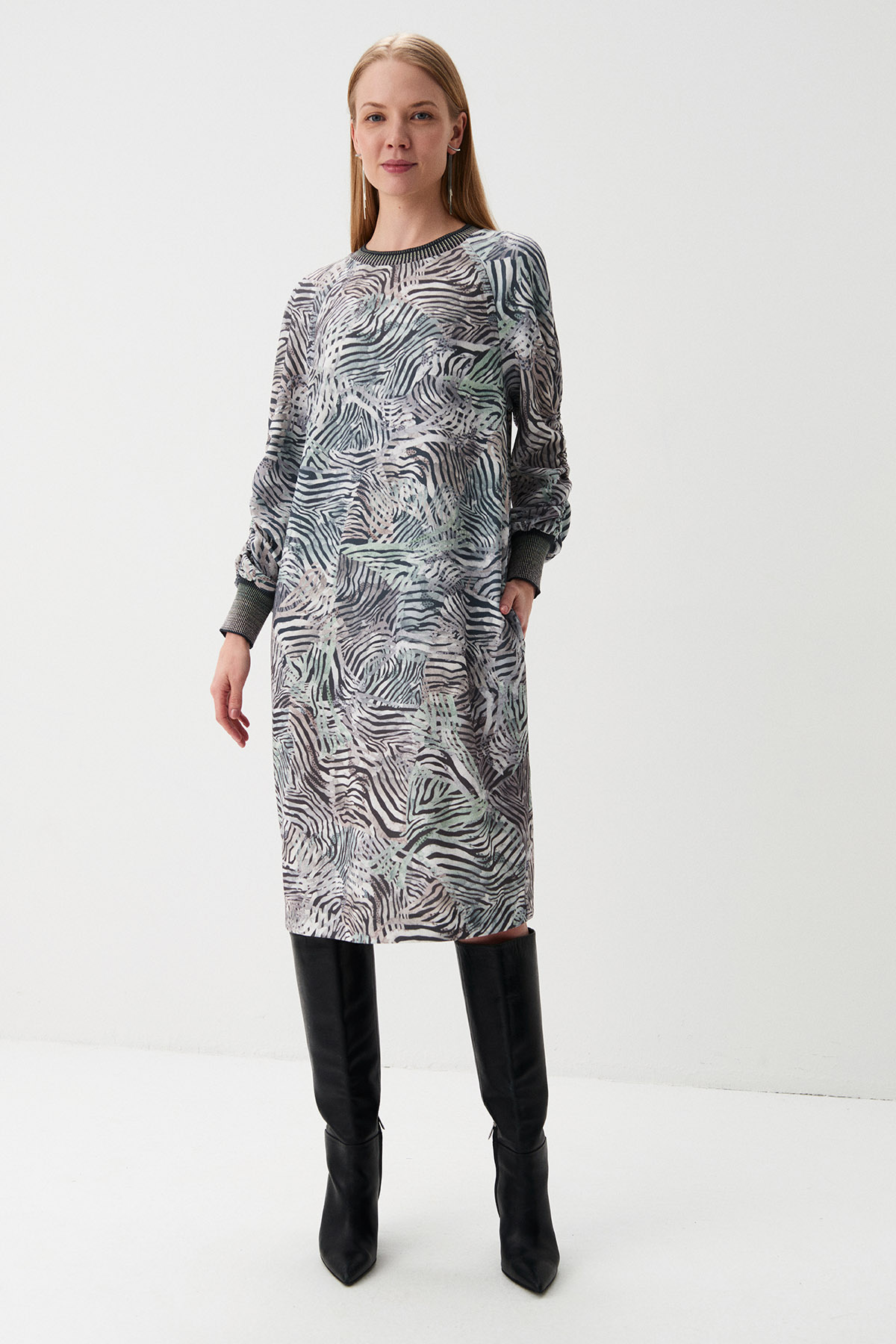 Крой:Платье прямого силуэта с нагрудными вытачками длины ниже колена. Рукава реглан полной длины собраны кулиской от локтя до манжетов.