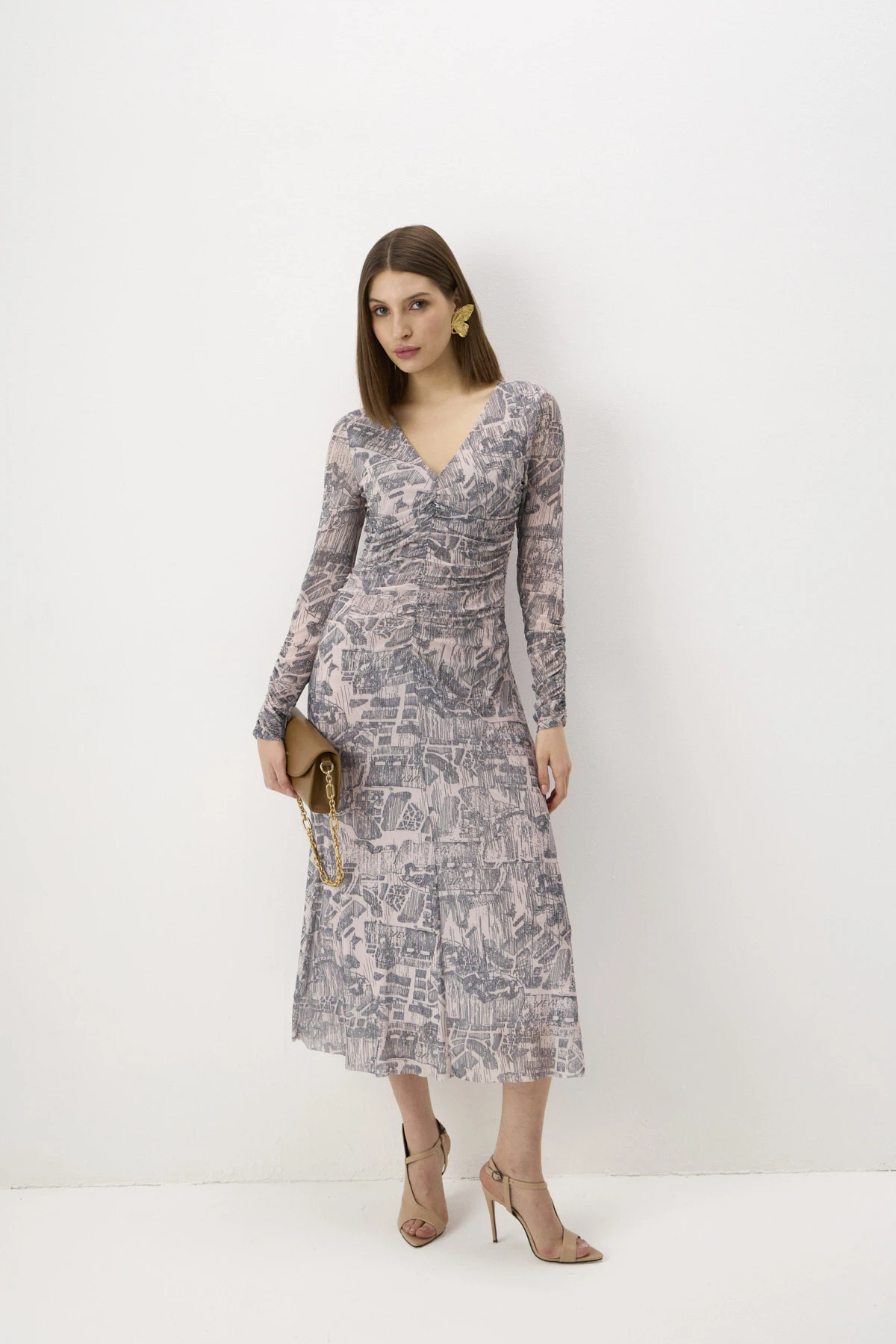Восхитительное платье из мягкой эластичной сетки с авторским принтом. По центру – эффектная сборка, создающая соблазнительную драпировку ткани по телу. Полупрозрачный принт на нюдовом фоне и фактура невесомой сетки создают смелый трендовый «обнажённый» эффект. Непрозрачность платья обеспечена подкладом из сетки молочного оттенка. Длинные рукава, по низу которых небольшие сборки, подчёркивающие красоту изящных запястий.