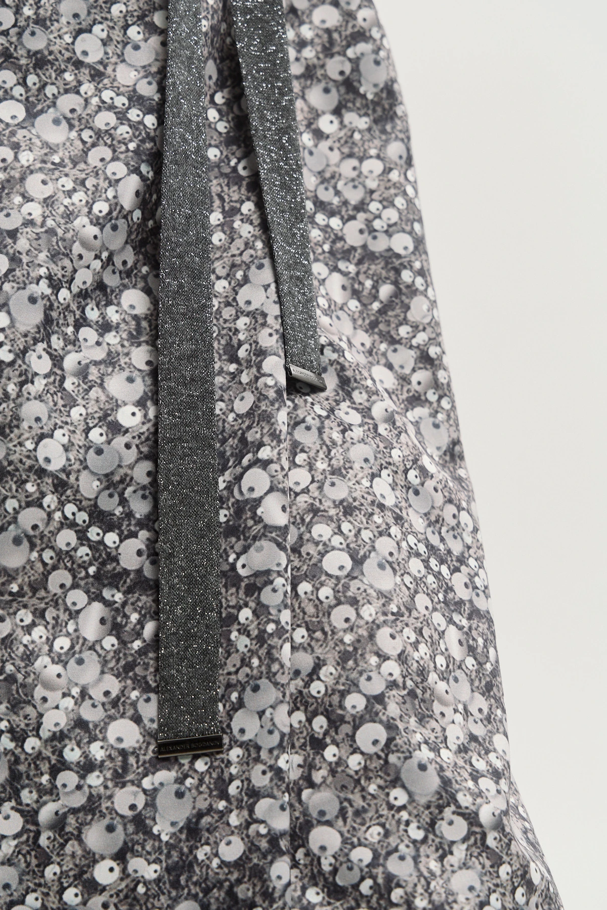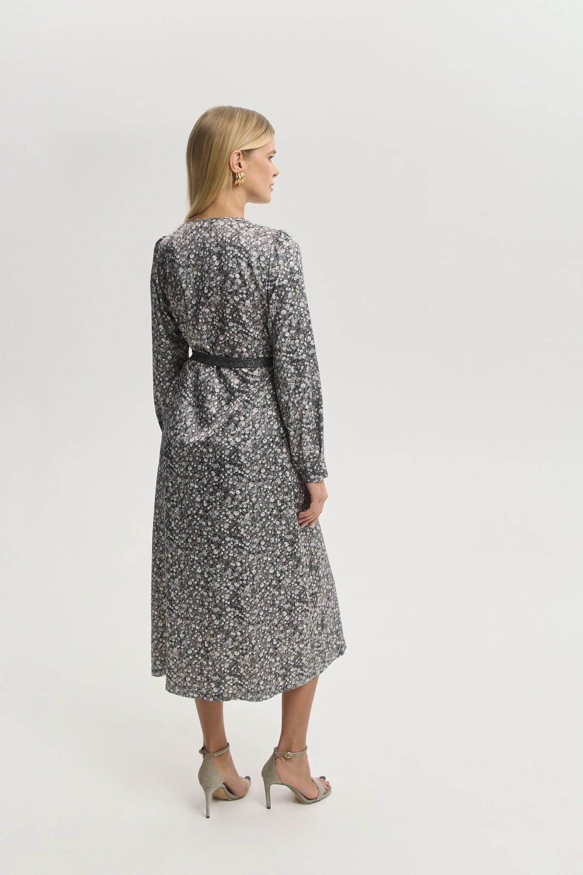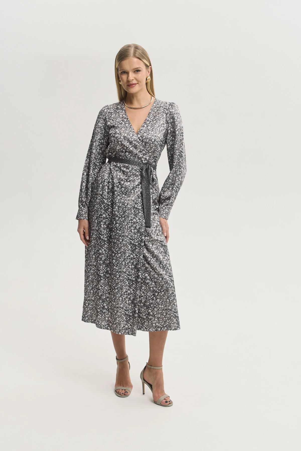 Женственный крой с запахом формирует выразительный силуэт и подчёркивает талию. Ткань с изящным контрастным паттерном, имитирующим пайетки, оживляет образ, оставаясь в рамках классики.