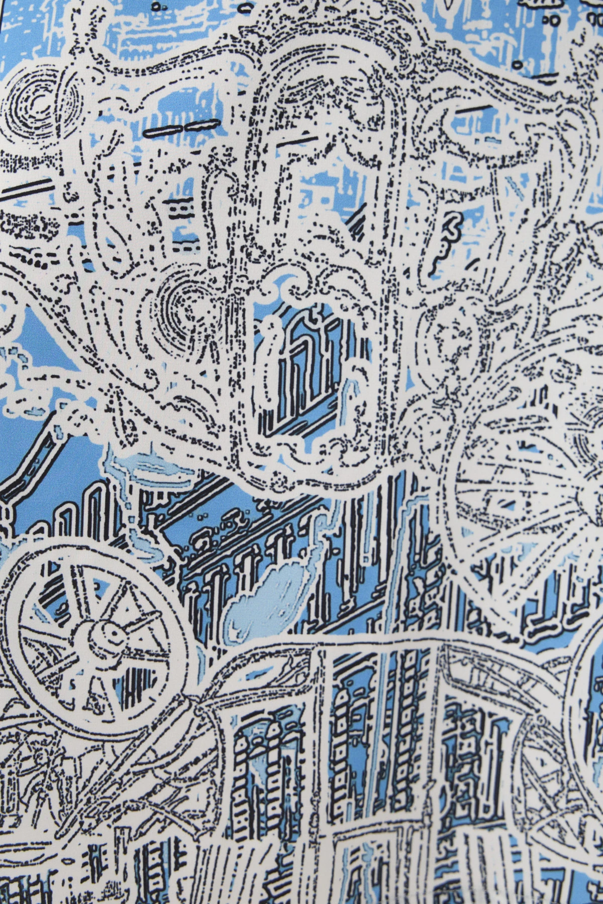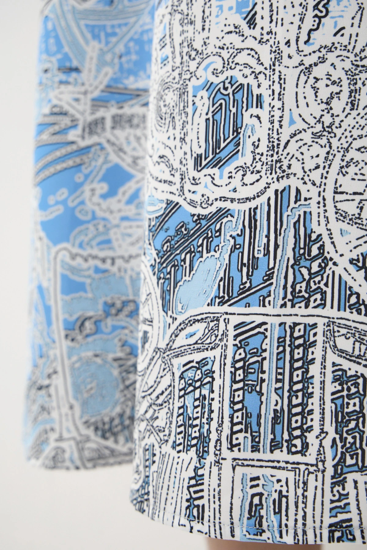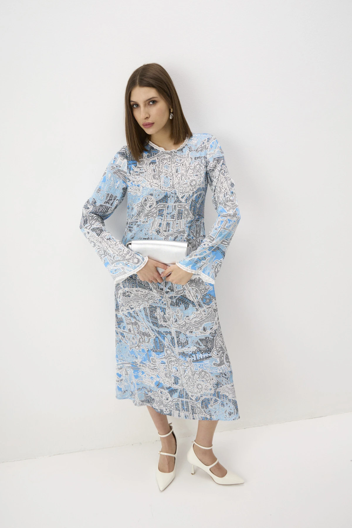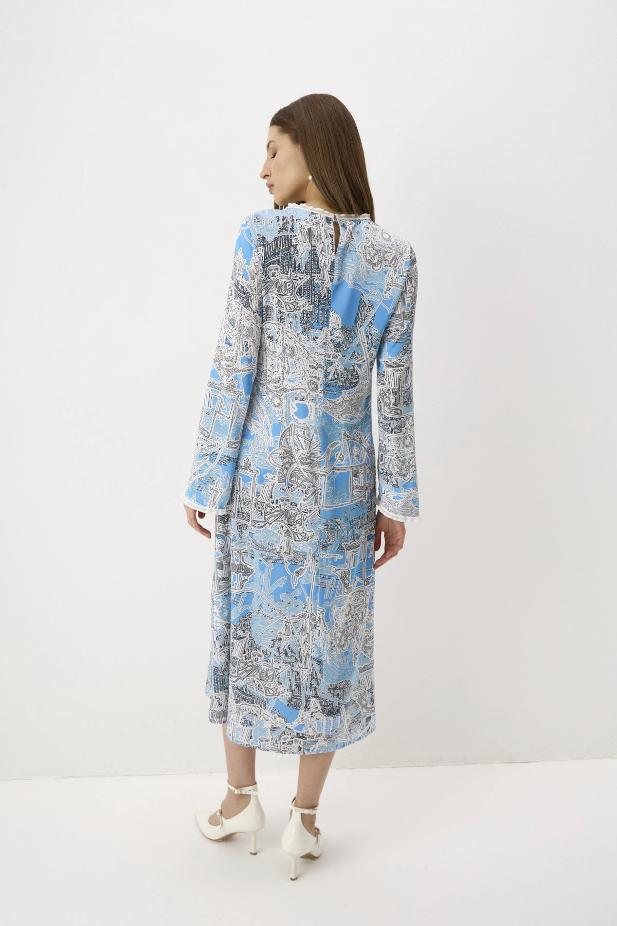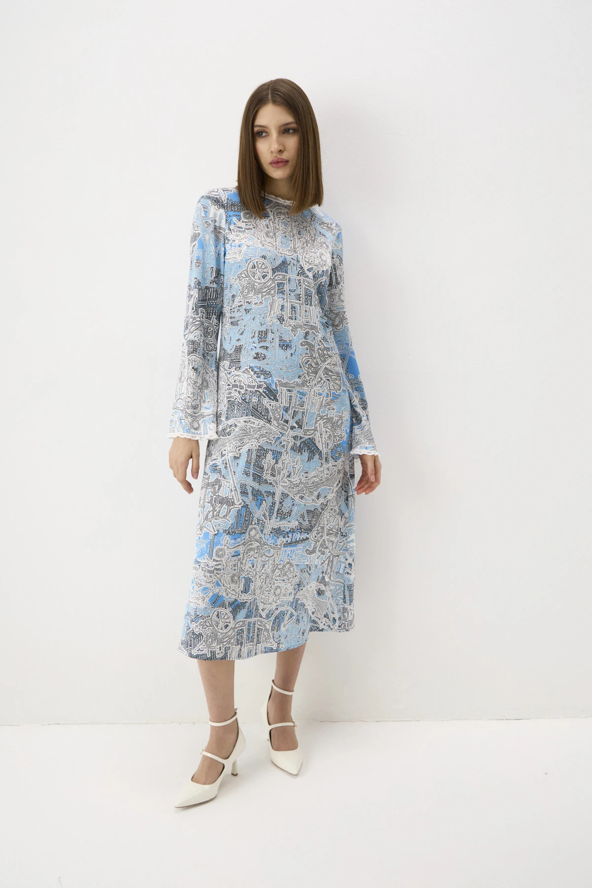 Платье А-силуэта длины миди с лёгким прилеганием в области талии. Длинные рукава с клешением – трендовая деталь в лаконичном исполнении бренда. Круглый вырез горловины и низ рукавов оформлены нежной трикотажной рюшей. Авторский принт посвящен прогулке по великолепному Петербургу.