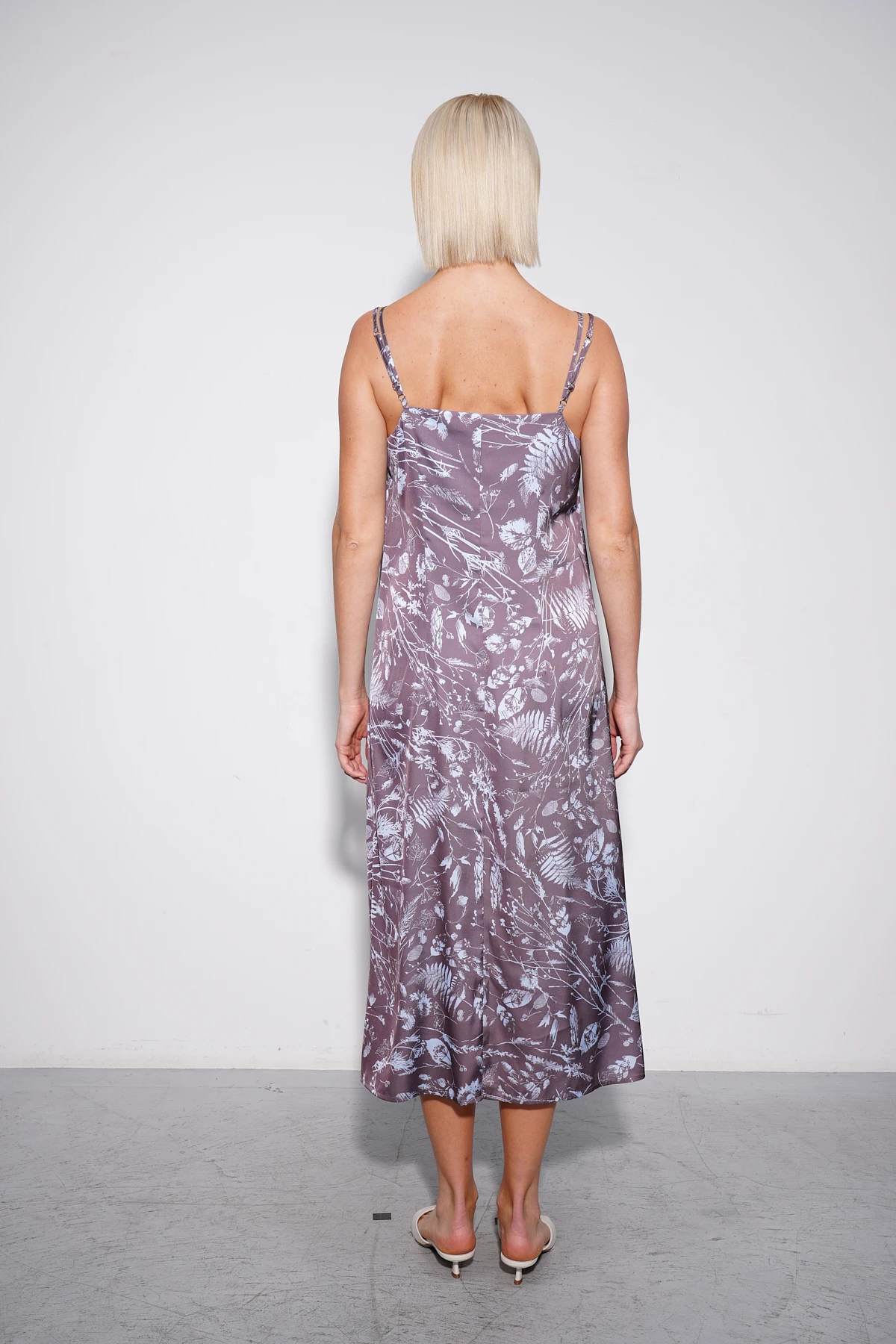 Платье из приятной на ощупь атласной ткани с авторским принтом на фоне глубокого шоколадного цвета —элегантная и женственная модель. Платье-комбинация А-силуэта длиной миди на тонких двойных регулируемых бретелях создает легкий и грациозный силуэт. V-образный вырез и нагрудные вытачки подчеркивают форму, придавая образу утонченность.