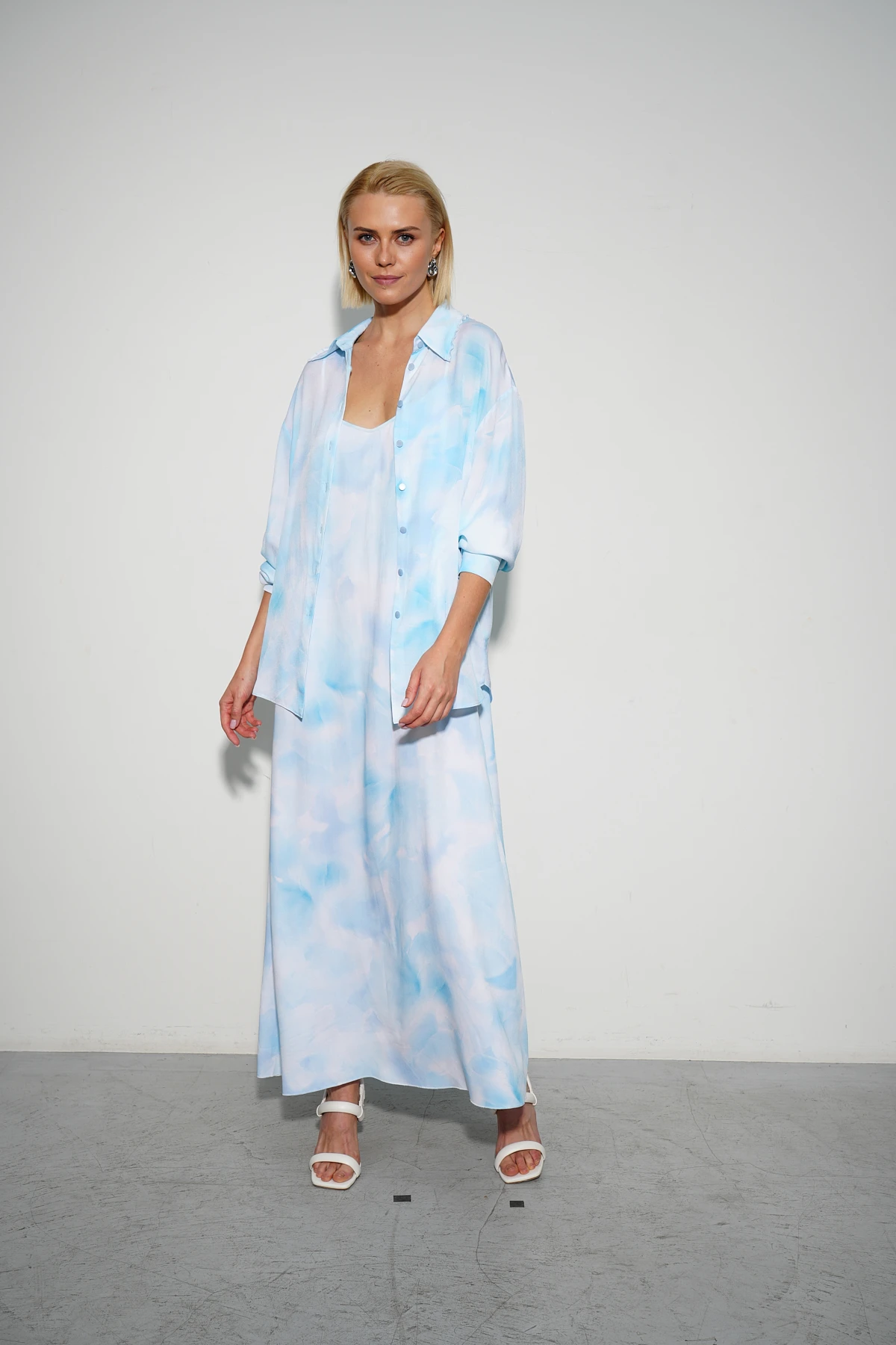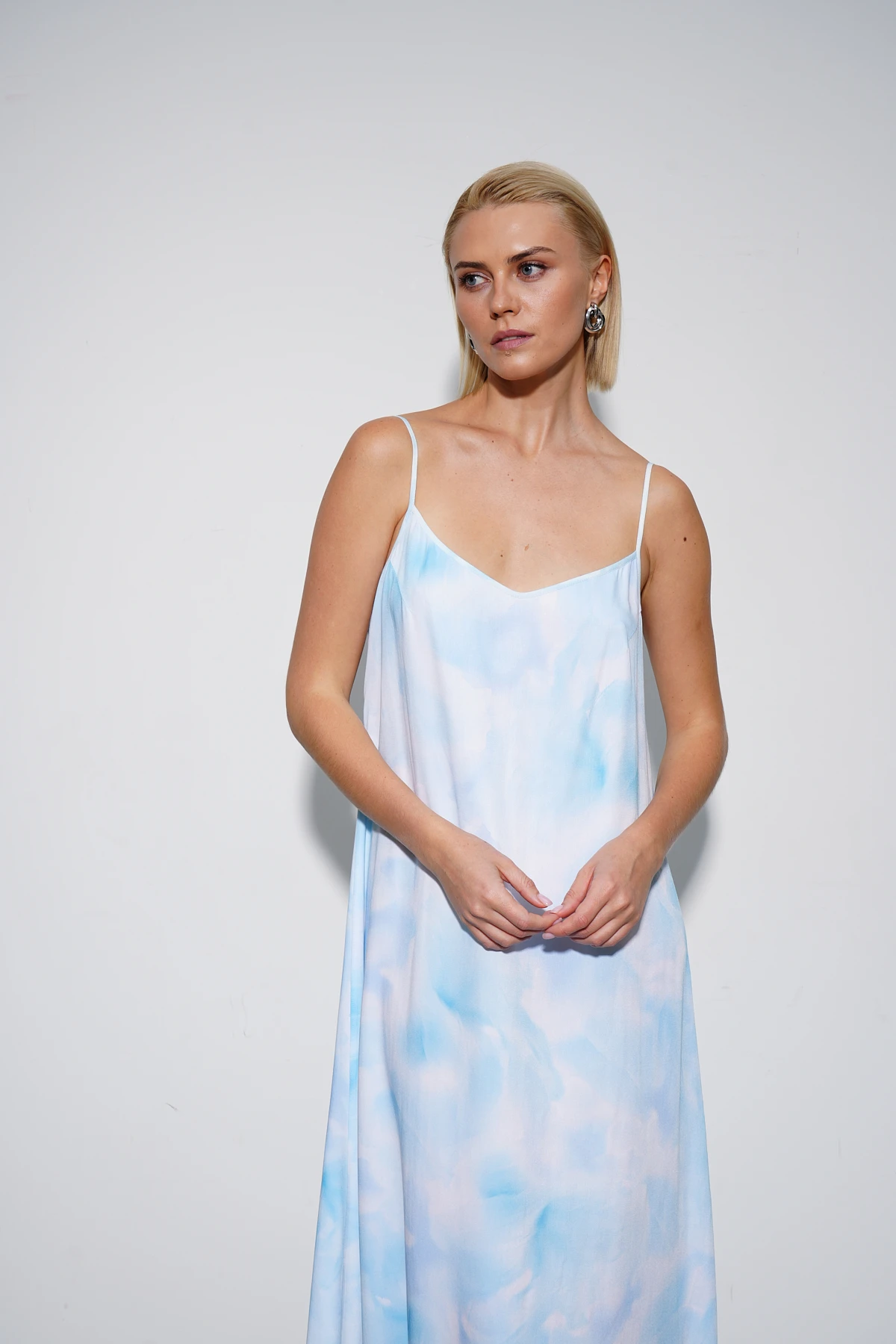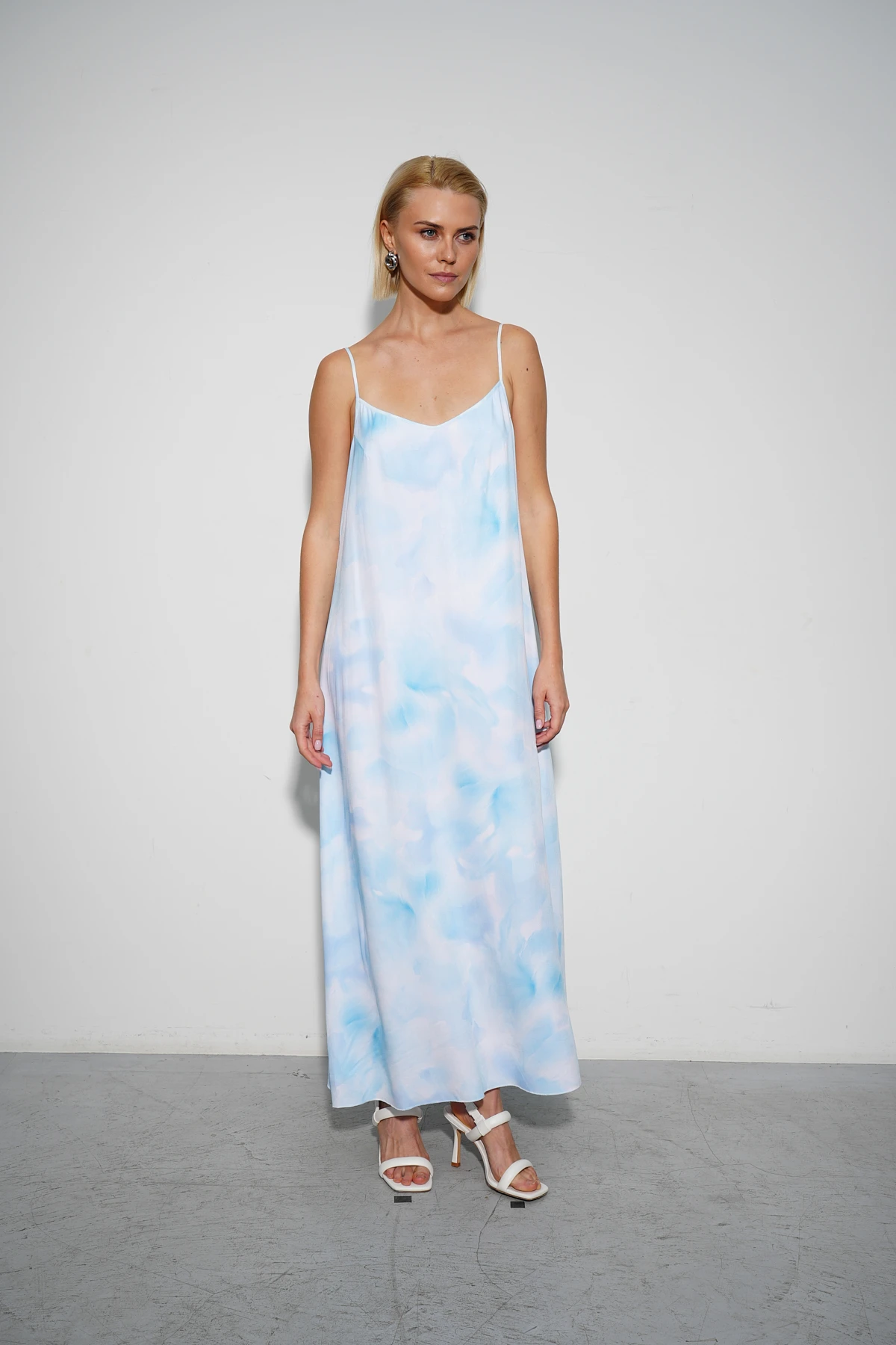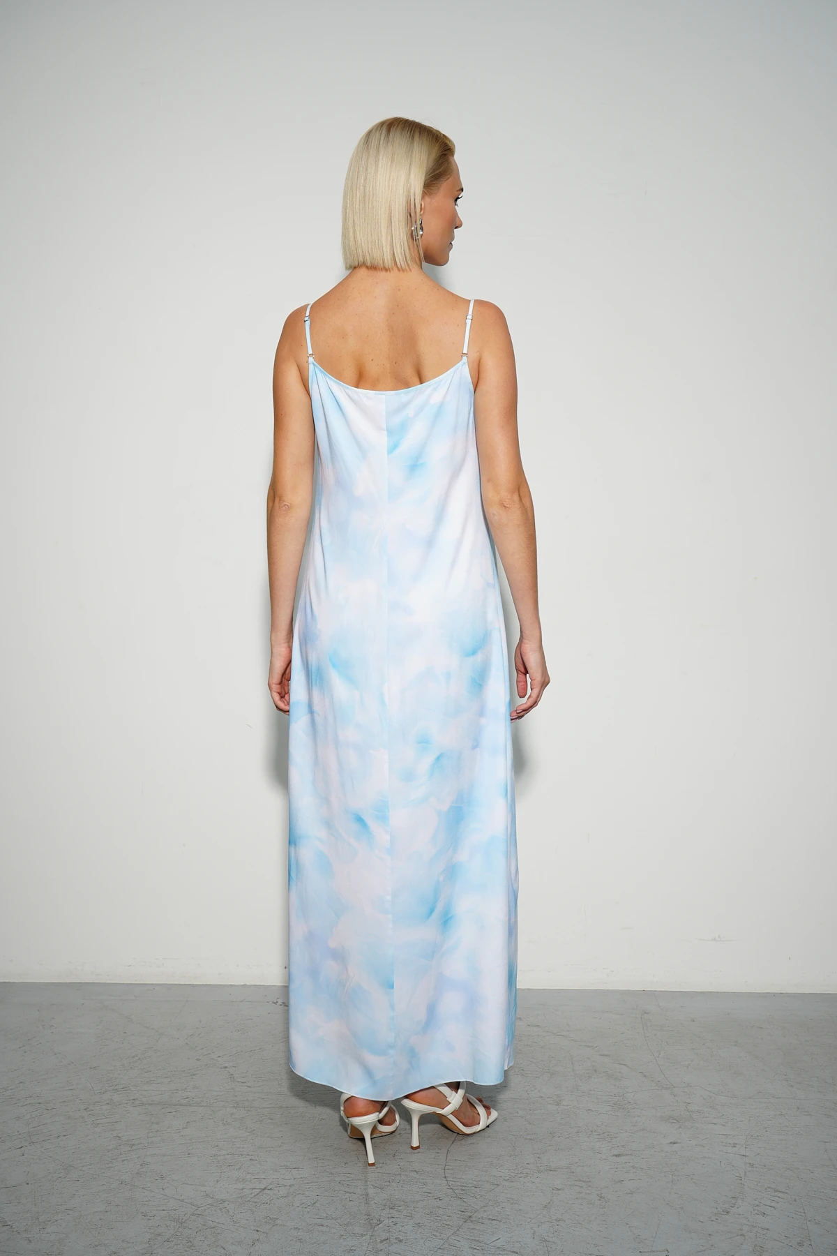Платье из мягкой и тактильно приятной плательной вискозы с абстрактным принтом «Мелодия моря» в небесных оттенках создаёт нежный и изысканный образ. А-силуэт длины макси на тонких регулируемых бретелях подчёркивает лёгкость и женственность. Нагрудные вытачки обеспечивают безупречную посадку. Аккуратная фурнитура из белого металла на бретелях завершает изящный и утончённый дизайн. Платье идеально для летних прогулок или вечерних выходов.