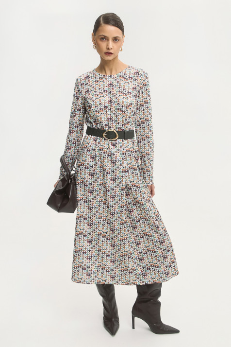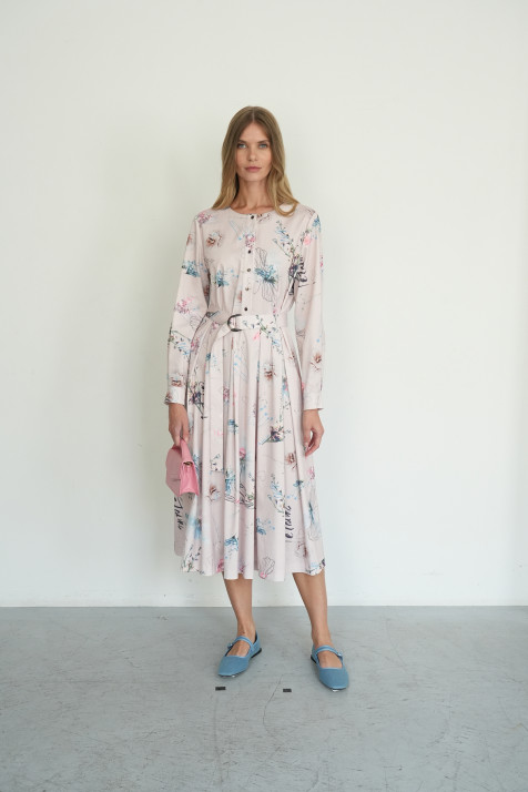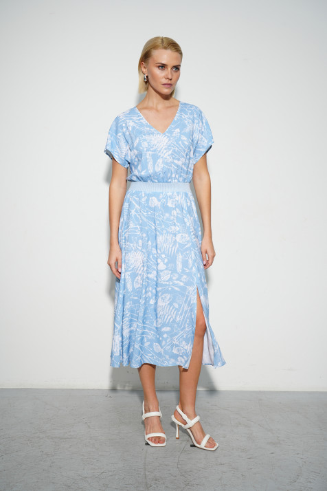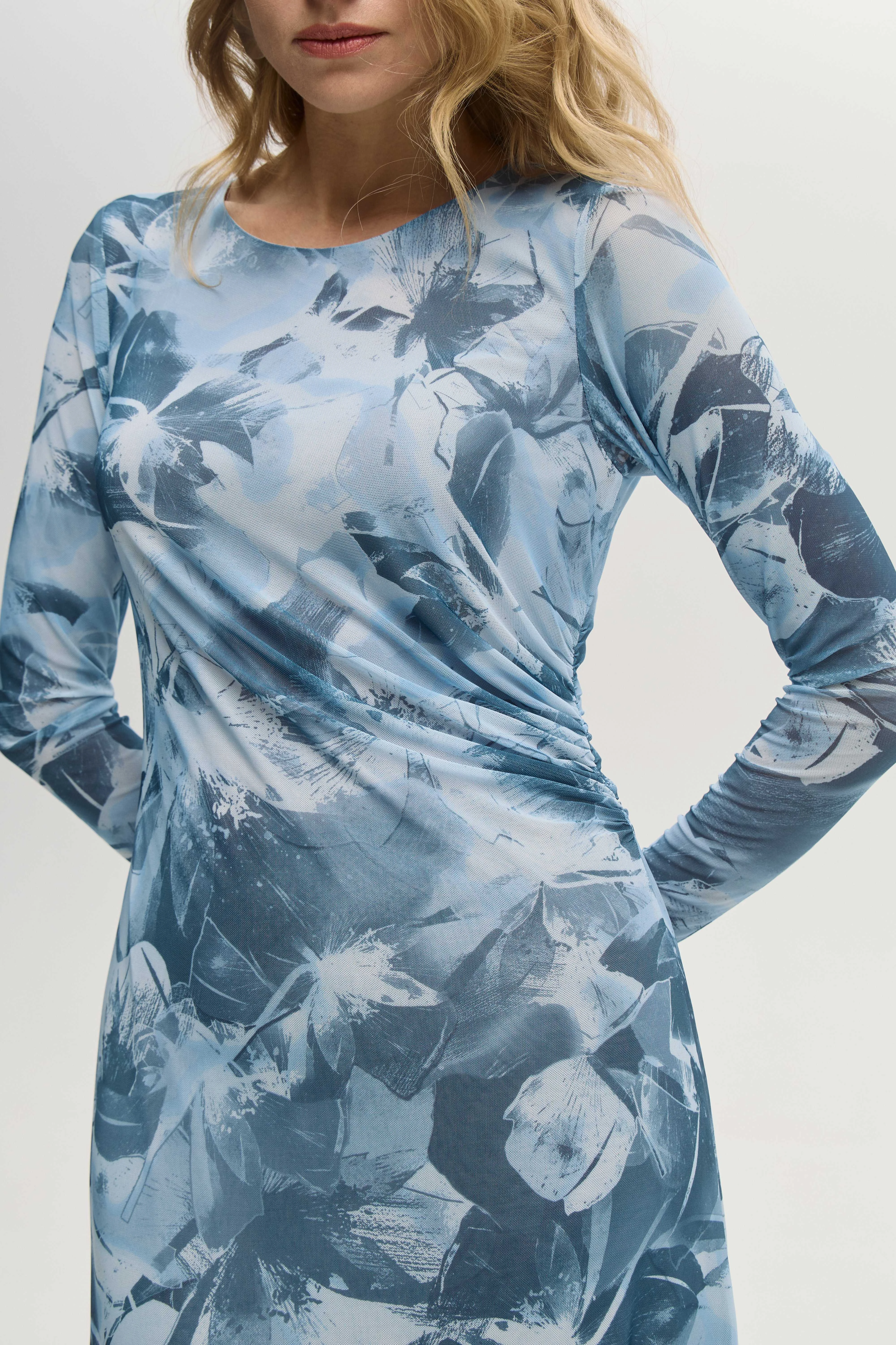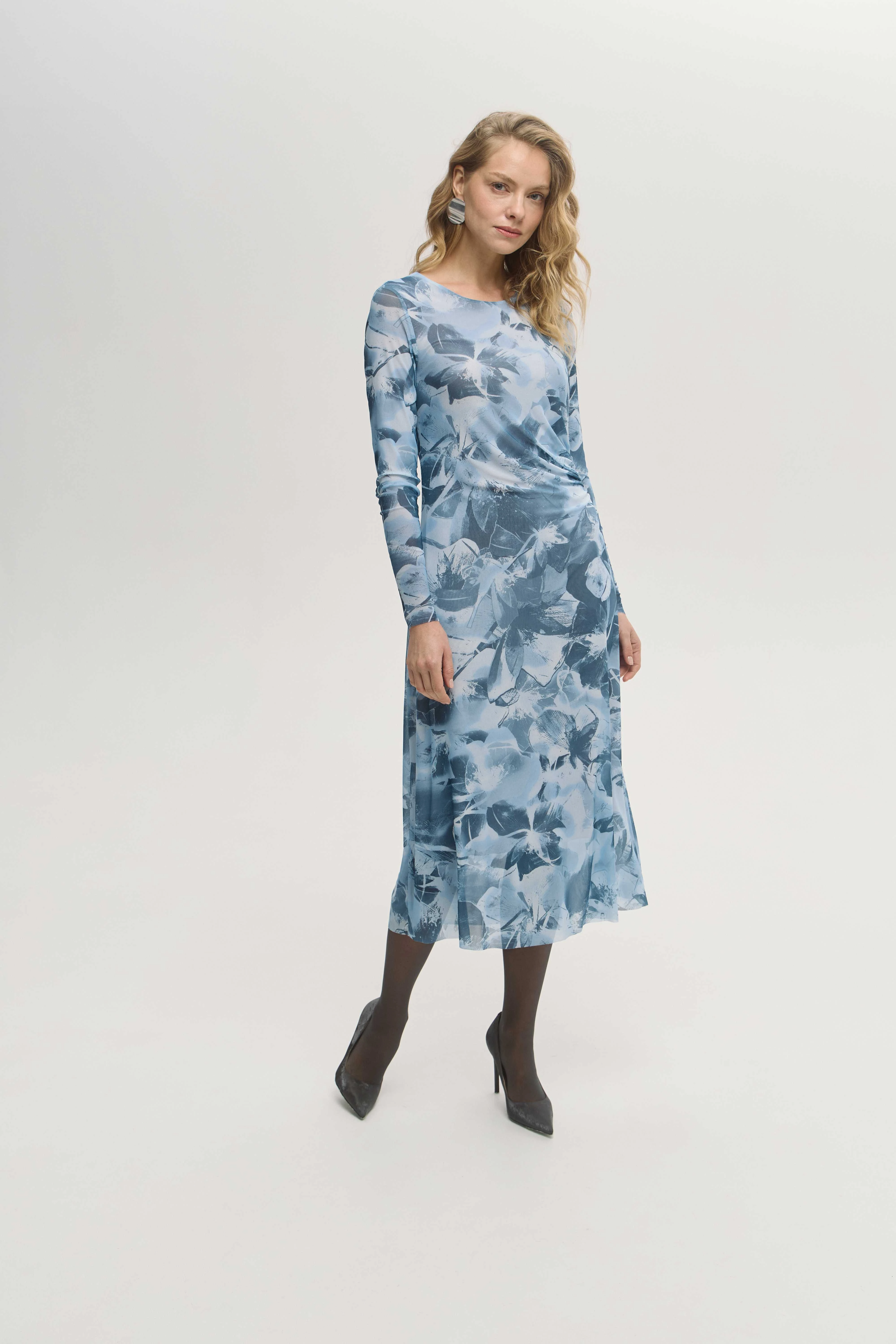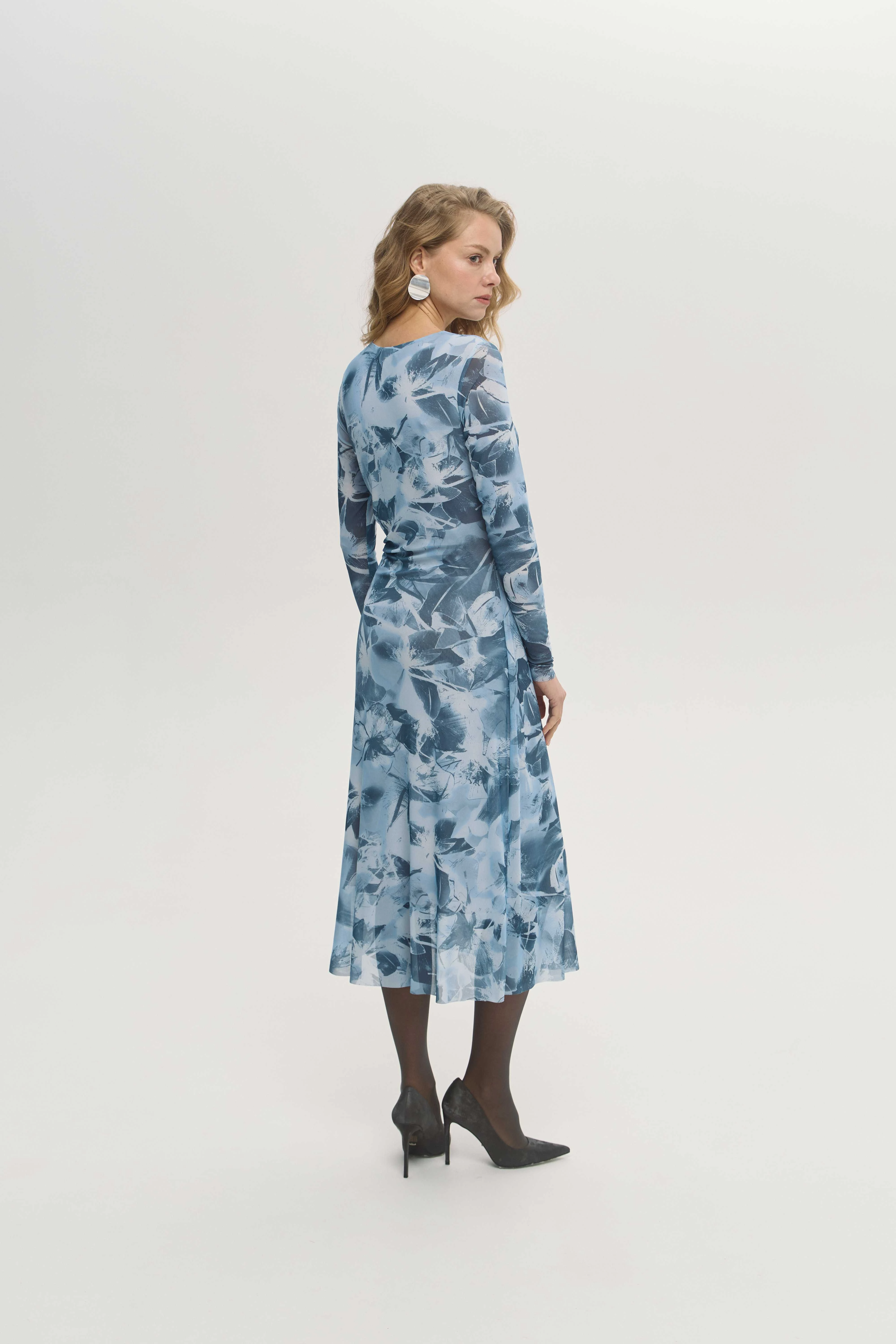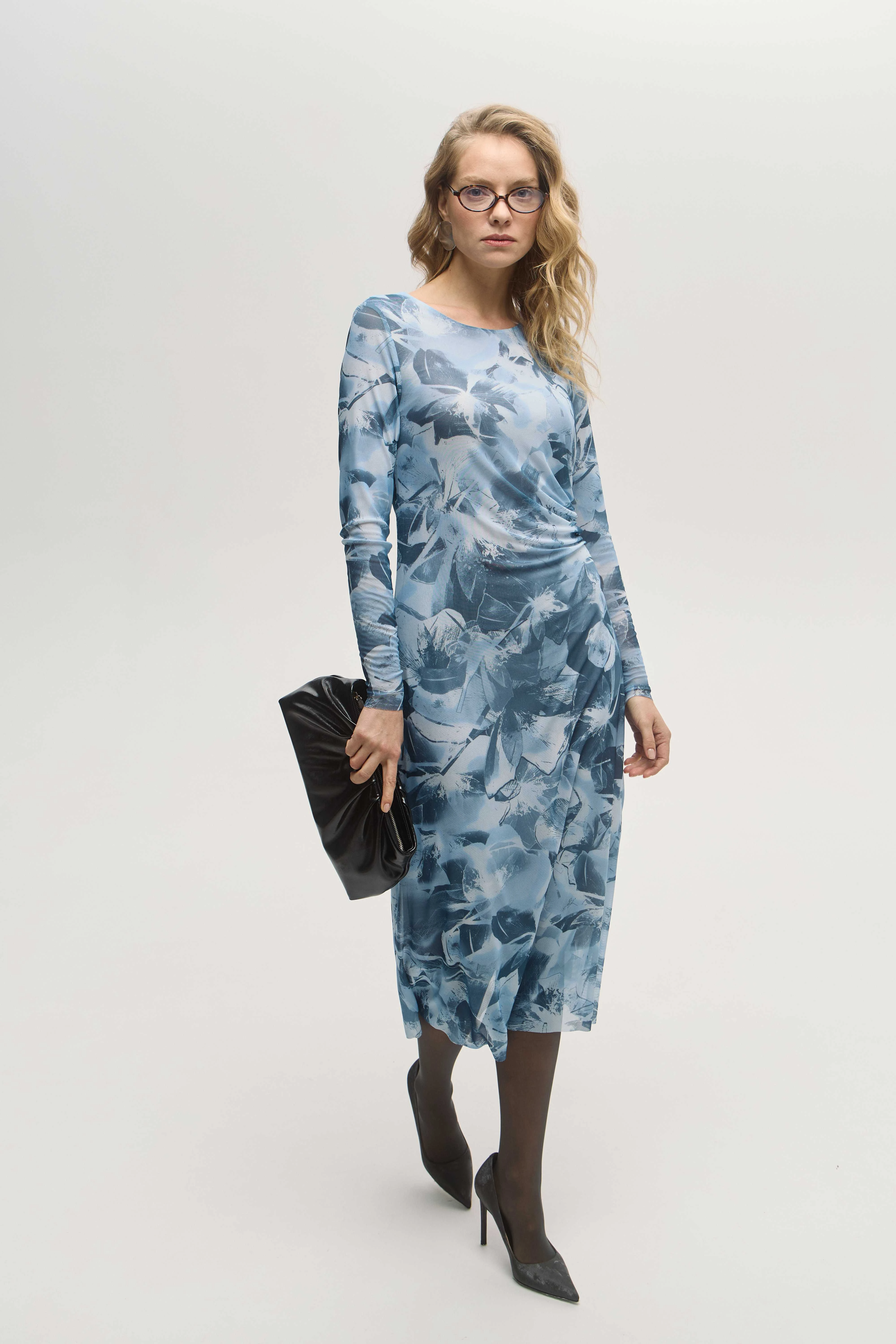 Приталенный силуэт с деликатной драпировкой подчёркивает женственность и плавные линии фигуры. Длина миди обеспечивает комфорт и универсальность в сочетаниях. Эластичная ткань тактильно приятна и не сковывает движения. Авторский принт придаёт уникальность. Оттенки от глубокого тёмно-синего до небесно-голубого придают контрастность и глубину образу.