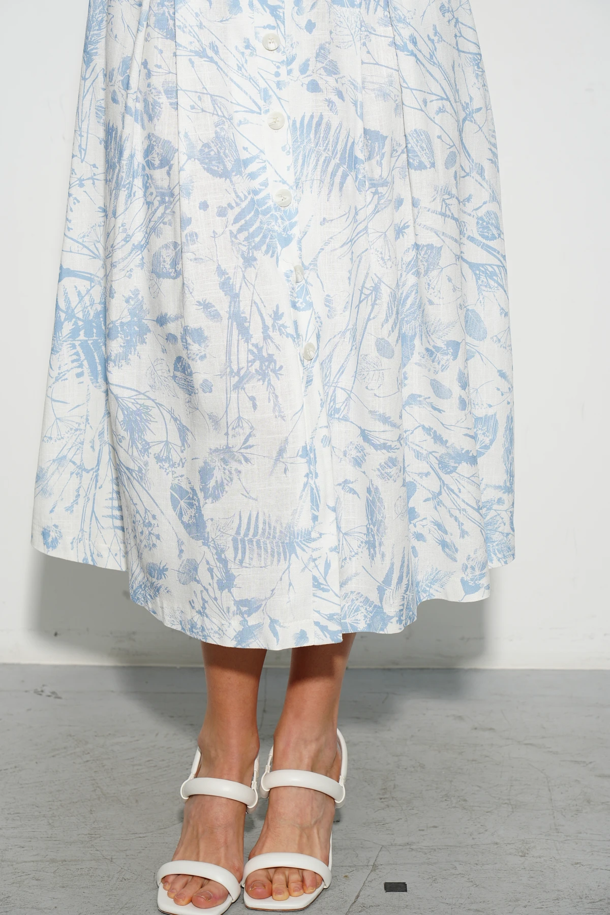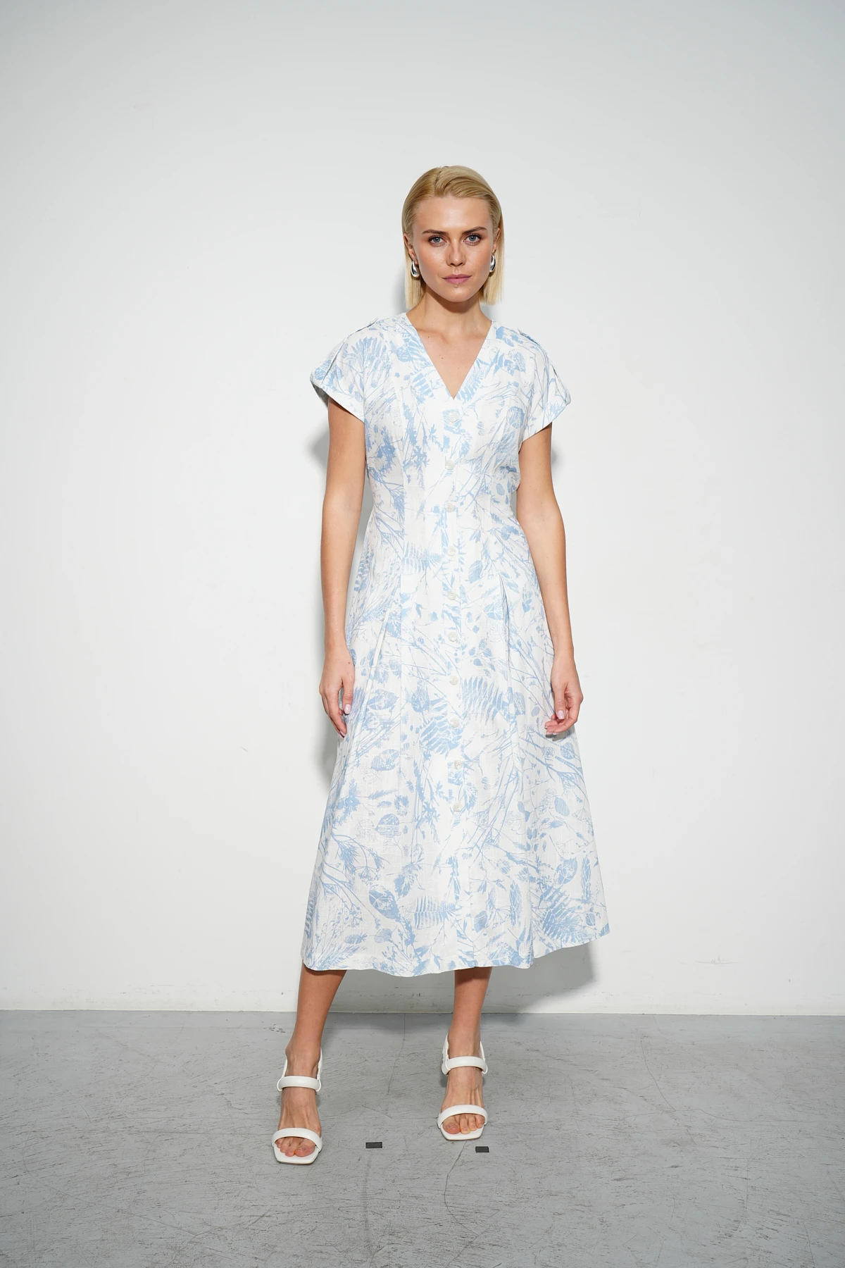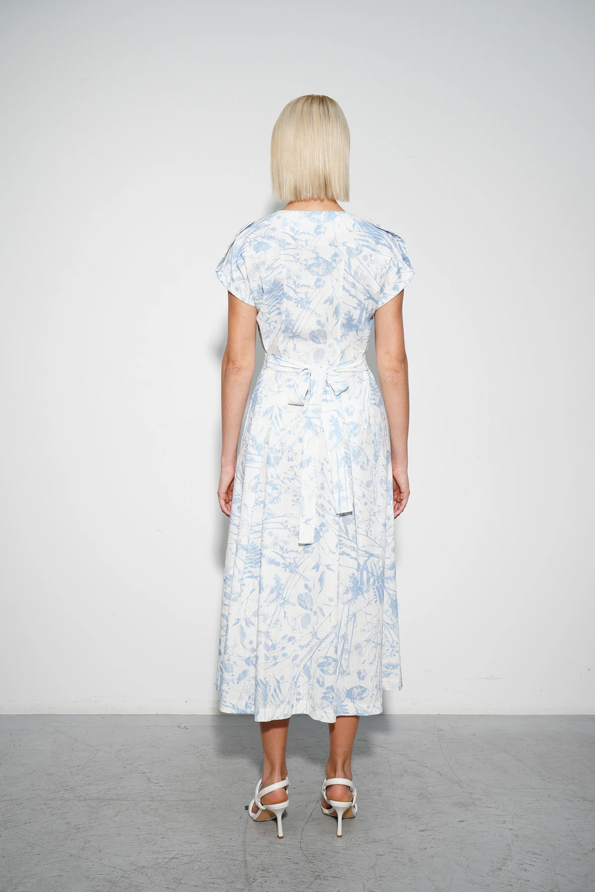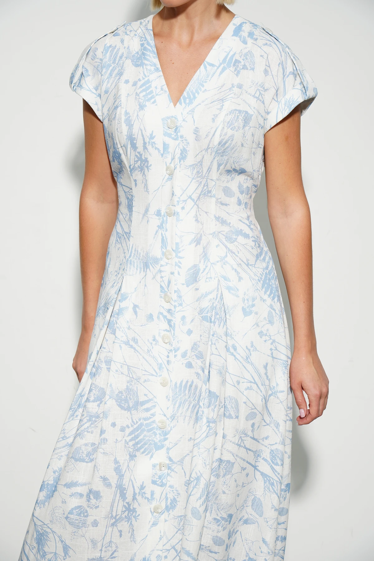 Распашное платье из смесовой ткани на основе гигроскопичного района с добавлением фактурного льна с авторским принтом «Льняной гербарий» на фоне молочного оттенка. А-силуэт сформирован за счет встречных складок по переду и спинке, изящно раскрывающихся при движении. V-образный вырез горловины переходит в застёжку-планку. По спинке – кокетка. В области талии в боковых швах втачаны ленты-пояс, позволяющие варьировать образы, завязывая их как спереди, так и сзади. Рукава цельновыкроенные малой длины с отворотами и погонами. В боковых швах – прорезные карманы. Застёжка на светлые роговые пуговицы.