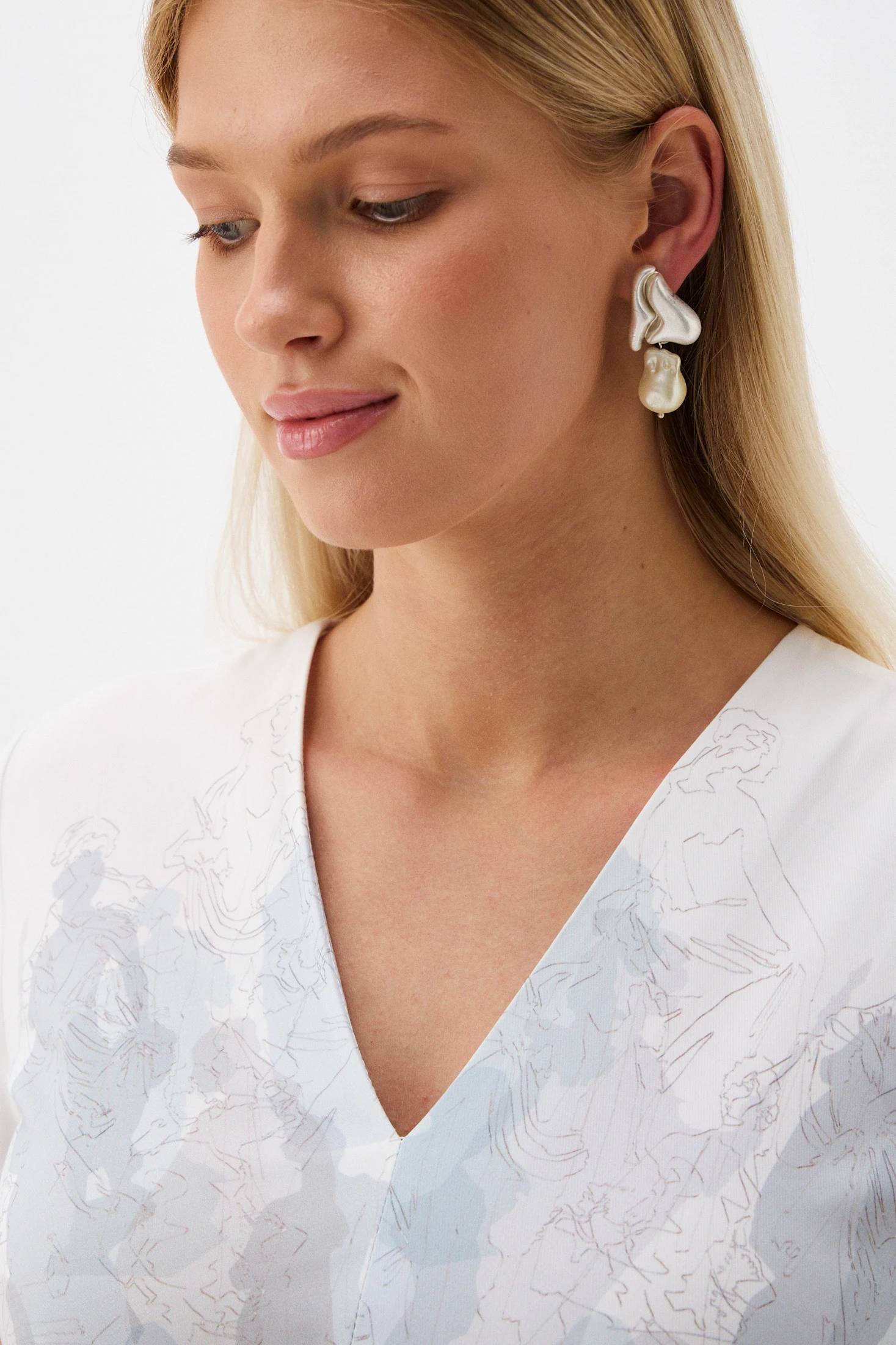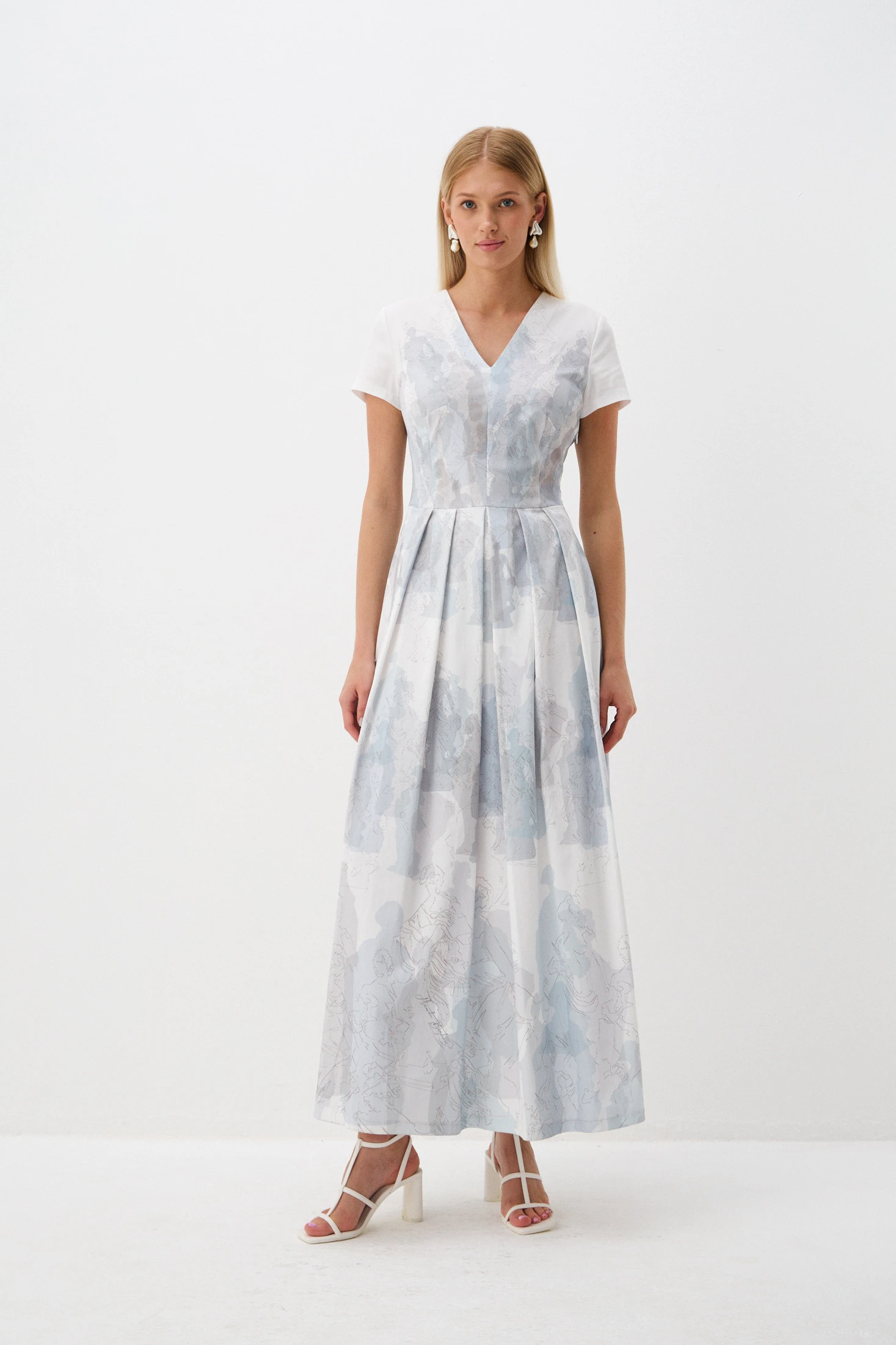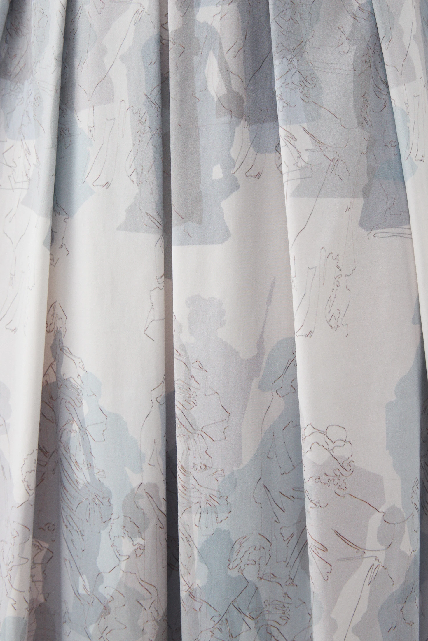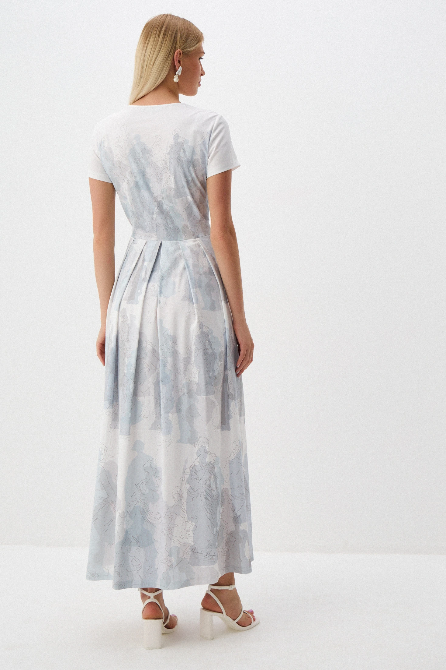 Главные акценты принта «Музы Петербурга» – ритмично расположенные очертания скульптур Летнего сада, которые, словно ожившие цветные тени, беседуют между собой о вечном. В основе принта – жемчужные и серо-голубые оттенки. Обратите внимание, как на переднем плане линеарно продублированы силуэты, что придаёт особую свето-тональную целостность композиции принта.