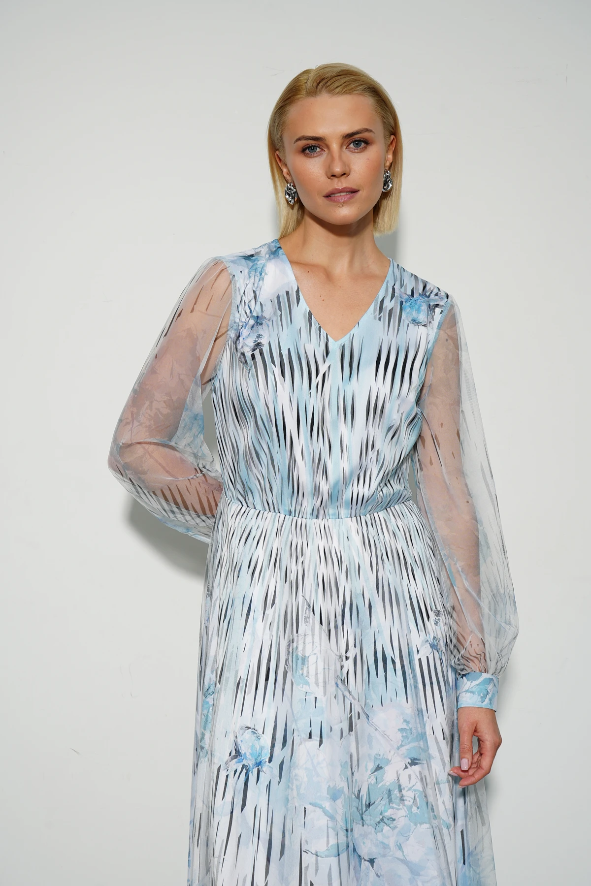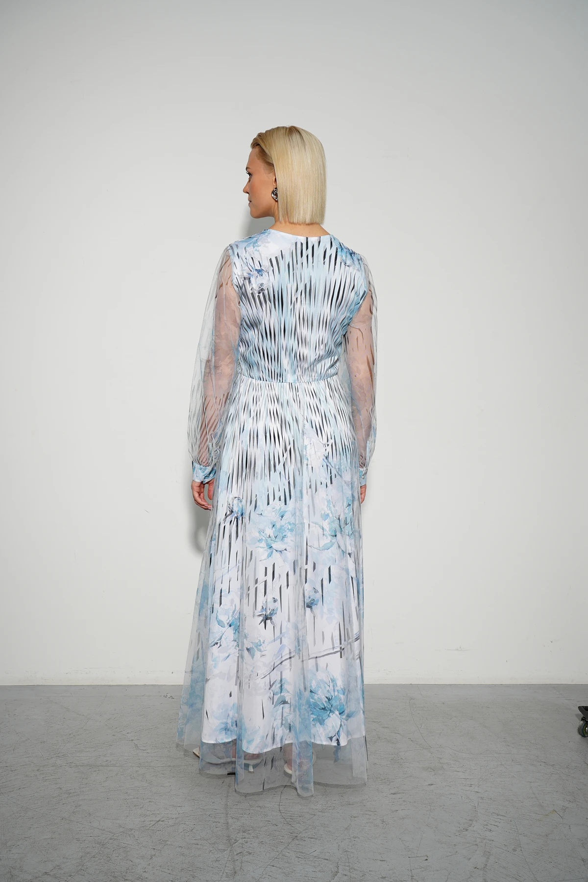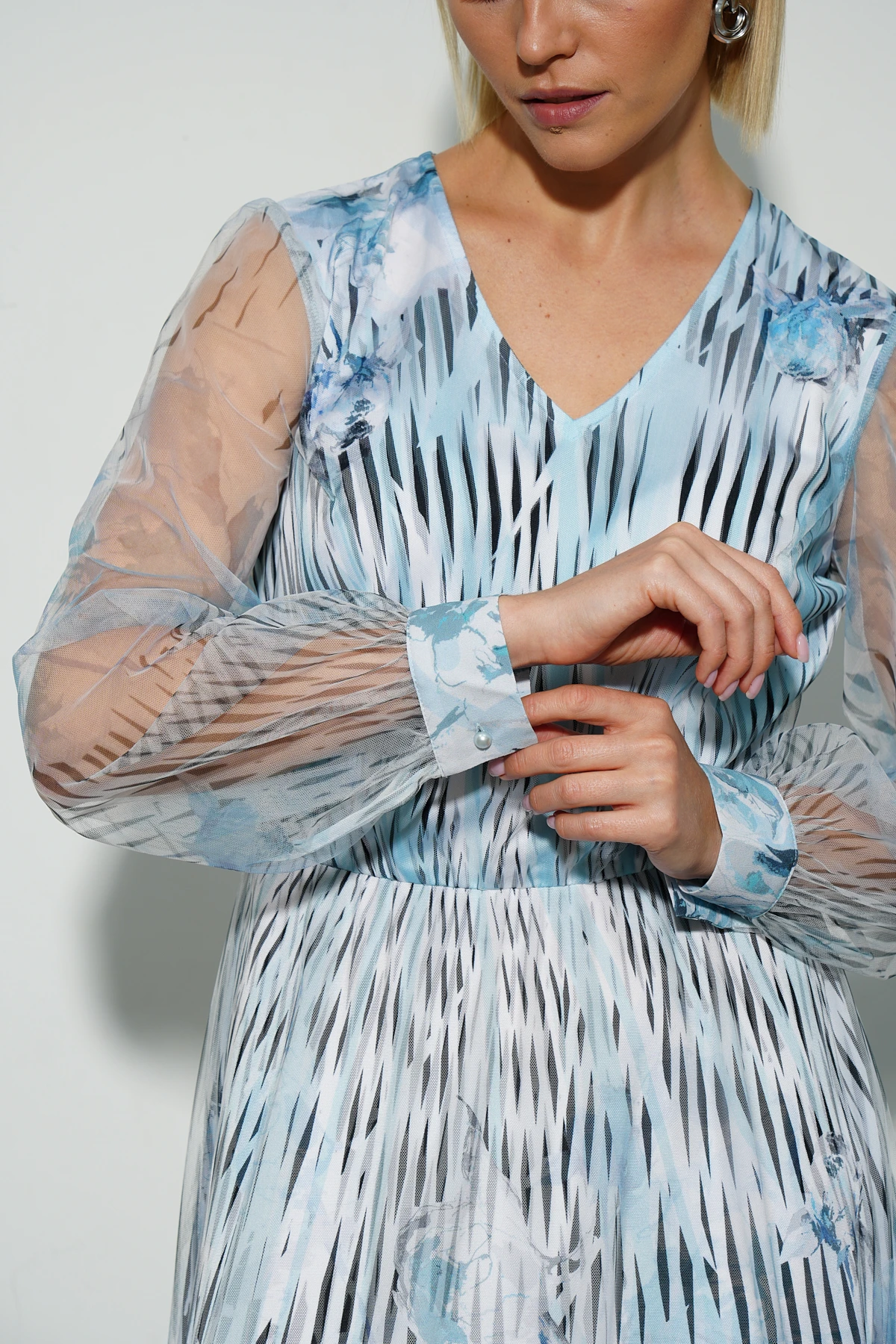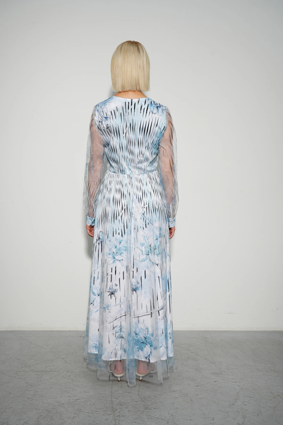 Нарядное платье из воздушной сетки в сочетании с тактильно приятной тканью с сатиновым блеском создаёт лёгкость и элегантность. Авторский флорально-геометричный принт в небесных и ахроматических оттенках придаёт модели изысканный и современный вид.