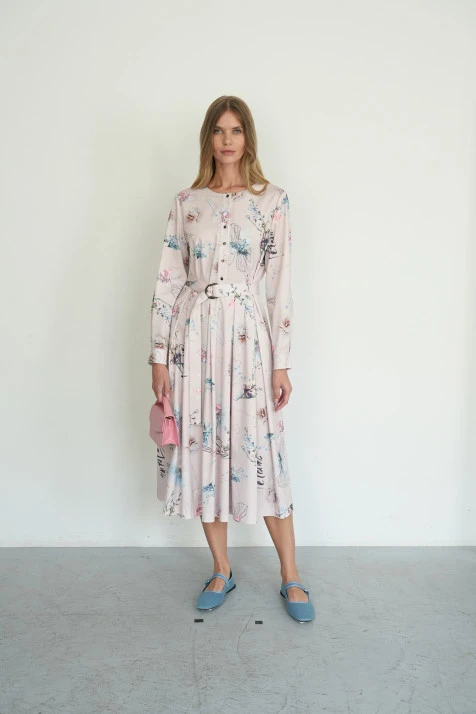 Отрезной крой по линии талии на эластичной ленте подчёркивает фигуру, а V-образный вырез горловины изящно акцентирует зону декольте. Нагрудные вытачки обеспечивают идеальную посадку по лифу. Рукава полной длины на манжетах с пуговицами-жемчужинами добавляют модели утончённости.