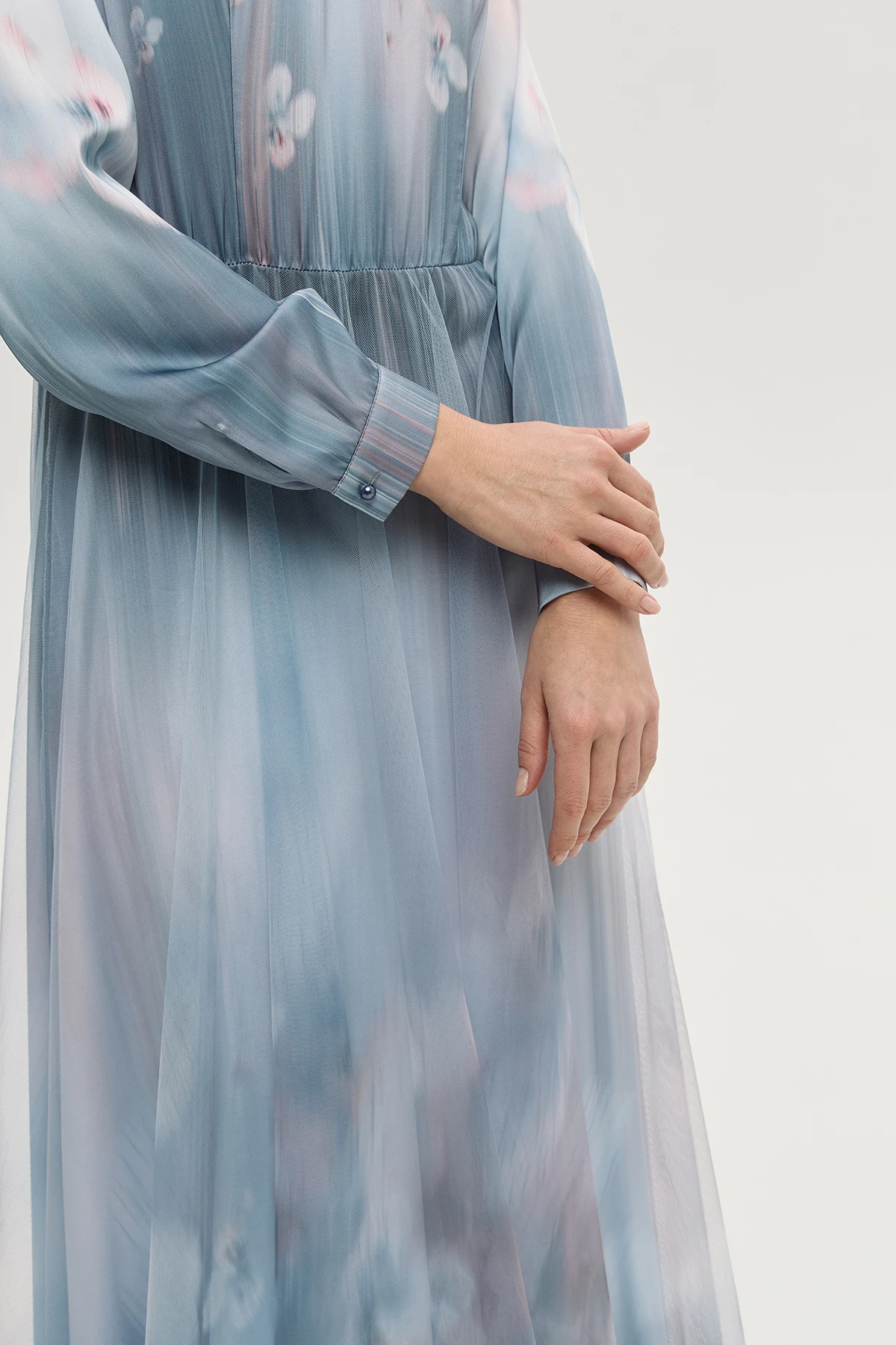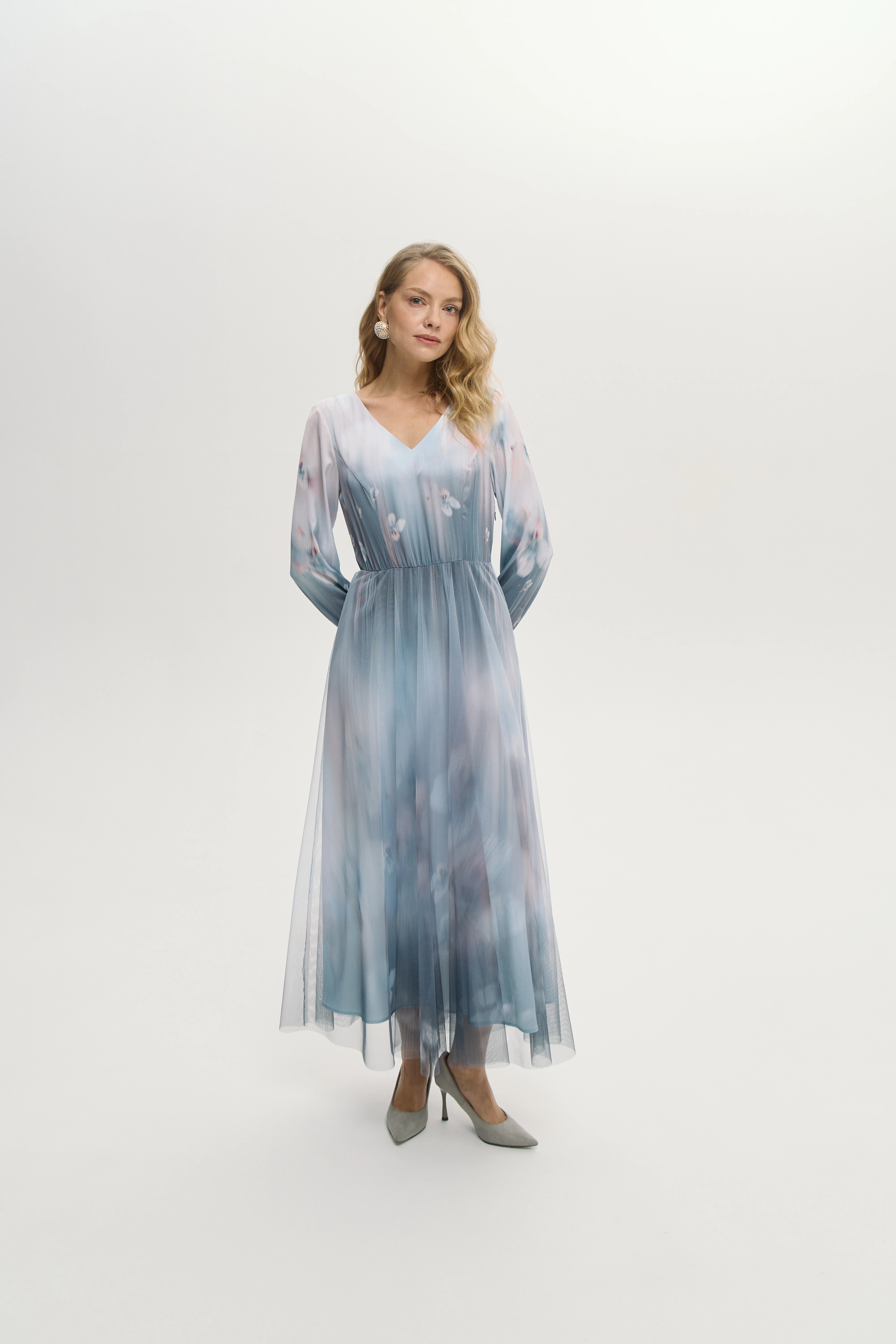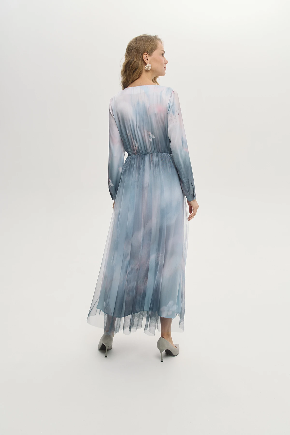 Отрезной крой платья подчёркивает линию талии и создаёт плавный уточнённый силуэт. V-образный вырез открывает линию шеи и ключиц и добавляет образу лёгкости и женственности. Полупрозрачная юбка-сетка создаёт эффектную многослойность. Акварельная растяжка в пастельных тонах придаёт платью поэтичный и романтичный характер. Платье «Небесные грёзы» — воплощение мечты о лёгкости, изяществе и безупречном вкусе.