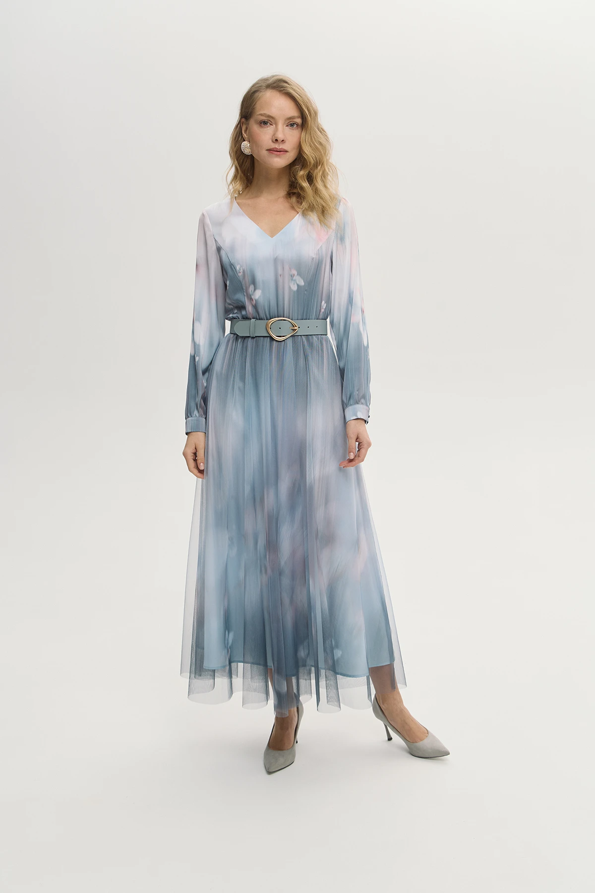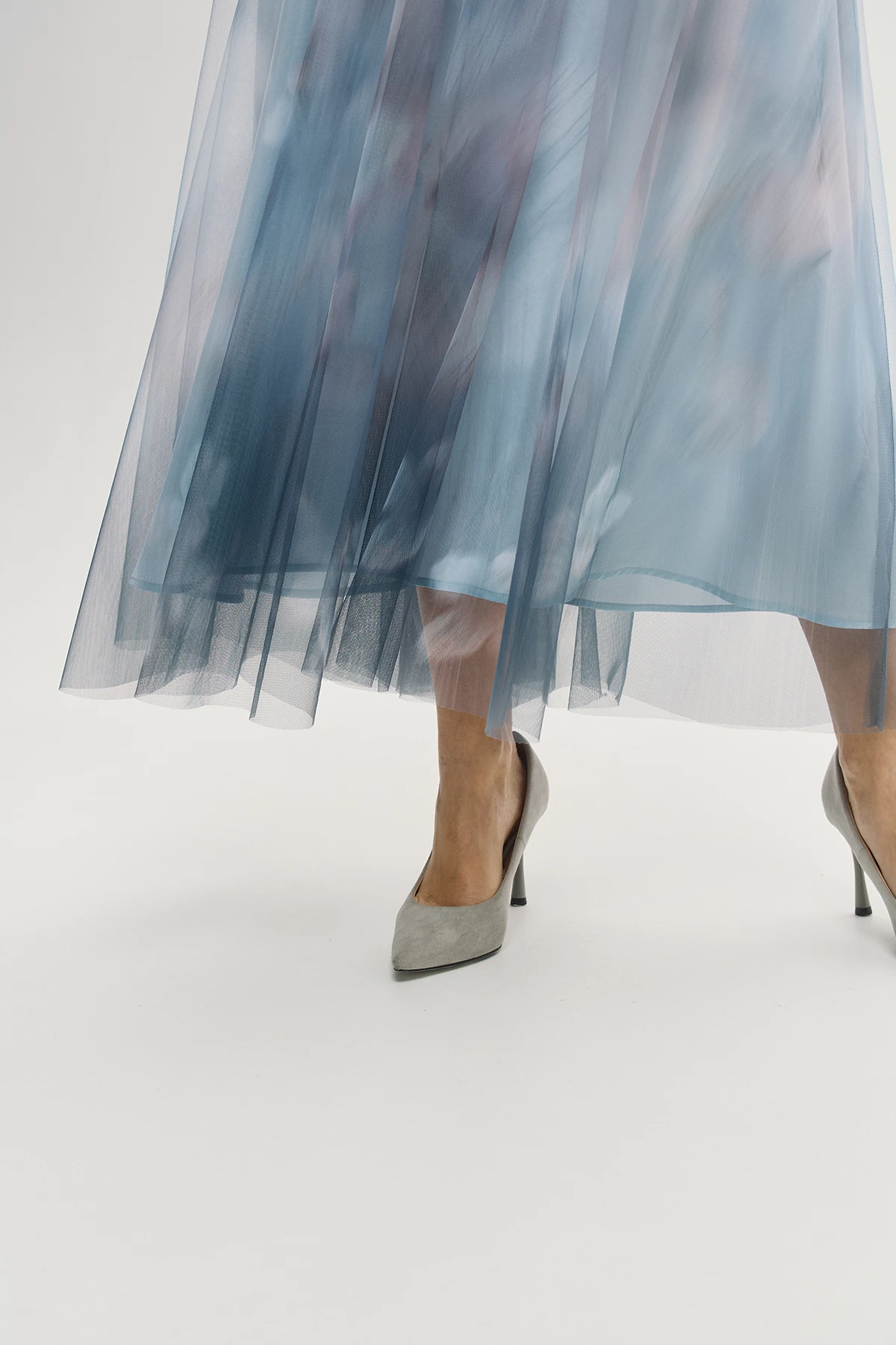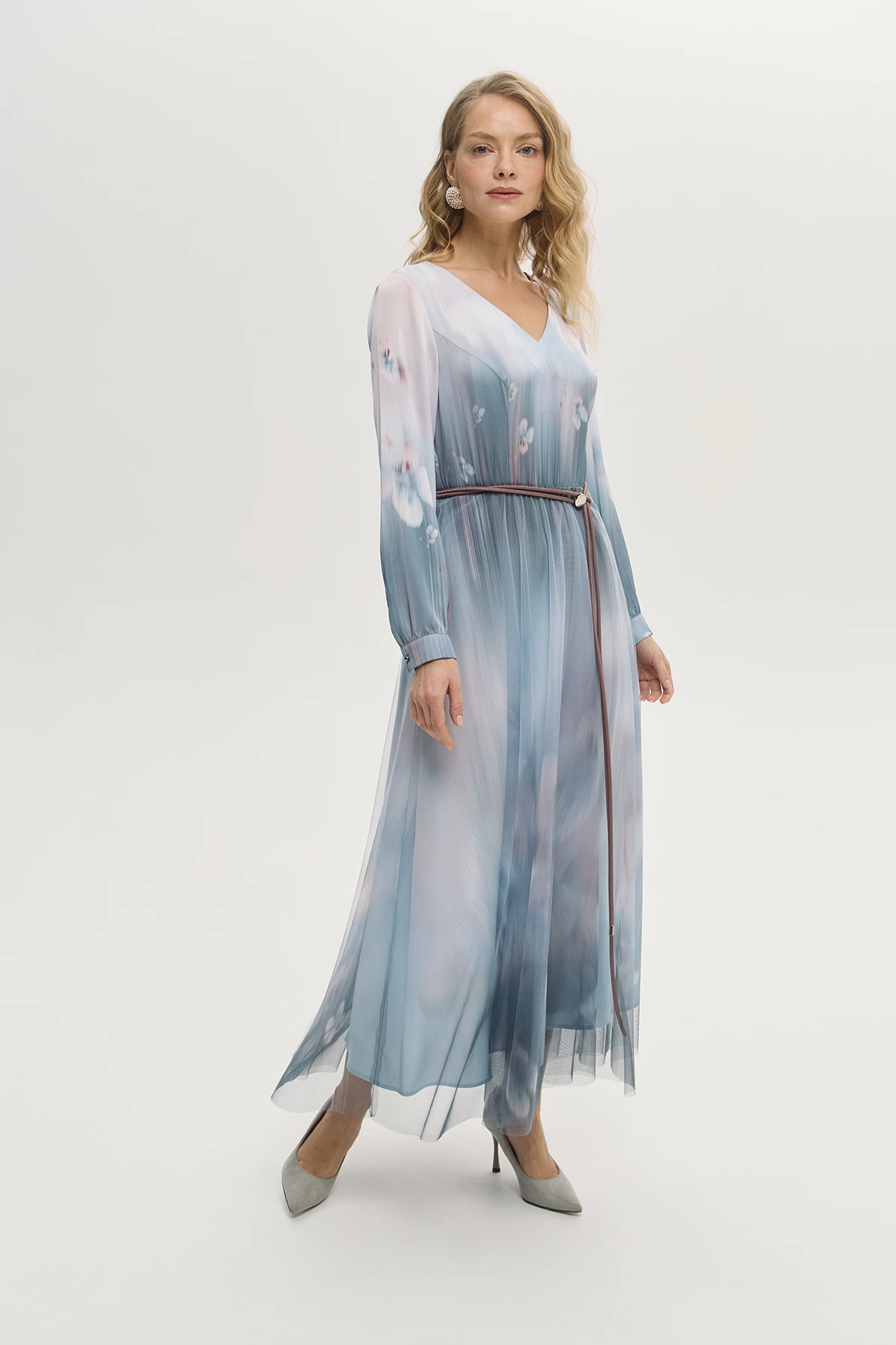 Отрезной крой платья подчёркивает линию талии и создаёт плавный уточнённый силуэт. V-образный вырез открывает линию шеи и ключиц и добавляет образу лёгкости и женственности. Полупрозрачная юбка-сетка создаёт эффектную многослойность. Акварельная растяжка в пастельных тонах придаёт платью поэтичный и романтичный характер. Платье «Небесные грёзы» — воплощение мечты о лёгкости, изяществе и безупречном вкусе.