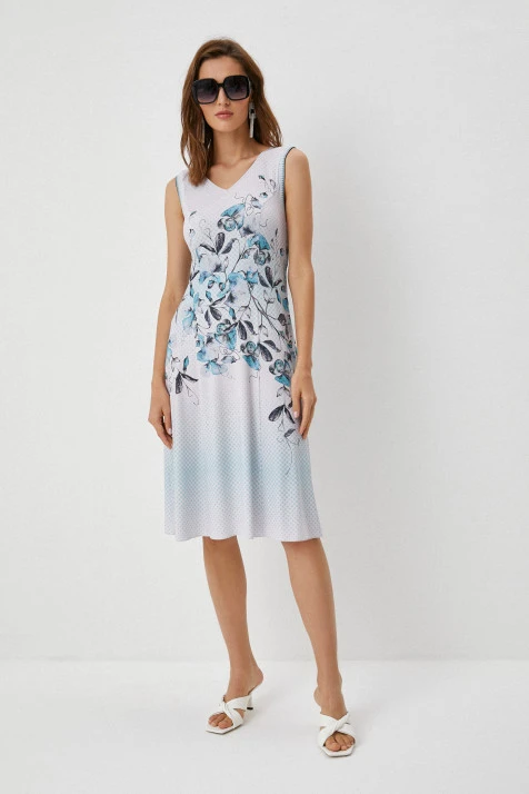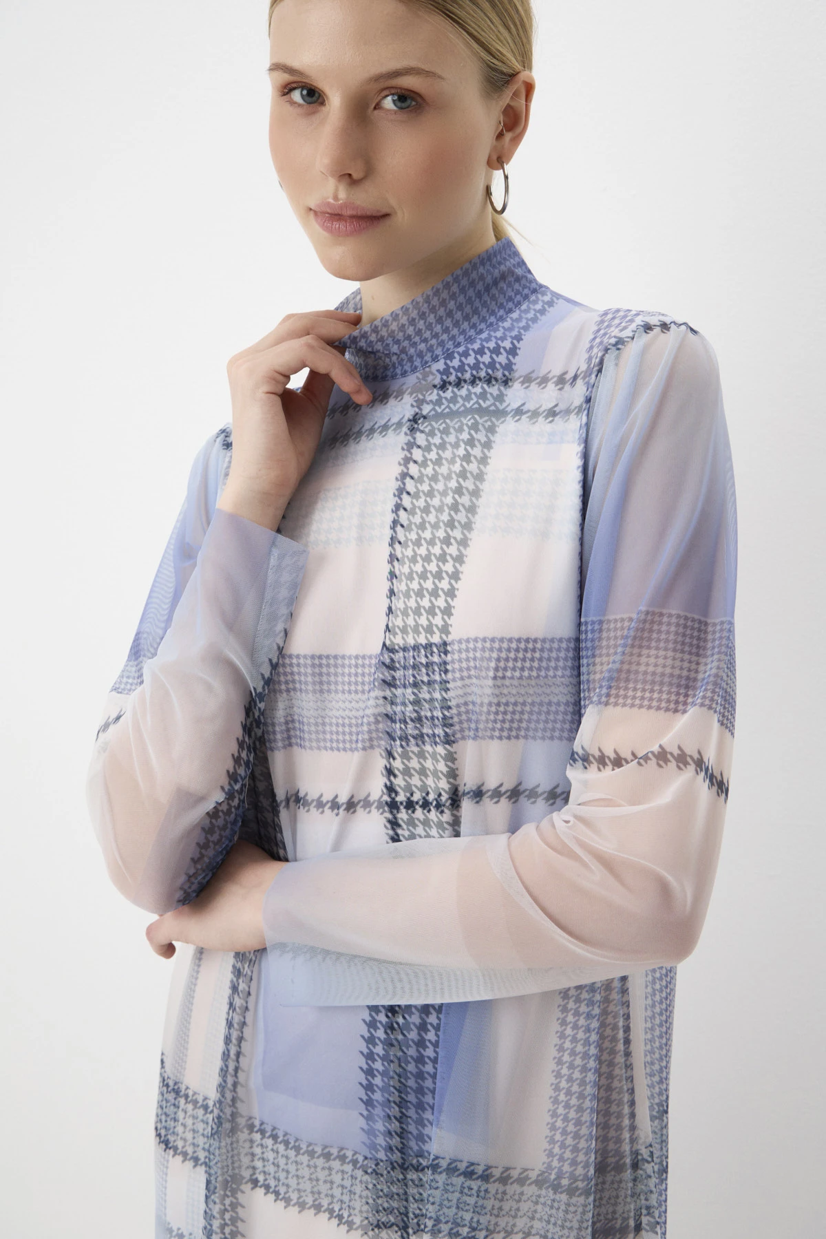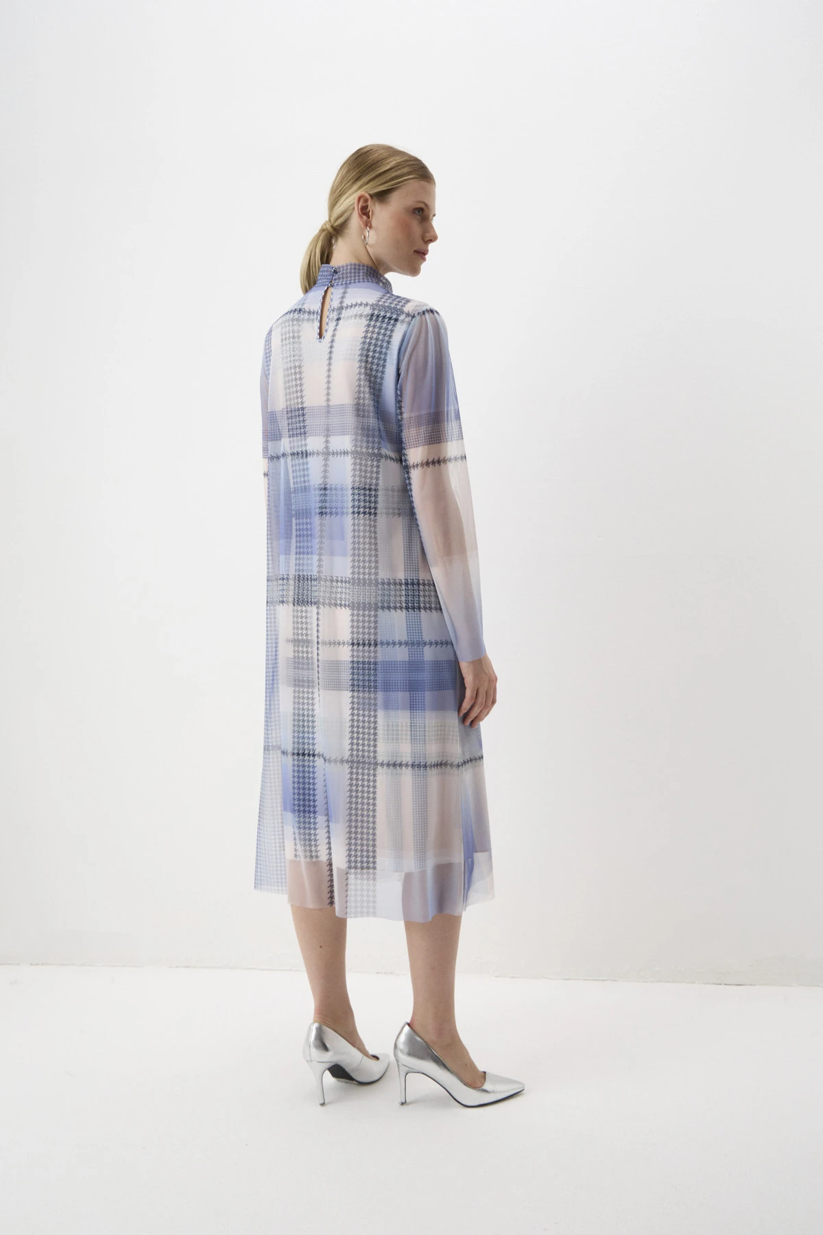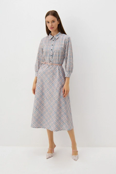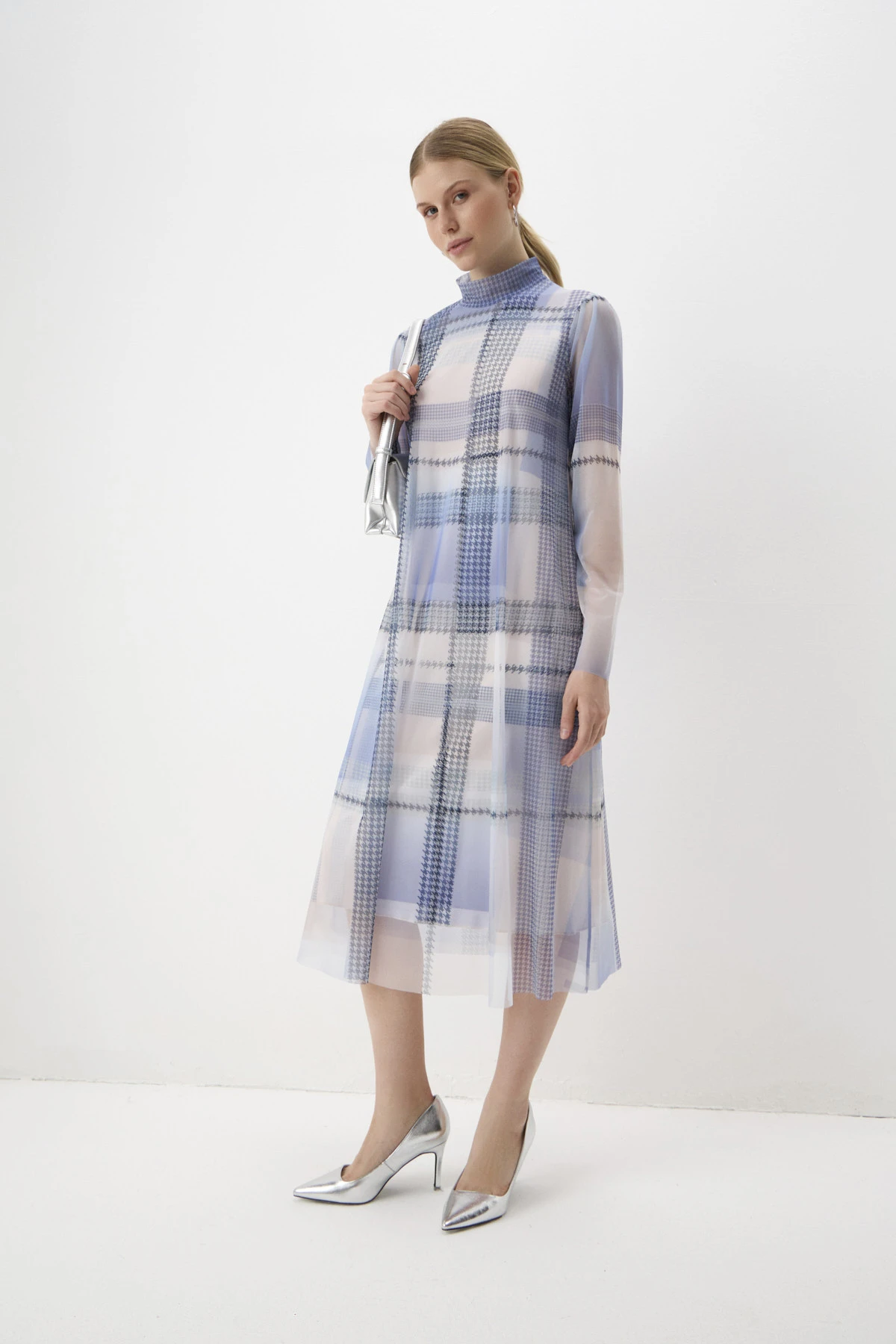 Двухслойное платье А-силуэта длины миди выполнено в сочетании комфортных фактур: мягкой сетки в верхнем слое и тактильно приятного эластичного бифлекса – в нижнем. На оба типа ткани нанесён геометричный принт – квадраты с рамками «пье-де-пуль» в контрастных пудровых и синих оттенках. Разные длины верхнего и нижнего слоёв создают оригинальный и актуальный эффект многослойности. По окату плеча небольшие складки добавляют женственности силуэту. Воротник-стойка по спинке переходит в вырез-каплю и застёгивается на две пуговицы-жемчужины.