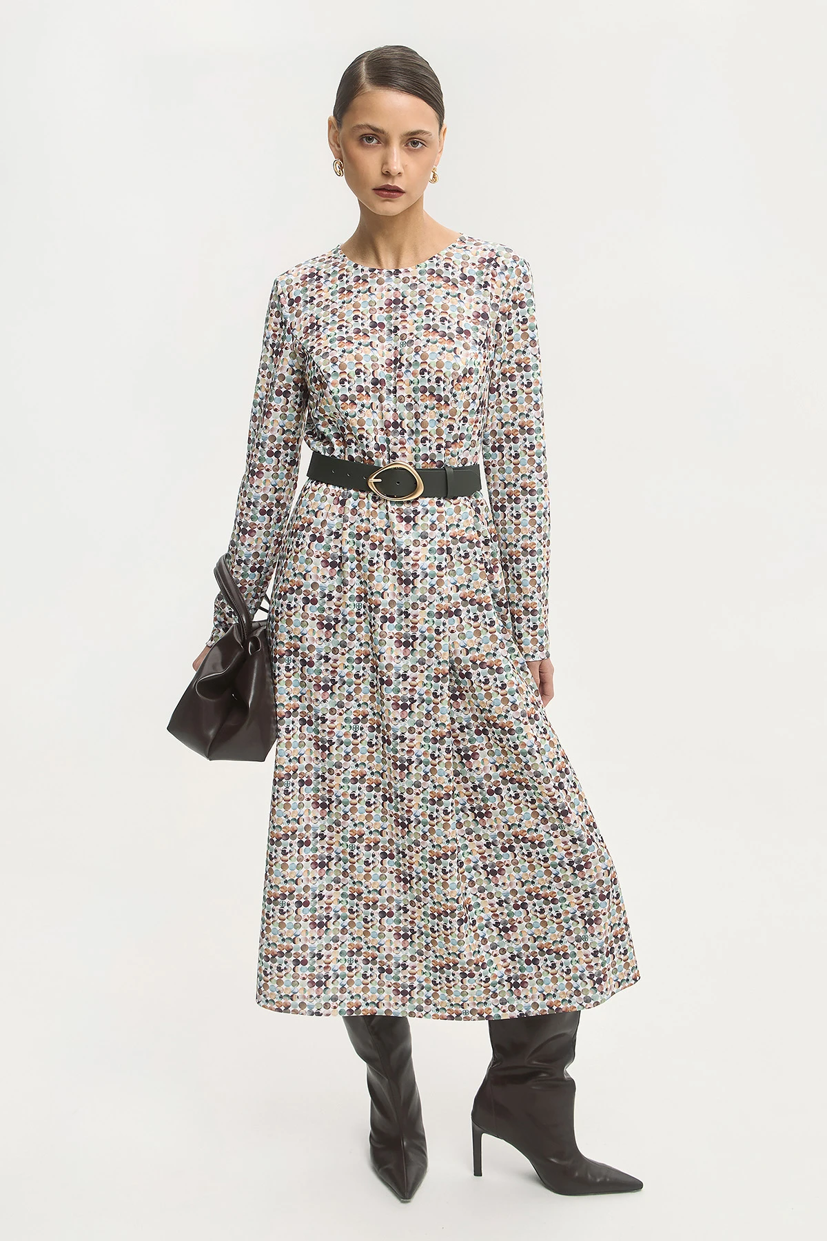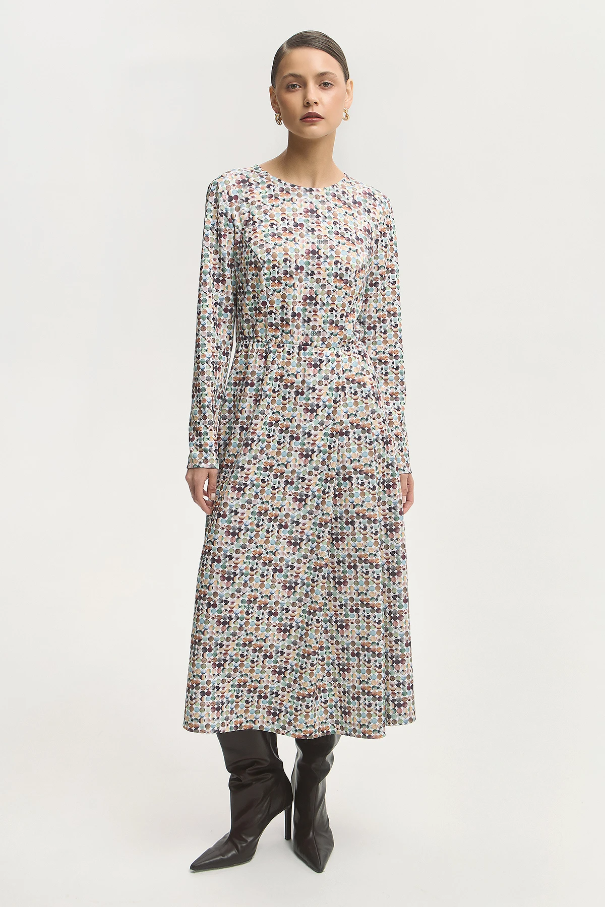 Платье отрезное по линии талии с юбкой А-силуэта подходит для разных типов фигуры и комфортно на каждый день. Актуальная длина миди делает платье универсальным для разных ситуаций — от офиса до арт-мероприятия. Контрастный паттерн добавляет ритм и визуальный интерес, не перегружая образ. Плотная ткань подходит для межсезонья. Идеально для многослойных решений — хорошо сочетается с жакетами, жилетами и кардиганами.