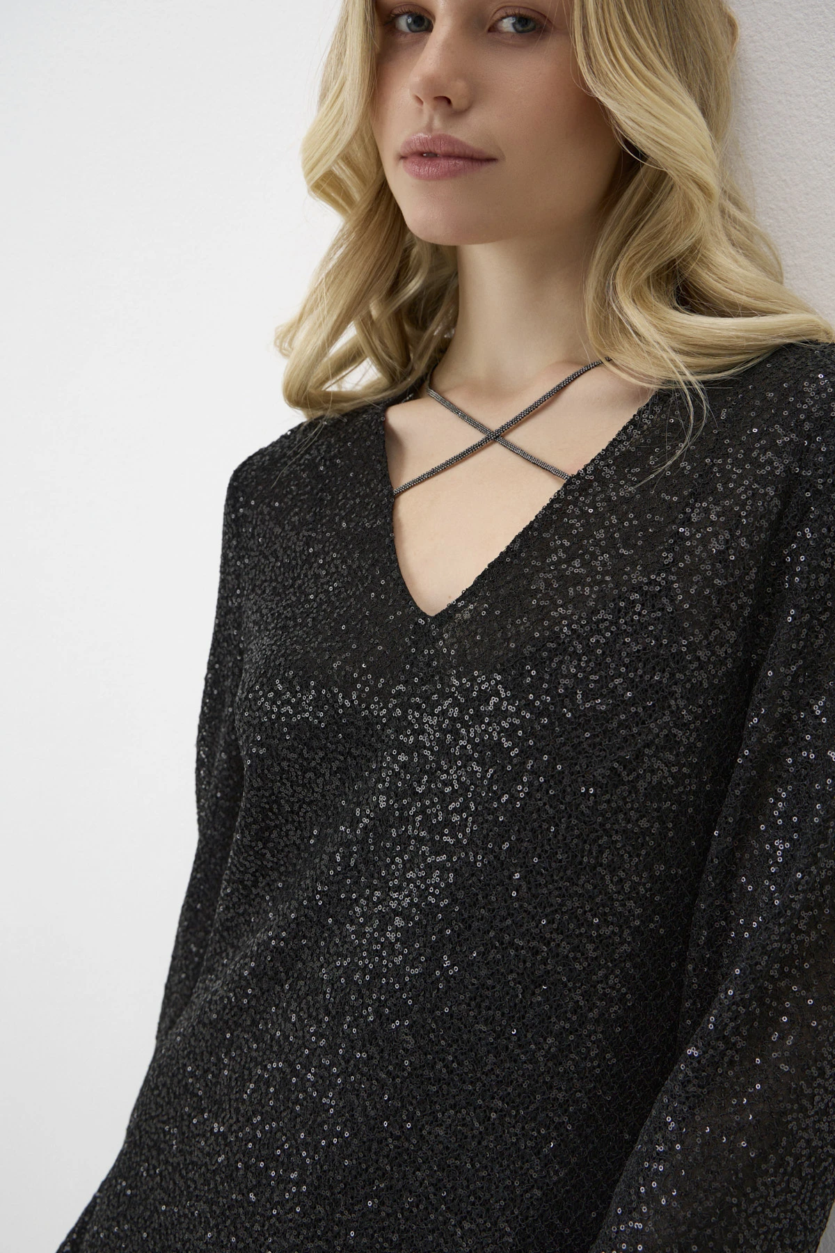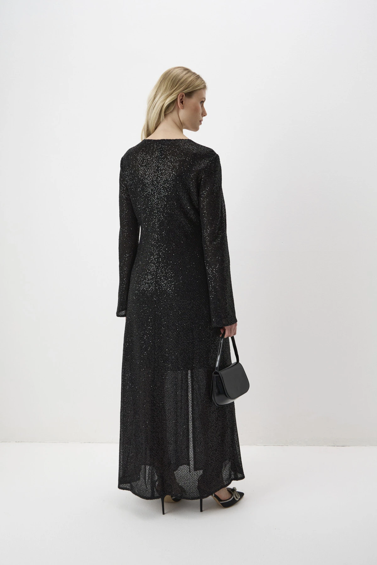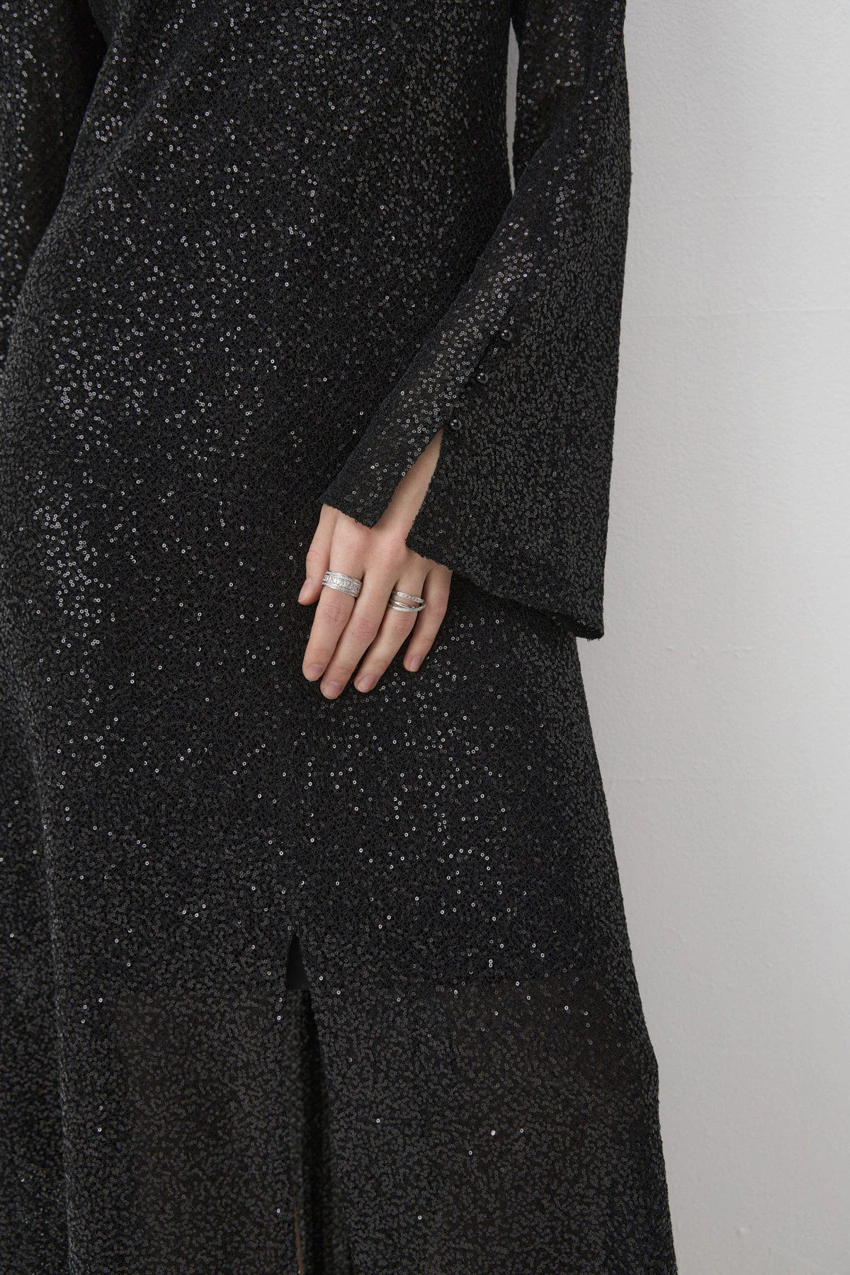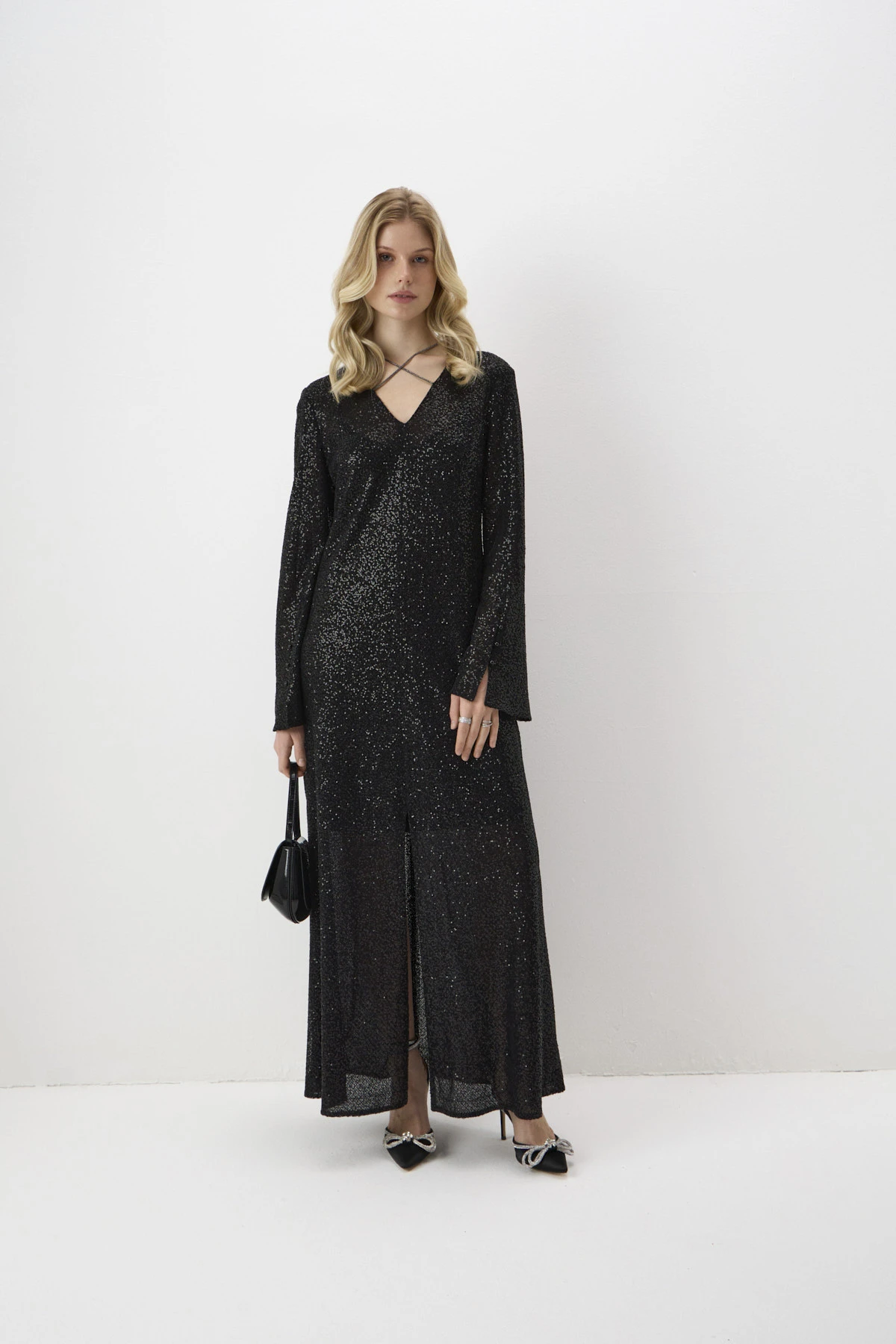 Роскошное вечернее платье длины макси из мерцающего пайеточного полотна в оттенке «затмение». Для комфорта в носке и непрозрачности платье одновременно дополнено подкладом из эластичной сетки и съёмной комбинацией из гигроскопичной вискозы в основном оттенке. По переду – V-образный вырез, нагрудные вытачки и пикантный разрез по центру. Рукава-клёш с разрезами – трендовый акцент, привлекающий внимание к изящным запястьям. В области горловины втачано изысканное украшение – две тесьмы мониль, крестообразно завязывающиеся на шее.