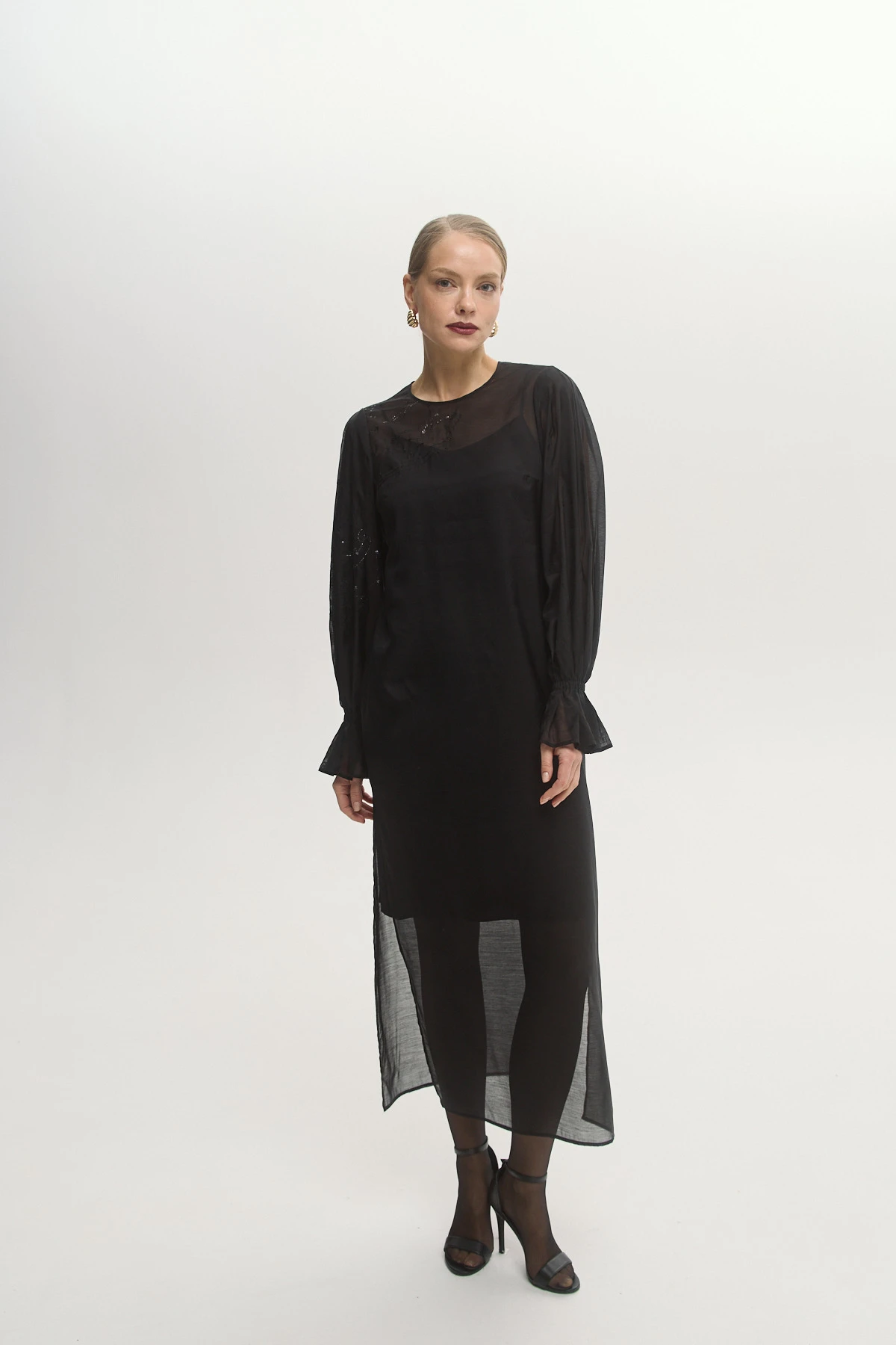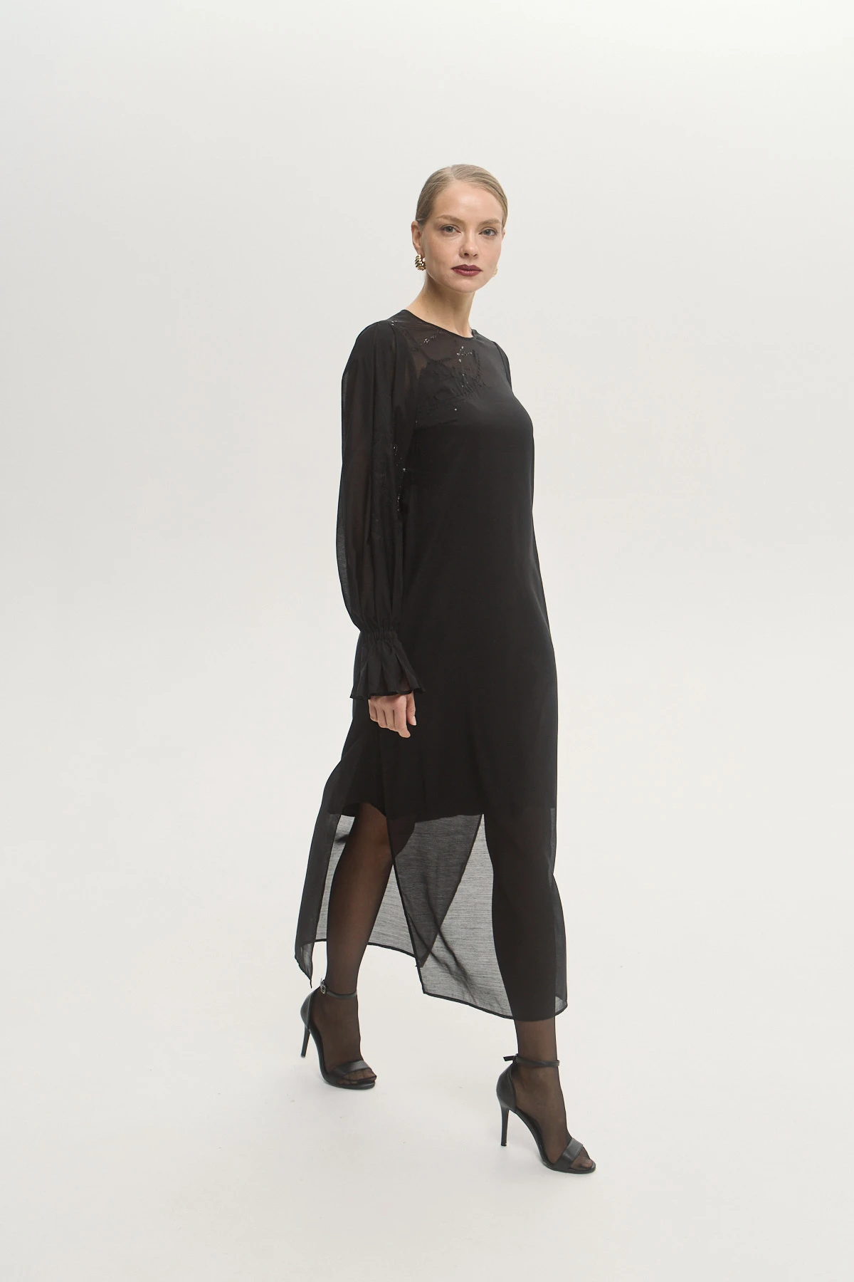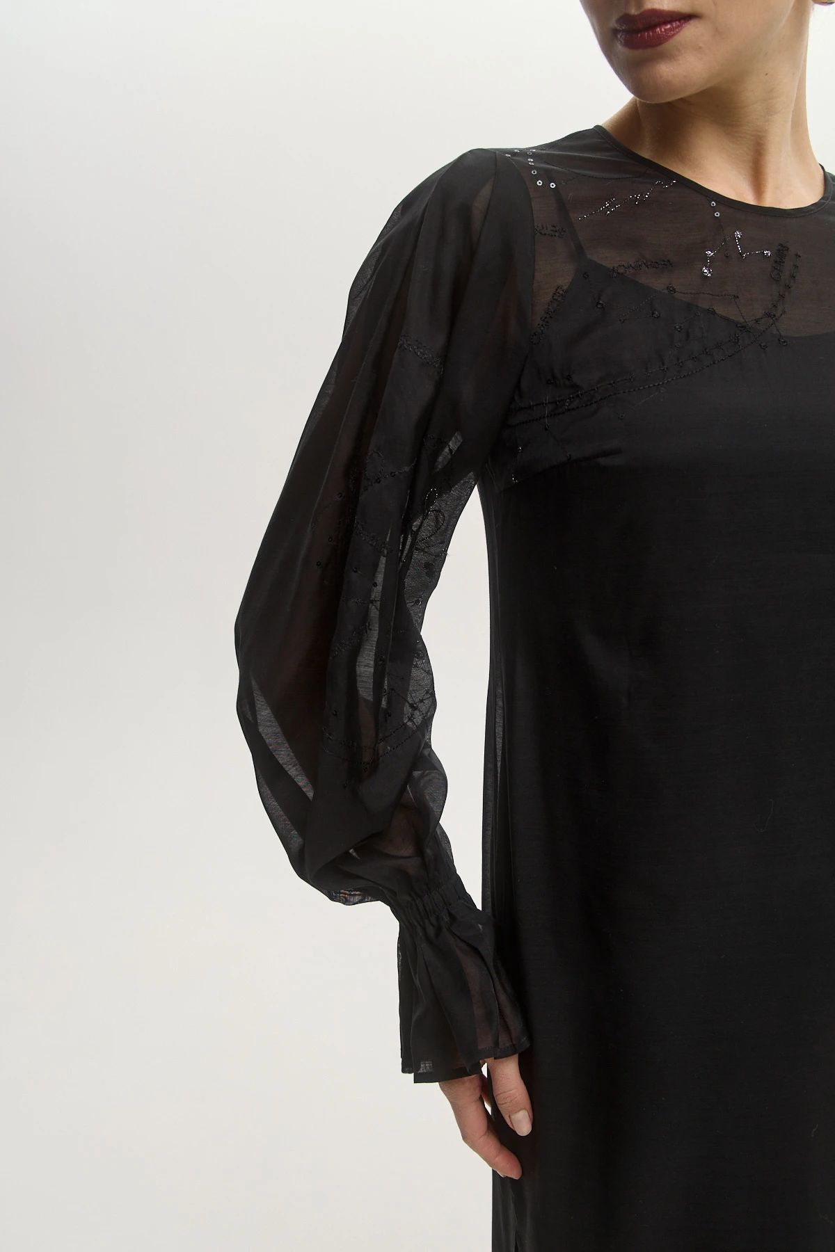 Лёгкая органза с акцентом на полупрозрачность придаёт платью воздушность и пластичность. Эффектная вышивка в виде созвездий привносит романтику в образ. Разный уровень длины верхнего платья и подклада делает образ невесомым. Трендовые рукава на эластичной ленте создают эффектную объёмность и добавляют образу драматичности. Чёрный цвет служит универсальной основой для стилизаций.