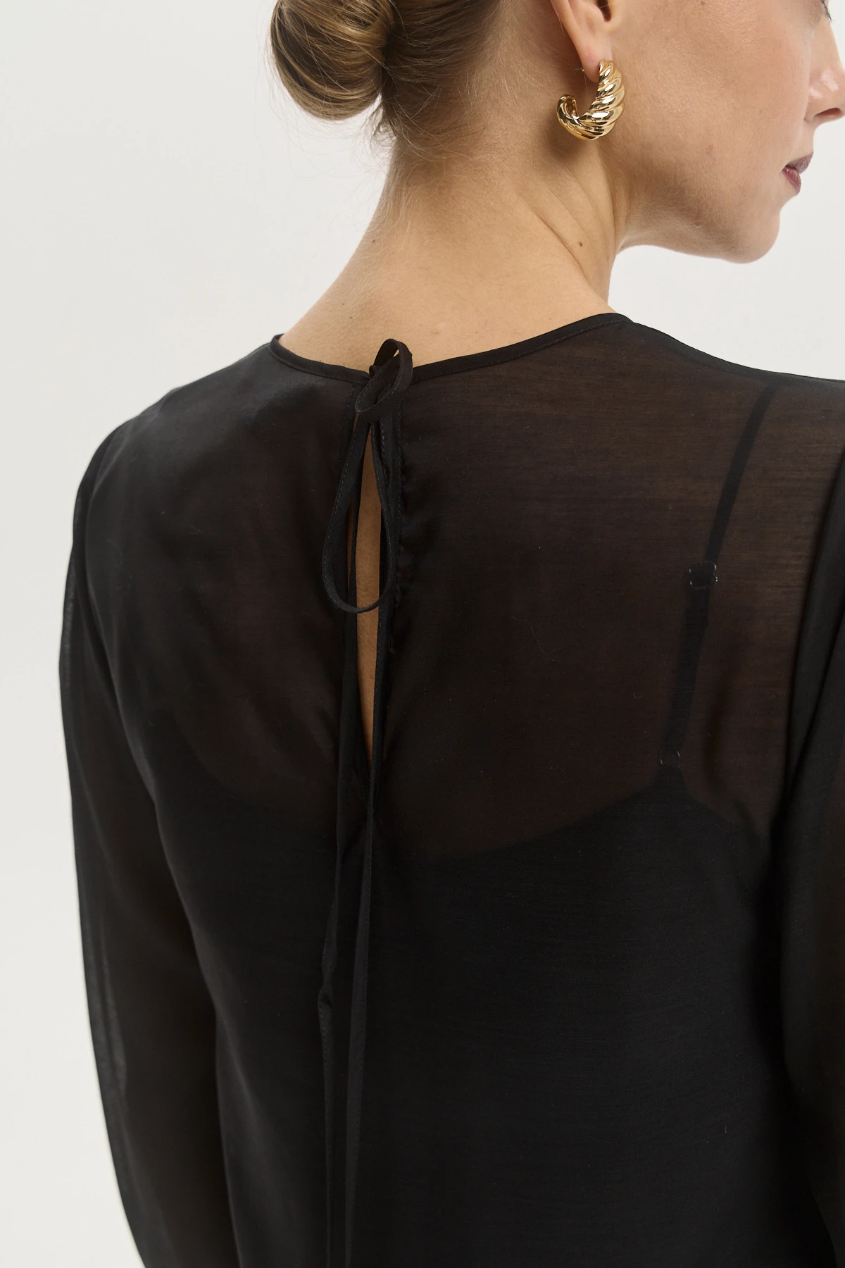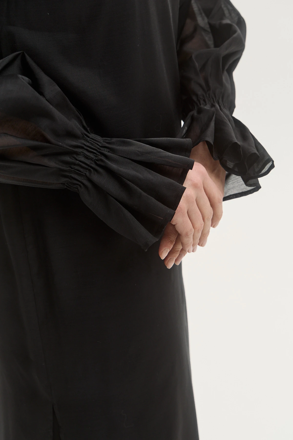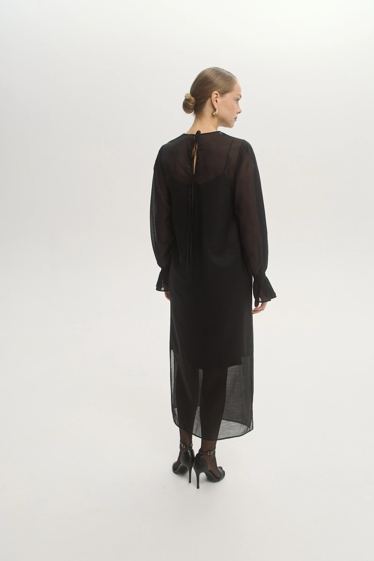 Лёгкая органза с акцентом на полупрозрачность придаёт платью воздушность и пластичность. Эффектная вышивка в виде созвездий привносит романтику в образ. Разный уровень длины верхнего платья и подклада делает образ невесомым. Трендовые рукава на эластичной ленте создают эффектную объёмность и добавляют образу драматичности. Чёрный цвет служит универсальной основой для стилизаций.