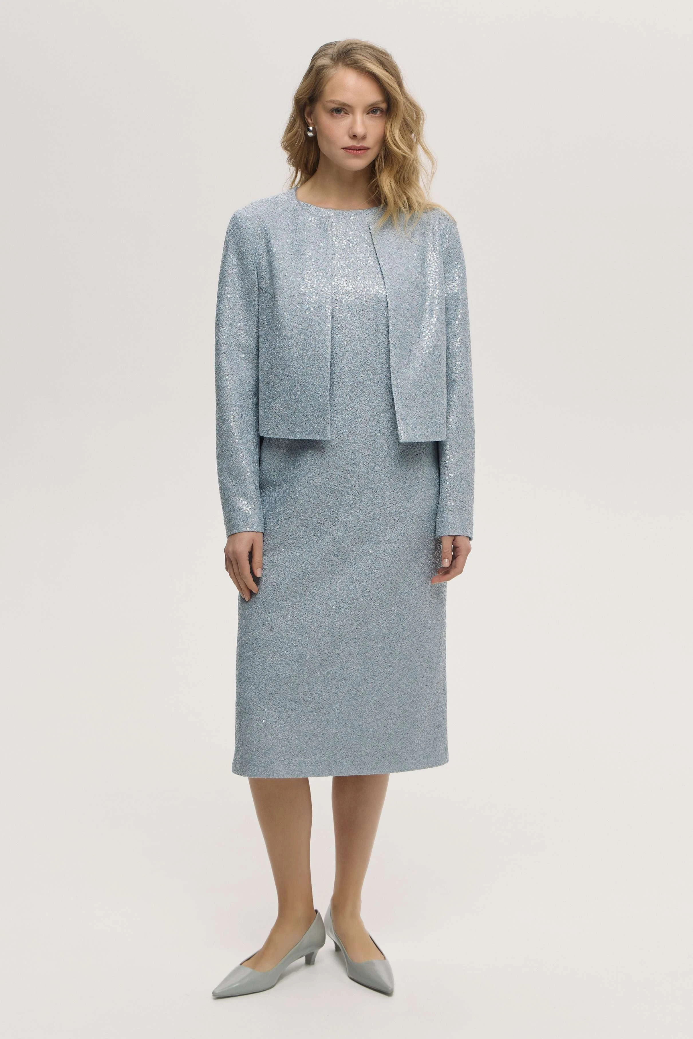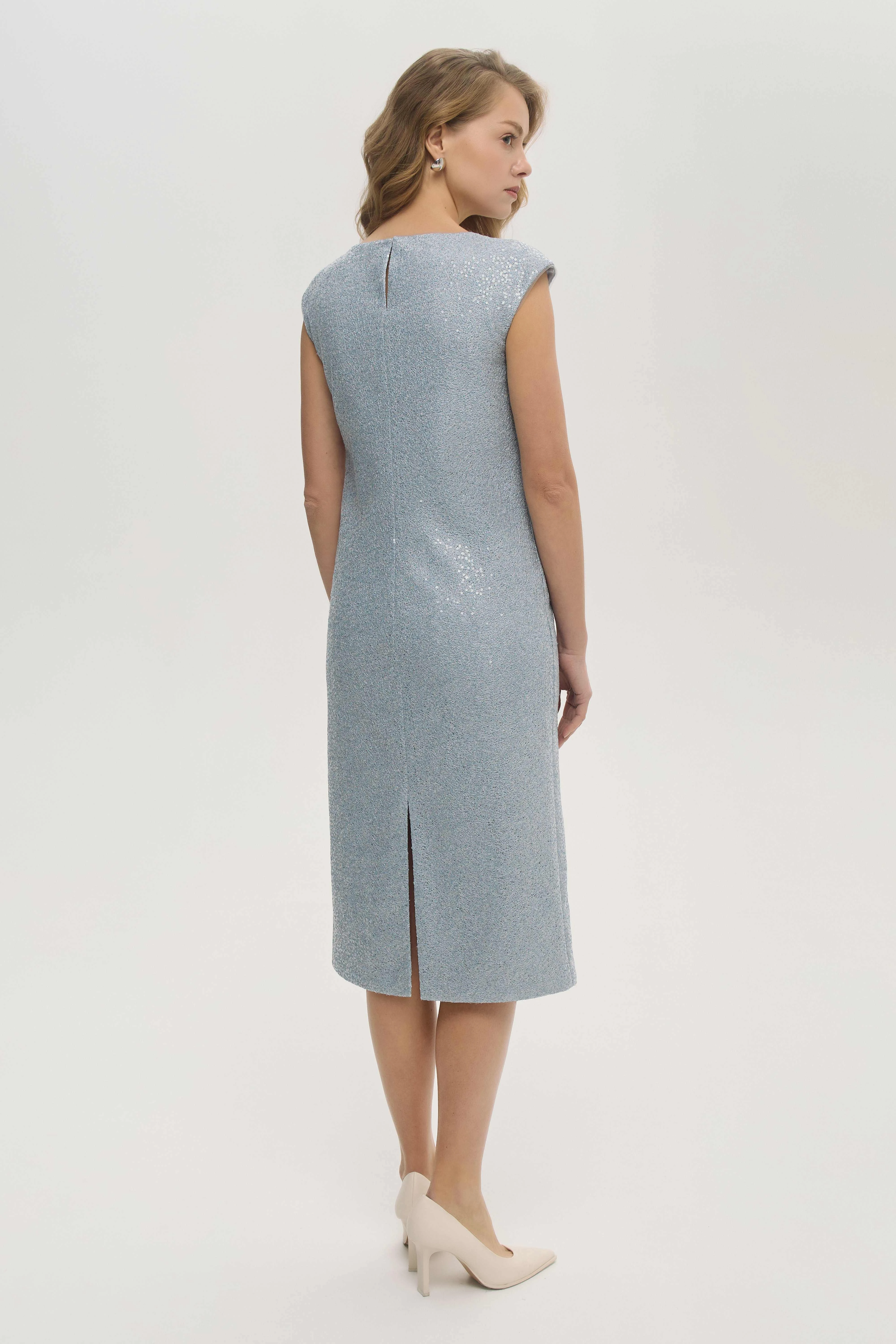 Актуальный силуэт-футляр, ставший одним из главных трендов сезона, подчёркивает фигуру и создаёт чистый собранный образ. Верхний слой платья из фактурной ткани с пайетками добавляет деликатное мерцание. Мягкая линия плеча и пройма создают графичный силуэт, подчёркивающий утончённый характер образа. Небесный голубой оттенок идеально сочетается с нейтральной и пастельной палитрой. Длина миди и выверенная посадка делают модель универсальной — от делового до коктейльного сценария дня.