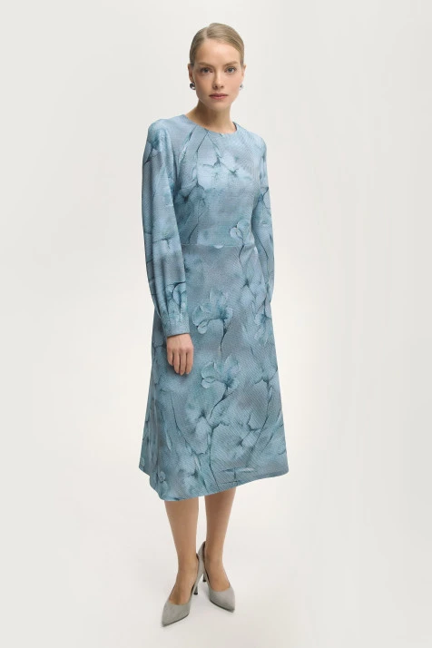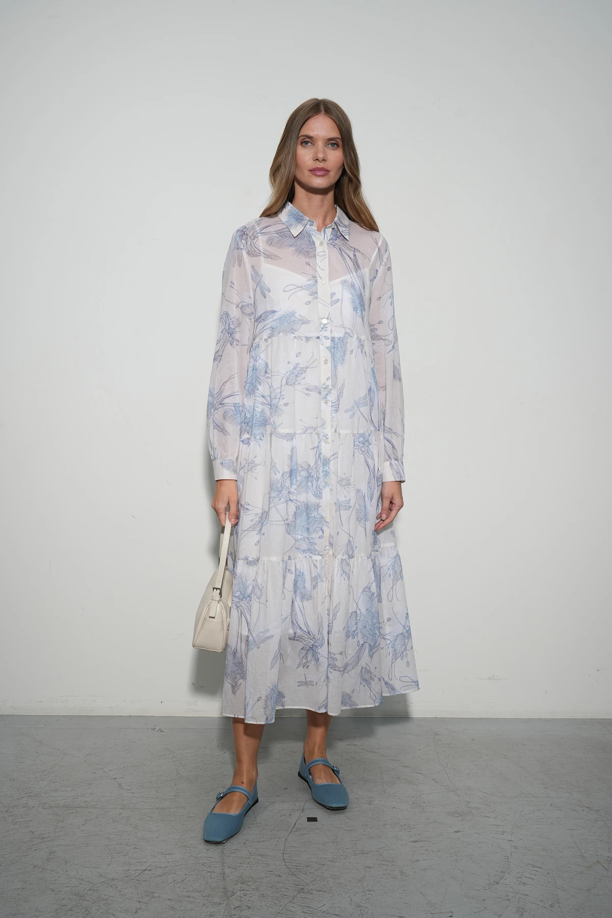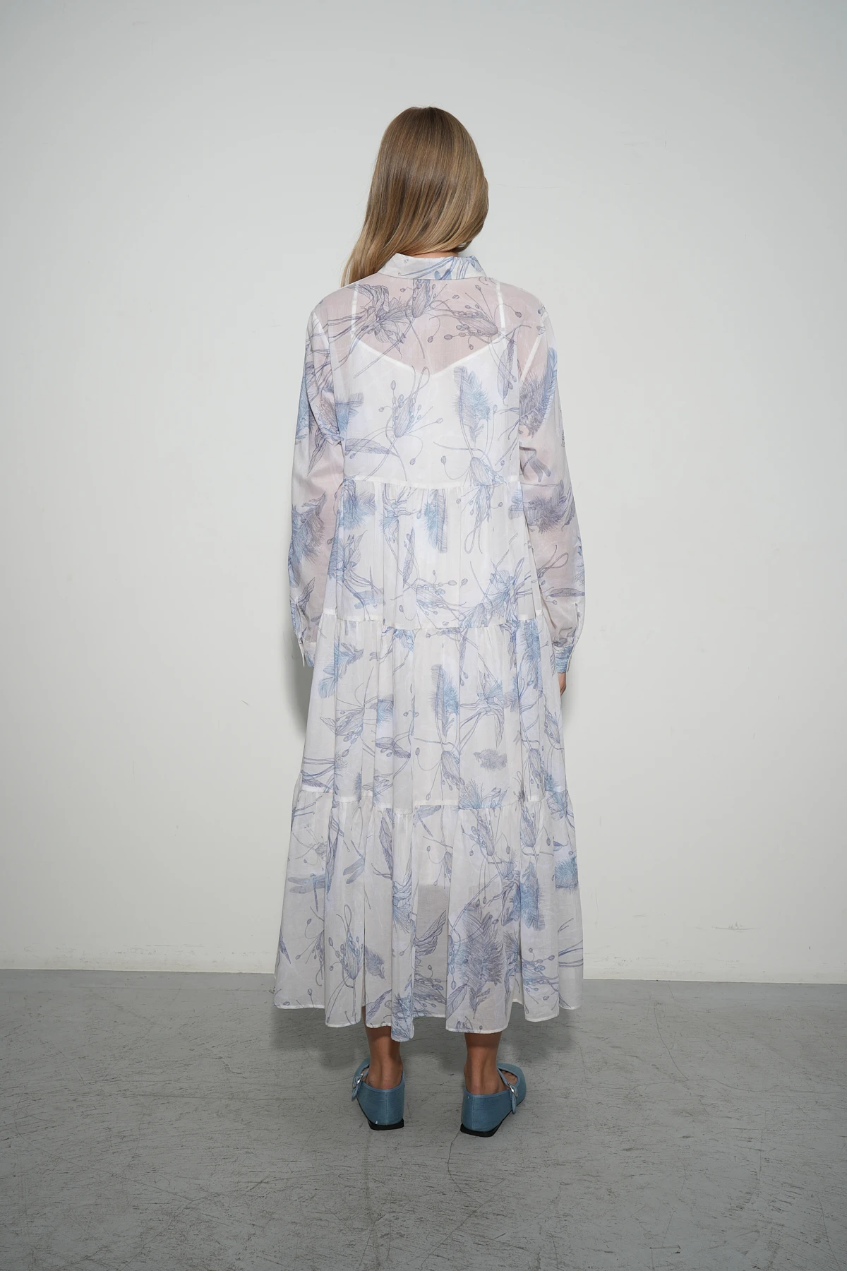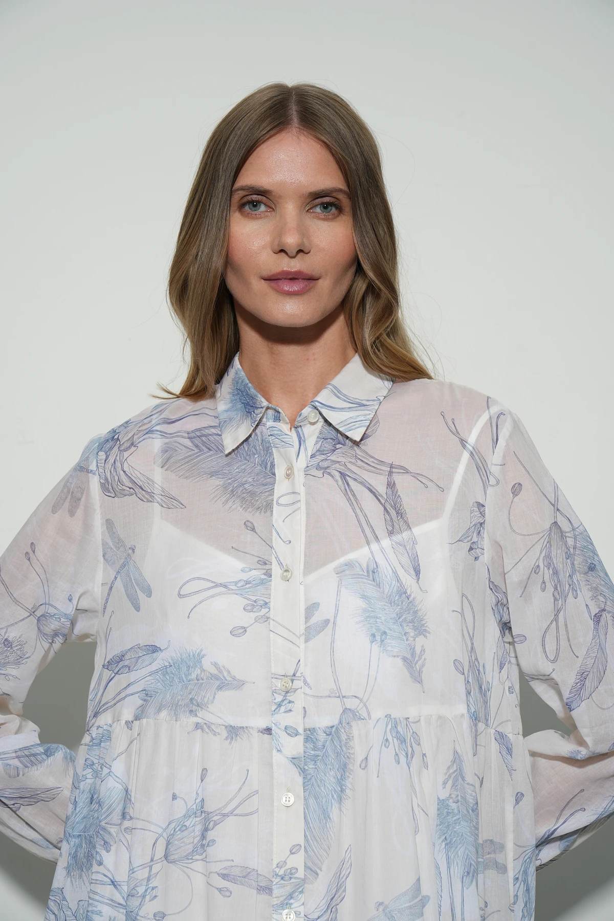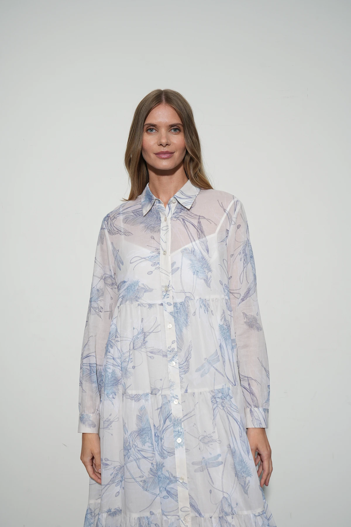 Платье из полупрозрачной ткани, сочетающей в себе два лучших летних материала – хлопок и вискозу. Авторский принт «Летний этюд» с изображением перьев, стрекоз и цветов аквилегий, нанесённый на песочный фон — великолепное сочетание элегантности и утончённости. Распашное платье А-силуэта длины макси с рубашечным воротником. Завышенная линия талии подходит для всех типов фигур. Бантовые складки по ярусам платья создают игривое настроение. Рукава втачные полной длины на манжетах. Застёжка-планка с перламутровыми пуговицами завершает изящный образ. Платье — настоящая находка для летнего гардероба за счёт своего утончённого дизайна и воздушного кокетливого настроения.