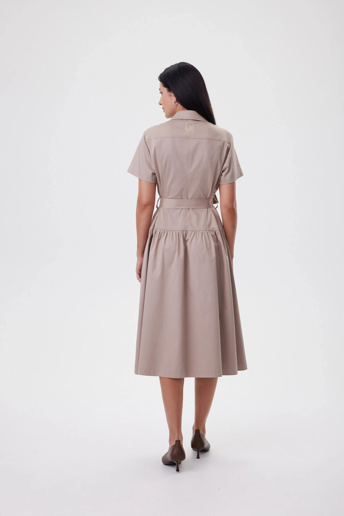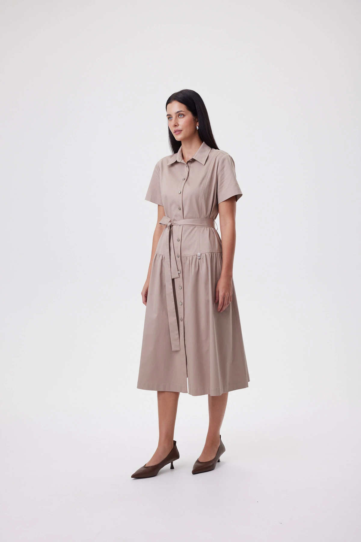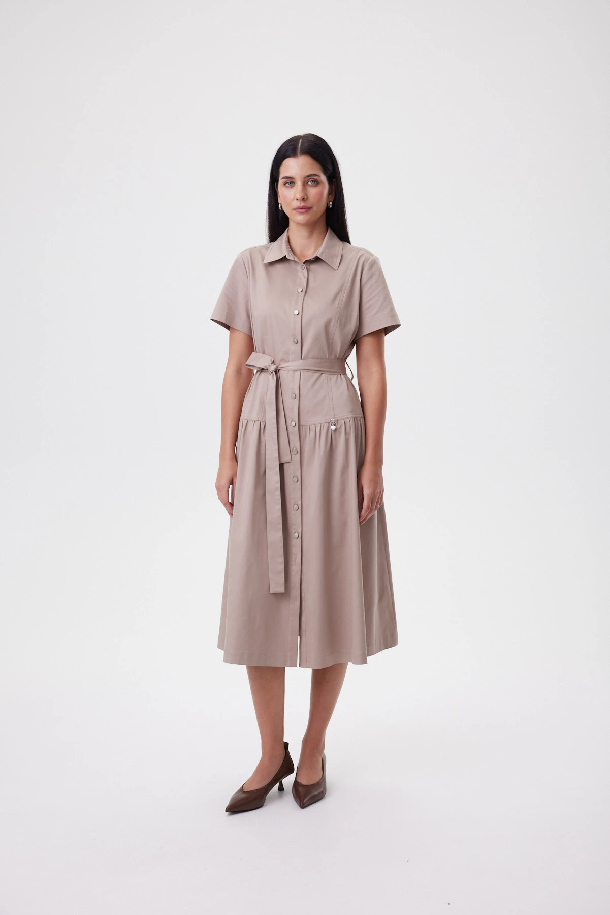 Платье-рубашка с поясом собирает силуэт в мягкие «песочные часы»: рельефы по переду выстраивают вертикаль, талия читается чётко, с лёгким обтягиванием. Сборка юбки не добавляет объёма в зоне живота и бёдер — получается женственная форма, которая подчёркивает пропорции. Премиальный хлопок держит линию рельефов и пояса, оставаясь тактильно-приятным к телу, как тонкая рубашка. На спинке — аппликативная вышивка feelings (с англ. «чувства») с фламинго как личный герб женщины, которая умеет жить в согласии со своими чувствами. «Миндальный нюд» выглядит спокойным и люксовым, легко адаптируется в летний гардероб. Идеально с плоской обувью днём, а вечером — с босоножками и лаконичными украшениями.