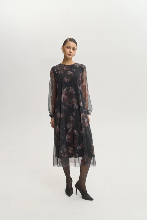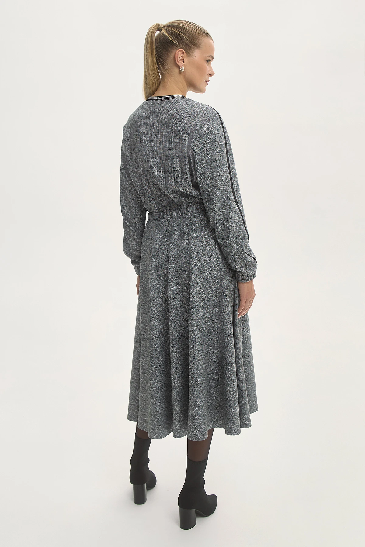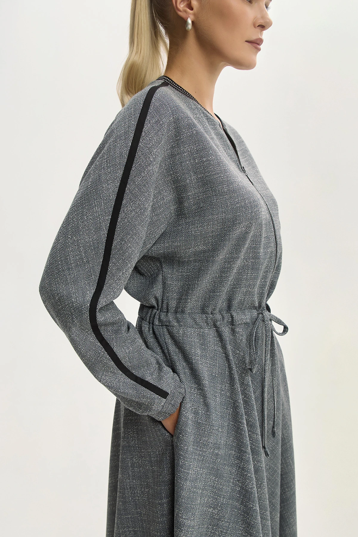 Платье отрезное по линии талии с кулиской — комфортная демисезонная модель. Костюмная ткань с добавлением вискозы в сером оттенке легко адаптируется под деловой, повседневный или вечерний контекст. Застёжка на молнию, ворот-стойка из авторской бейки и акцентный лампас добавляют образу нотку в стиле спорт-шик. Длина миди и длинный рукав делают платье универсальным на прохладный сезон. Сочетается с сапогами, лоферами, кроссовками, создавая как классические, так и креативные образы.