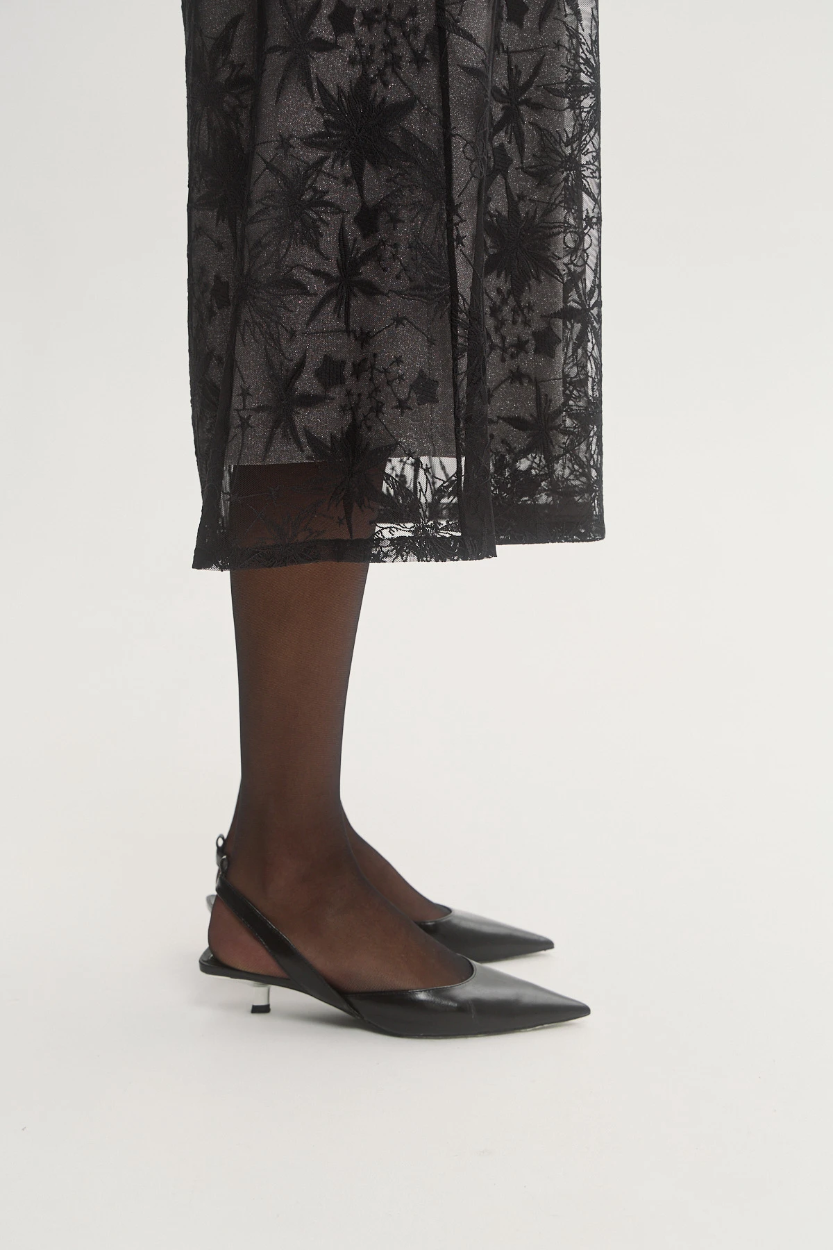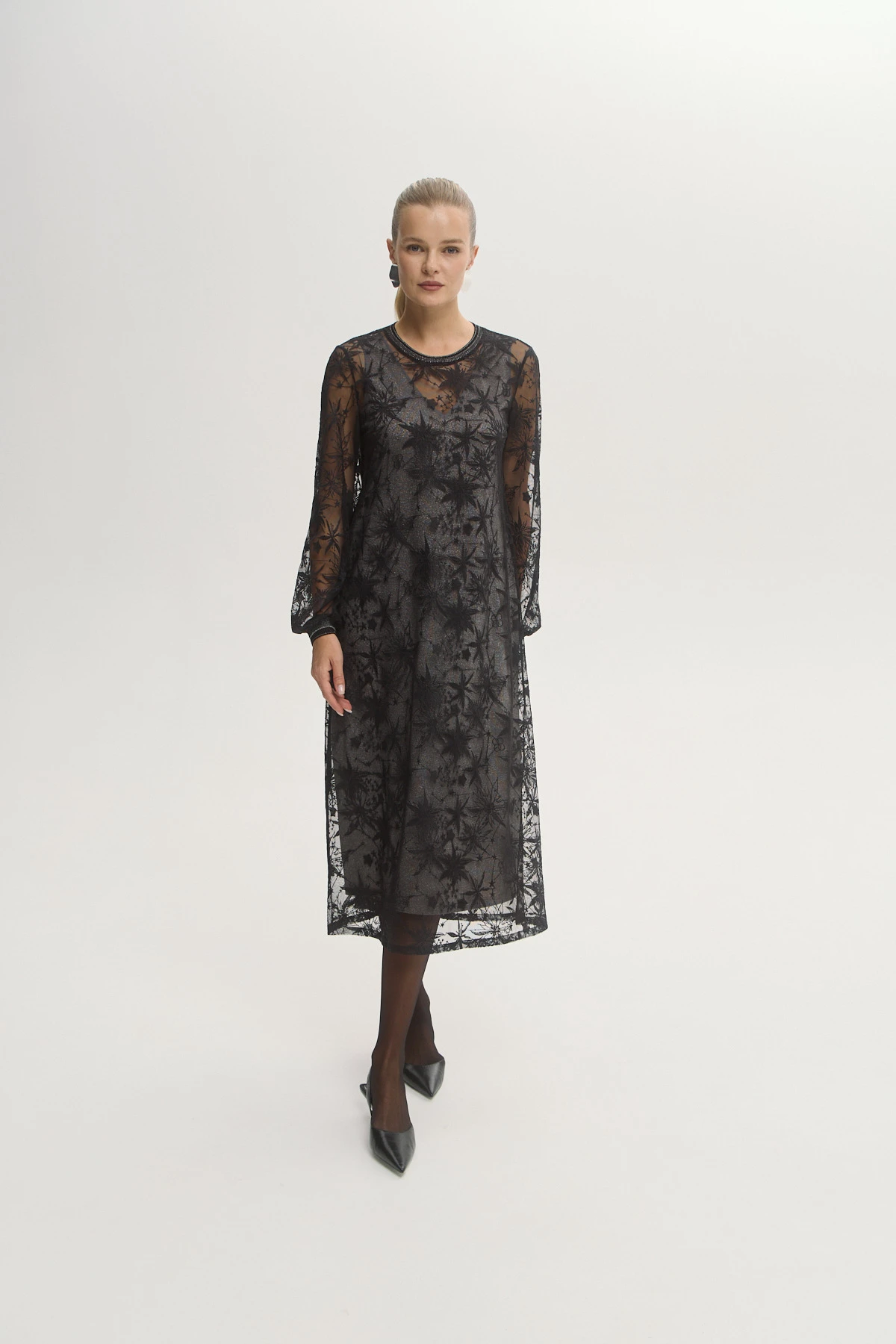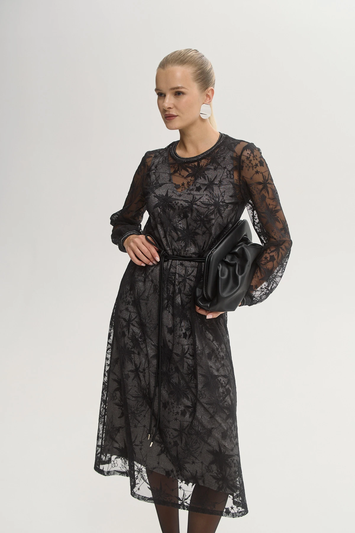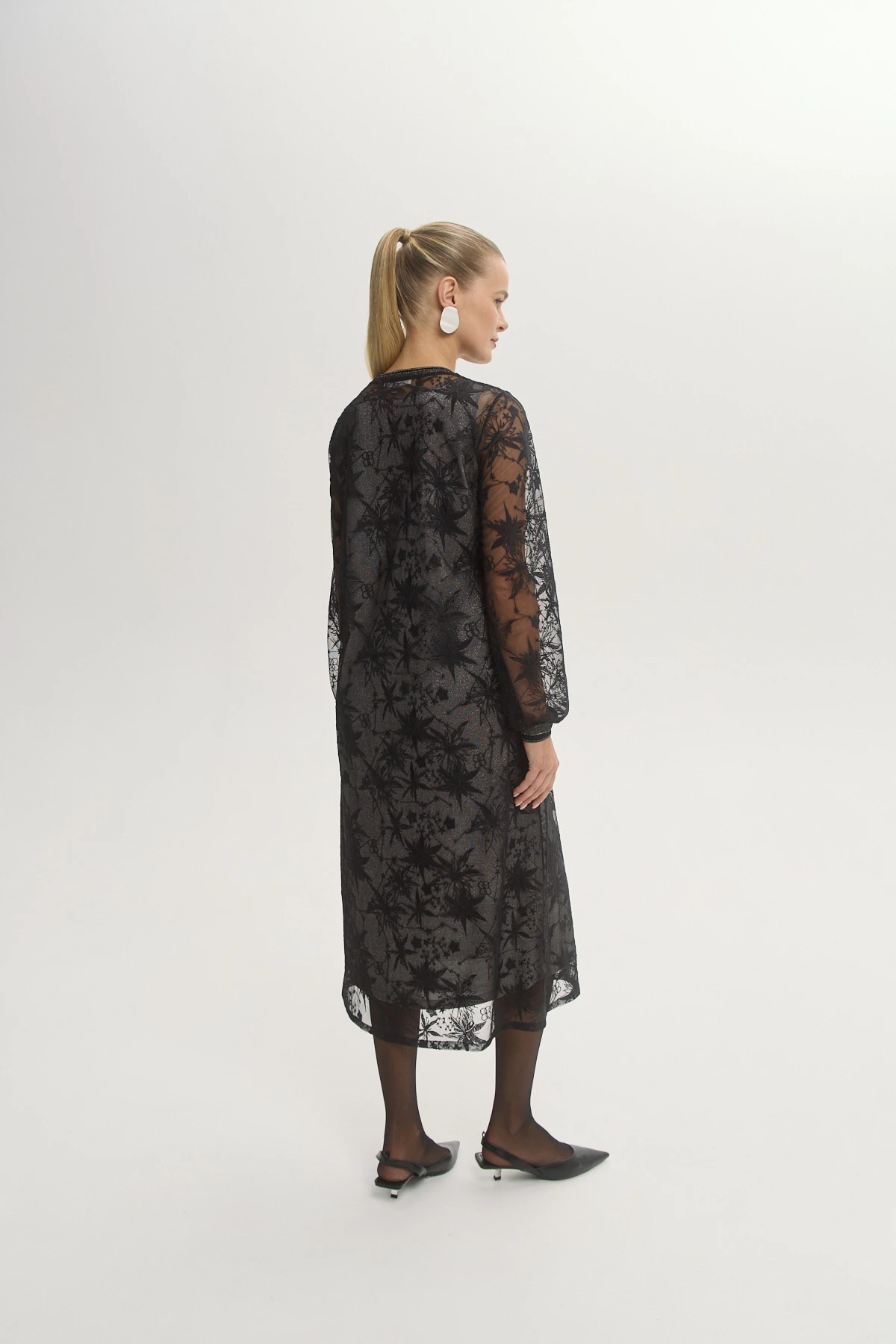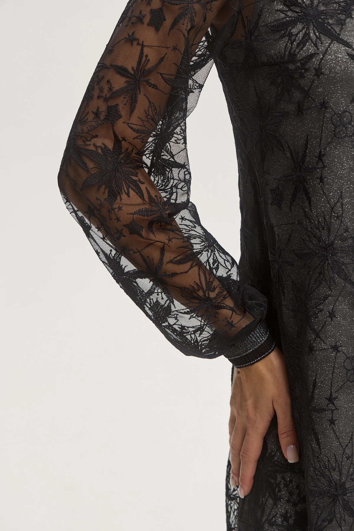 Платье с флоковым узором на сетке создаёт таинственный и элегантный образ. Длина миди делает модель универсальной для разных случаев. Подклад с высоким содержанием метанита создаёт деликатное мерцание и усиливает торжественный характер платья. А-силуэт выглядит женственно и подойдёт разным типам фигур. Идеально сочетается с лодочками, ботильонами и акцентными аксессуарами.