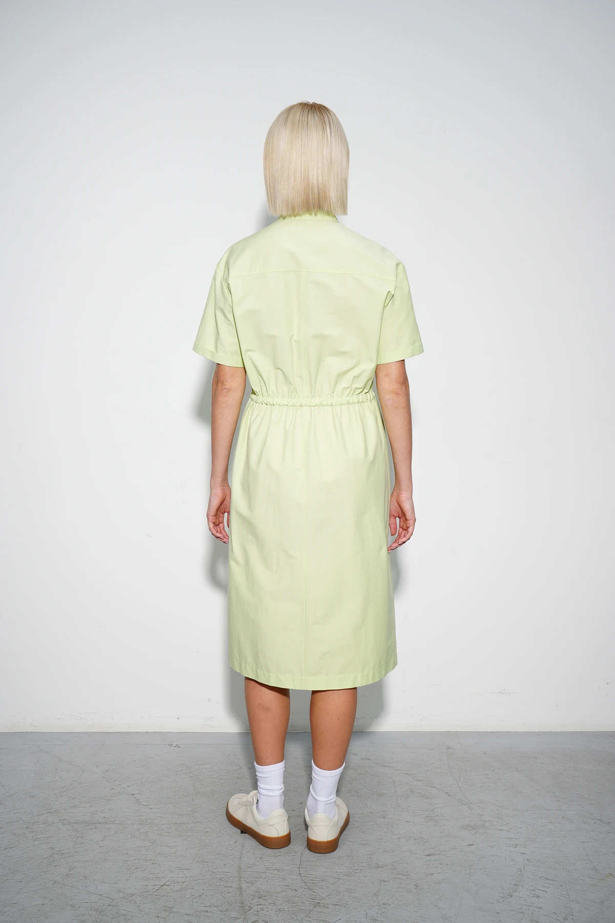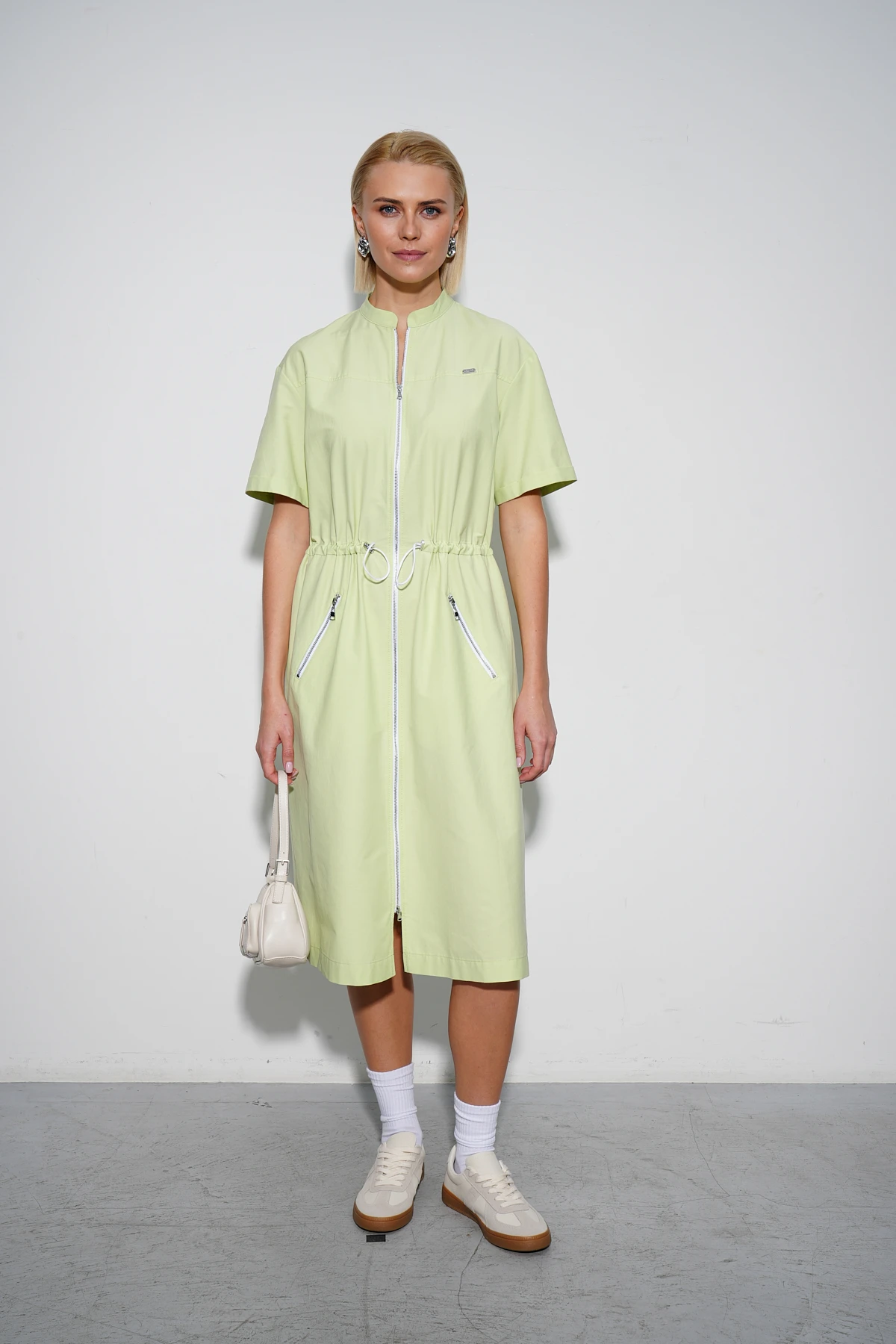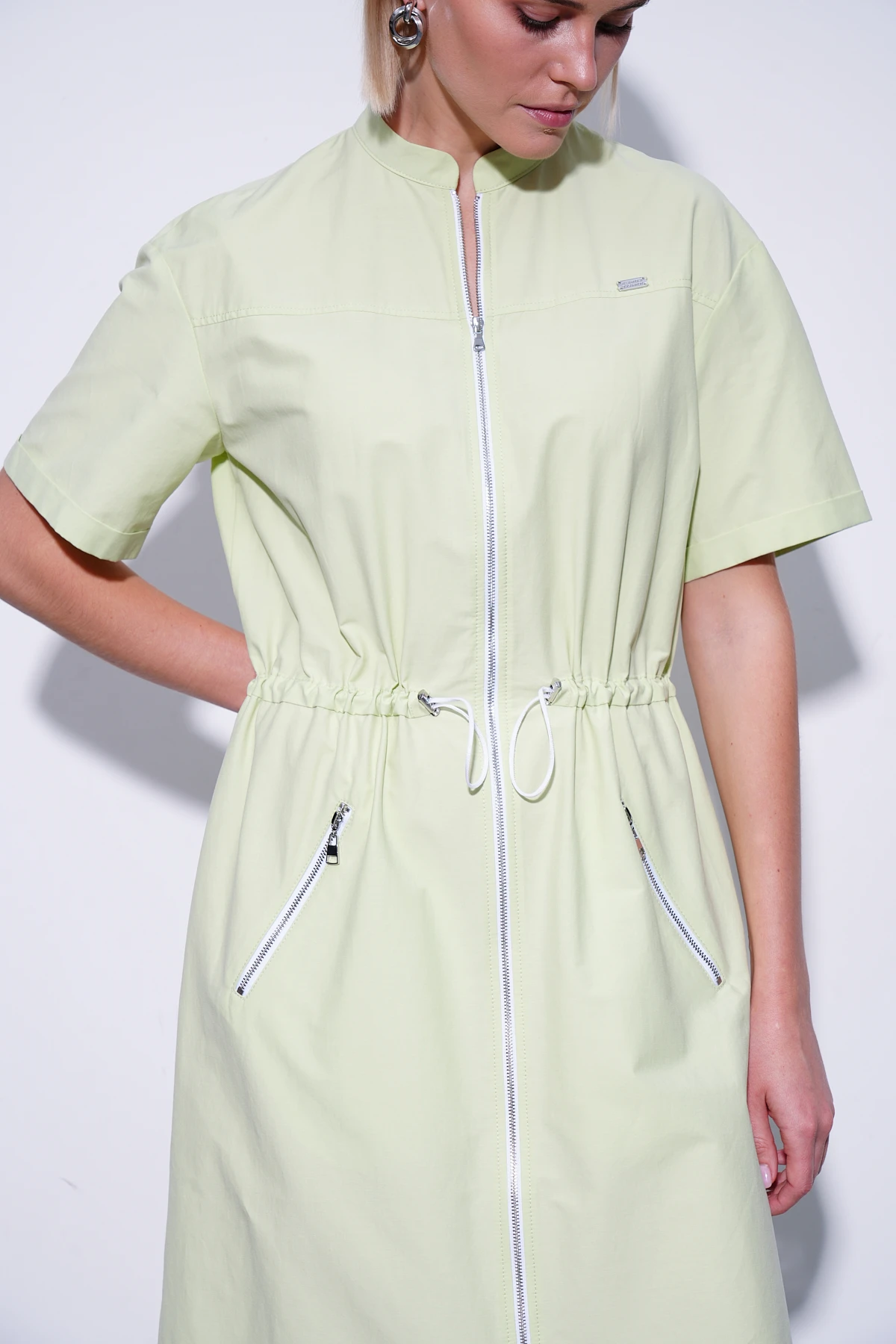Монохромное платье из ткани смешанного состава на основе воздухопроницаемого хлопка. Лаймовый оттенок создаёт яркое и бодрящее настроение, словно наполняет энергией и свежестью. Распашной крой с кулиской на талии позволяет регулировать прилегание, подстраиваясь под настроение и образ. Невысокий воротник-стойка и кокетки по переду и спинке придают модели аккуратность и изысканность. Удобные карманы с молниями добавляют практичности, а втачные рукава малой длины с отворотами создают непринуждённый летний стиль. Детали из белого металла — брендированная фурнитура, двусторонняя молния, застёжки карманов и шнур с регуляторами — добавляют изящные акценты, завершая гармоничный и современный образ.