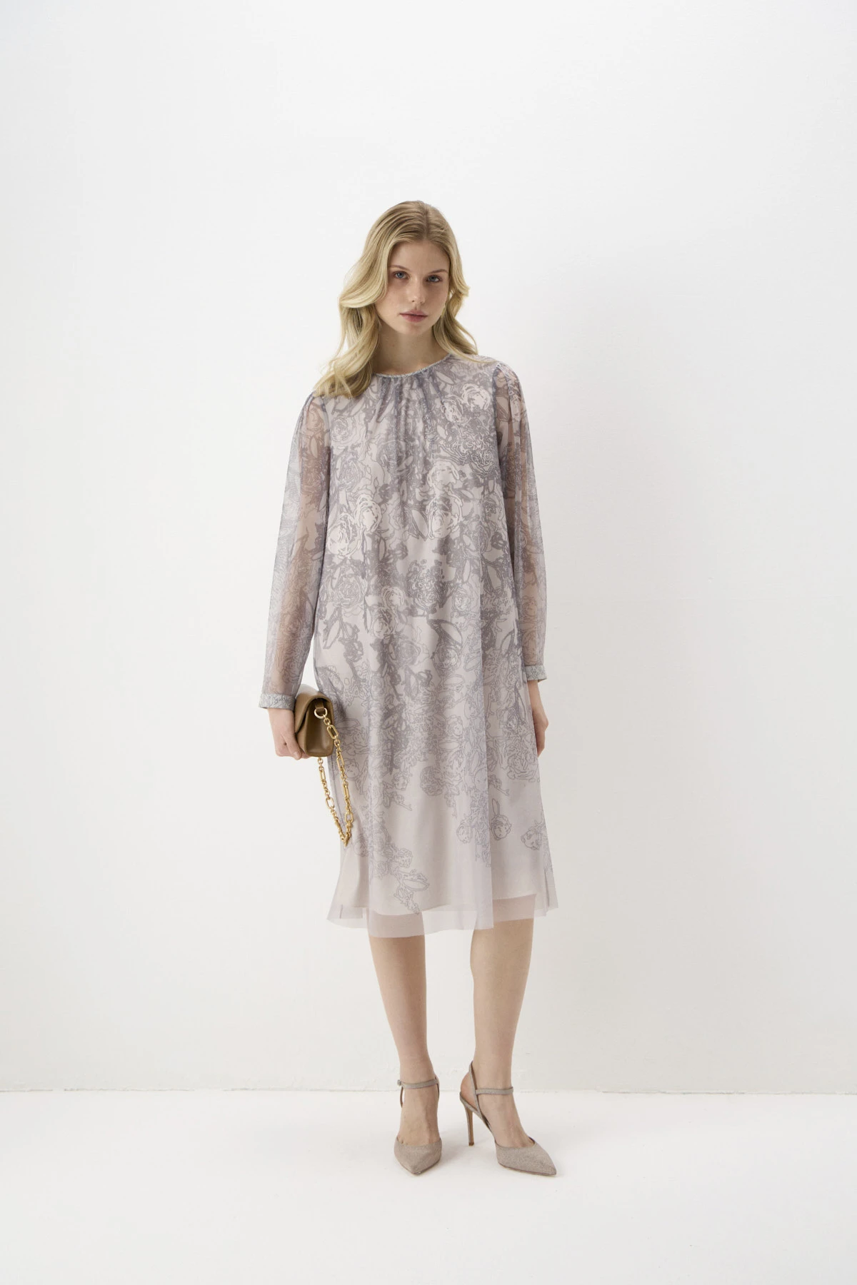 Платье из воздушной сетки с авторским принтом, изображающим роскошные розы в серо-бежевых оттенках. Поклад – из тактильно приятной ткани в бежевом оттенке. А-силуэт подчеркивает женственные формы, обеспечивая свободу движений. В зоне декольте – встречные складки, создающие лёгкий объём и придающие платью романтичный характер. Длина платья ниже колена придает ему элегантность и универсальность. Воздушное и романтичное платье подарит незабываемые эмоции!