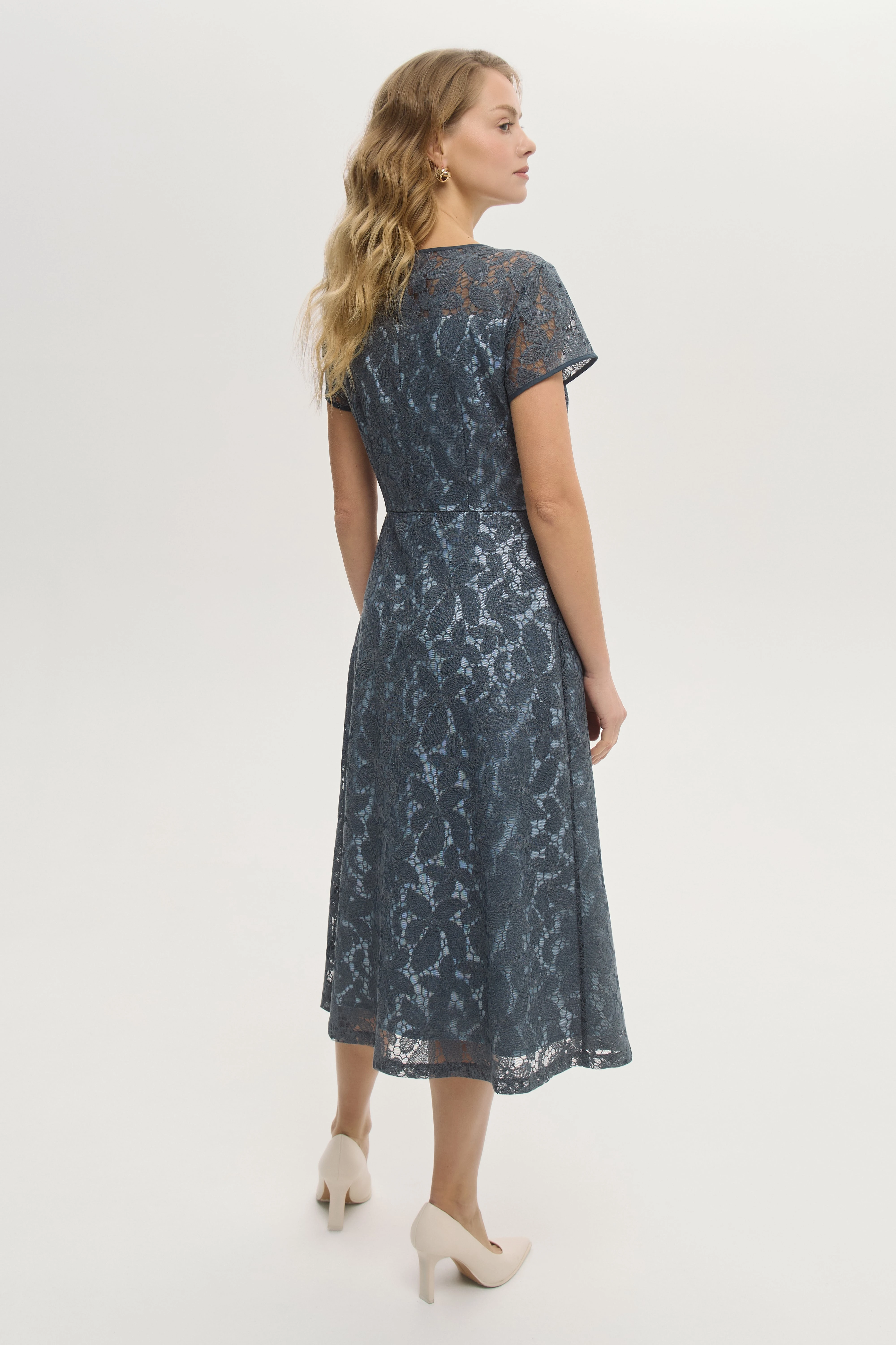 Платье, отрезное по линии талии талии, подчёркивает женственные изгибы фигуры и придаёт образу деликатный акцент. Длина миди универсальна и хорошо смотрится как с каблуками, так и с обувью на плоском ходу. Полупрозрачное кружево с контрастным подкладом создаёт многослойный визуальный эффект и подчёркивает романтичный характер модели. Классический круглый вырез и короткий рукав делают силуэт уместным и в повседневных, и в торжественных комплектах. Мягкий подклад из вискозы обеспечивает комфорт в носке. Платье не требует дополнительного оформления и смотрится благородно благодаря деликатному блеску.
