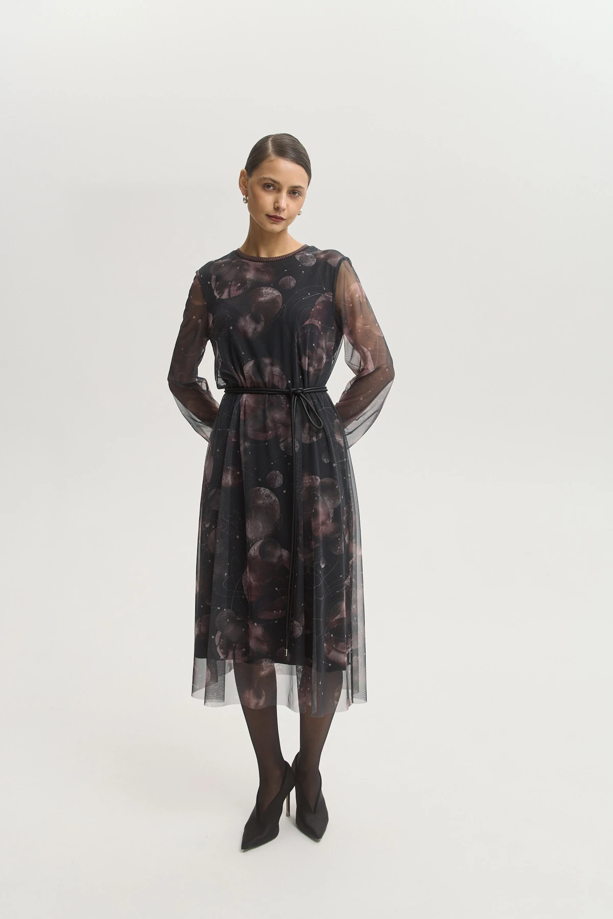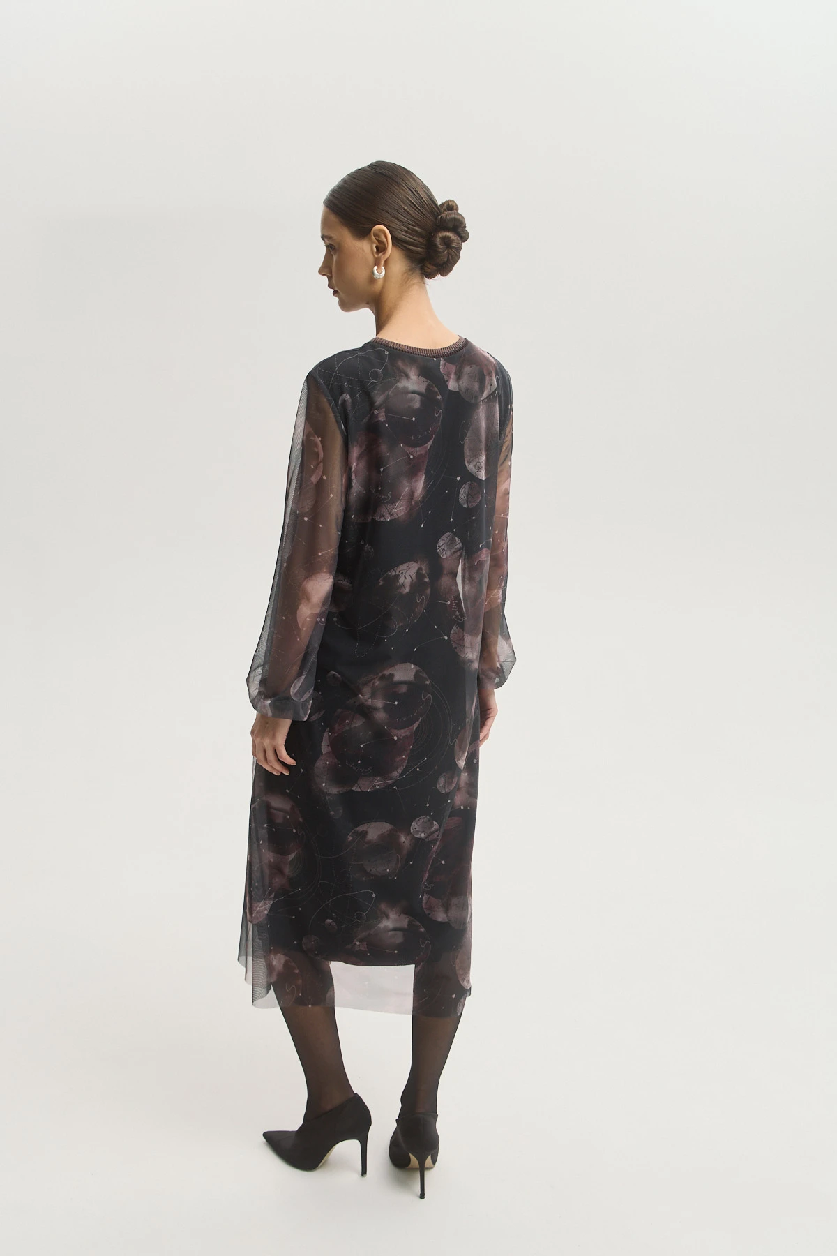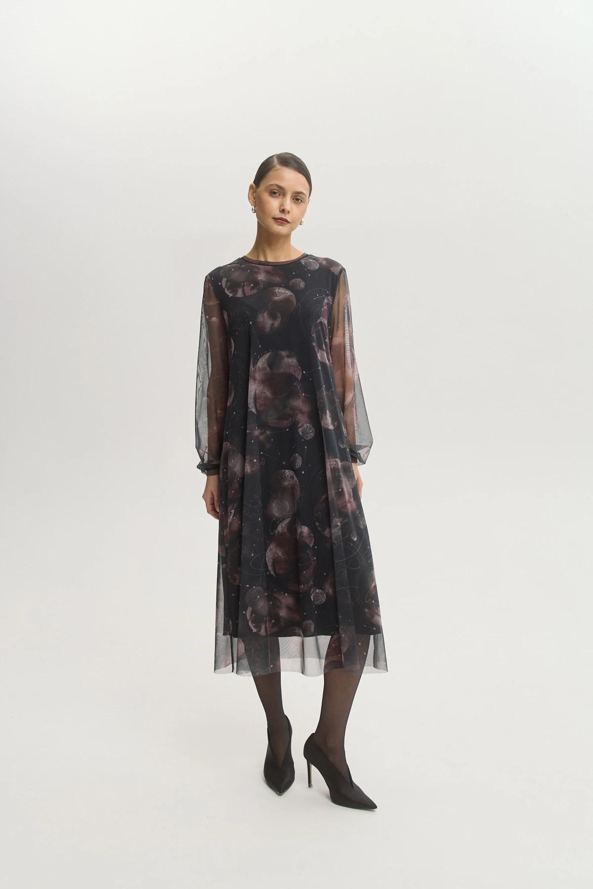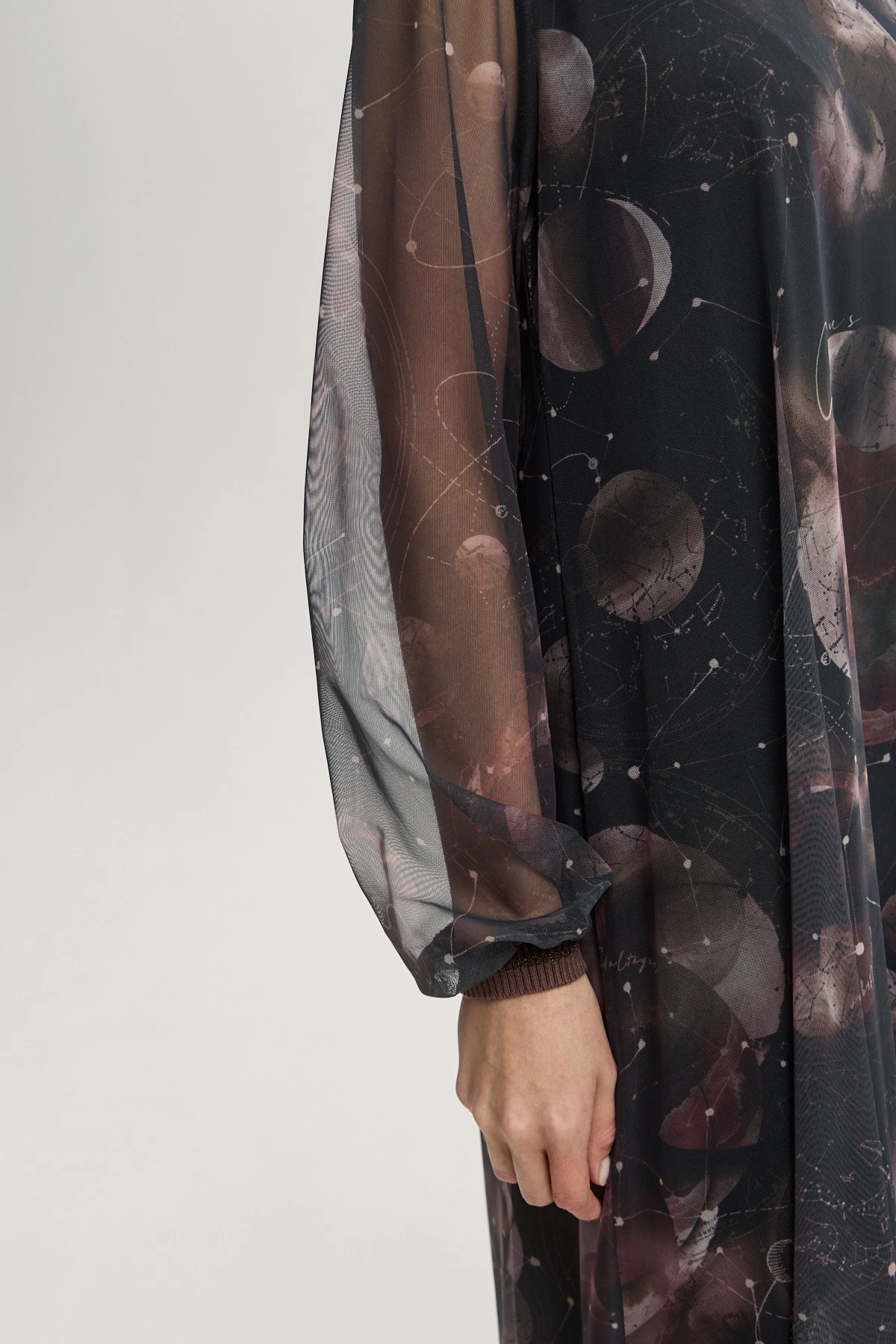 Двухслойное платье с таинственным настроением: принт с астрономическим сюжетом в тёмной гамме создаёт ощущение глубины. Мягкий объём рукавов добавляет выразительности. Универсальная длина миди позволяет адаптировать платье под вечерние события и дневные выходы. Разноуровневая длина подола делает силуэт невесомым. Трикотажная отделка создаёт игру фактур. Подклад из вискозы дарит приятные тактильные ощущения и обеспечивает комфорт.