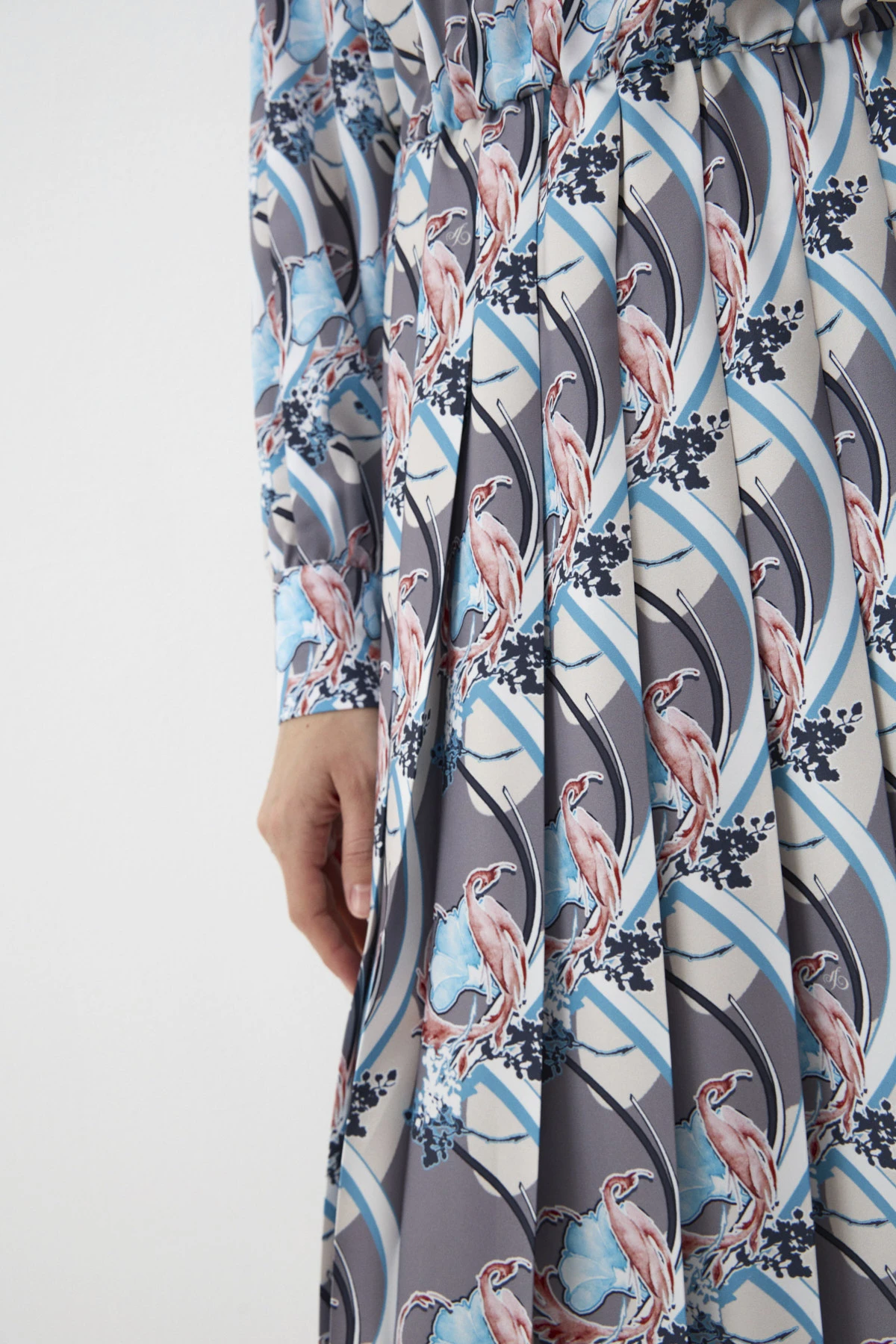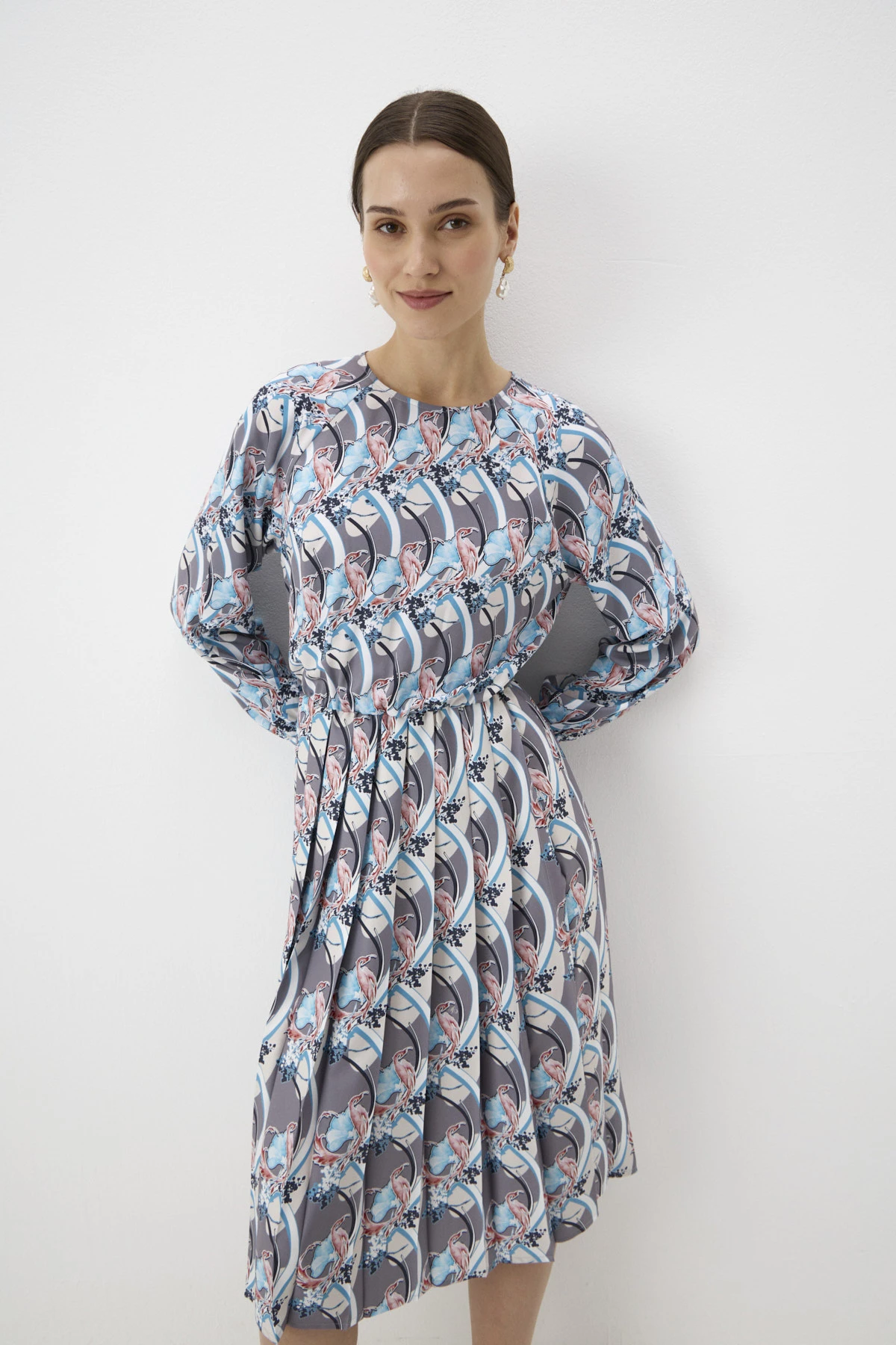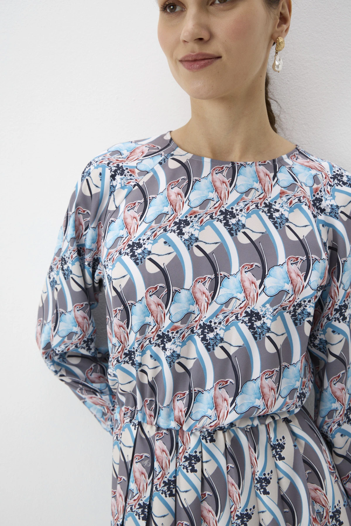 Эффектное платье из тактильно приятной ткани и комфортным кроем, подчёркивающим достоинства фигуры. Односторонние складки на юбке А-силуэта создают эффектный объём. Таинственный и яркий принт в лёгкой сюрреалистичной манере открывает перед нами сокровищницы галерей Эрмитажа. Алмазная брошь «Цветущая ветвь», цветы из лепнины и восхитительный механический павлин из знаменитых часов Екатерины II – эстетическое воплощение эпохи. Благодаря палитре контрастных цветов – терракотовый, бирюзовый, песочный, белый, серый – платье станет основой образа для обладательниц разных цветотипов и по-разному «заиграет», стоит лишь добавить к нему пояс или другой аксессуар.