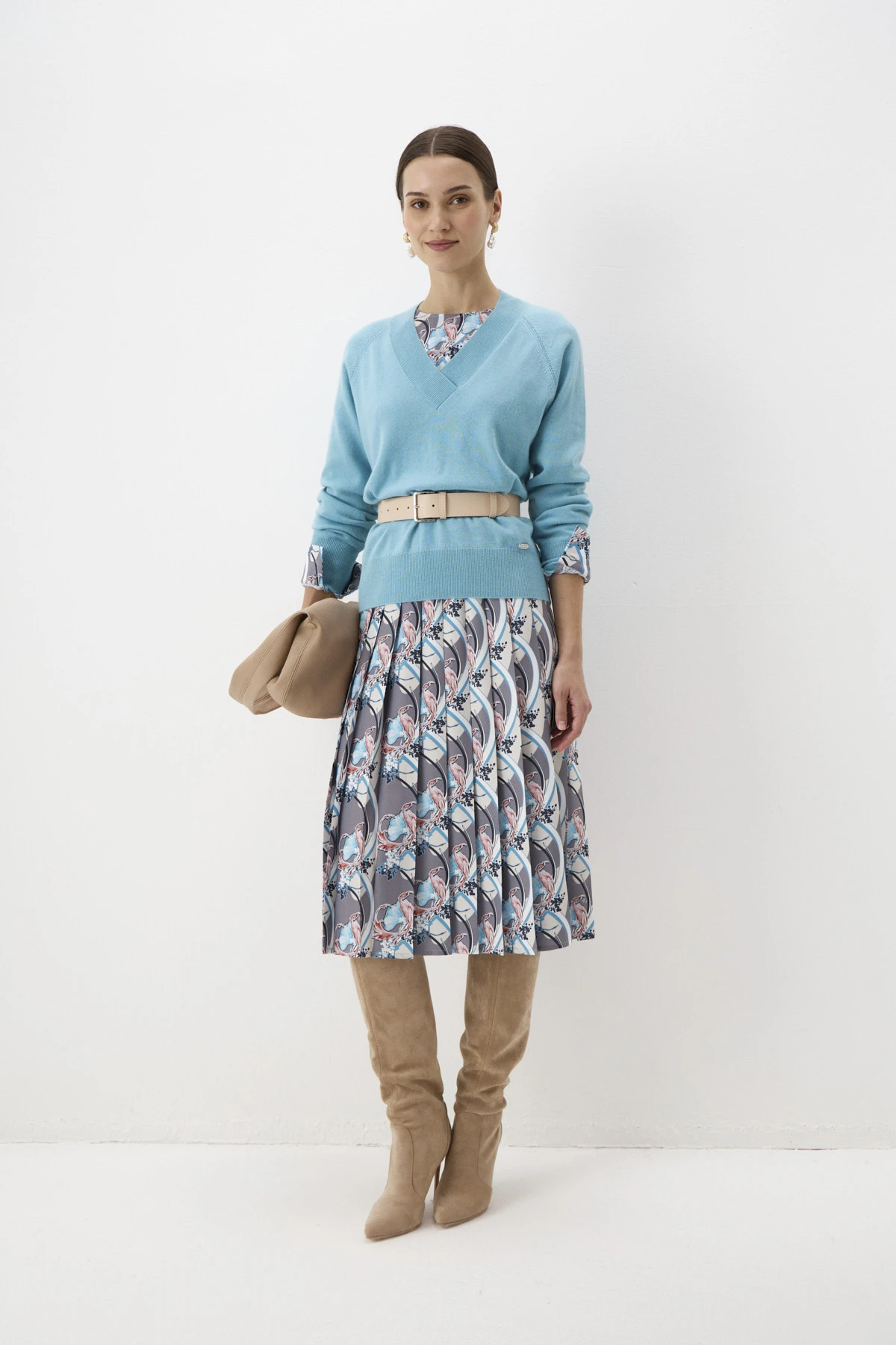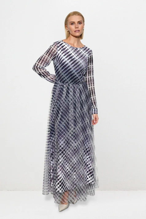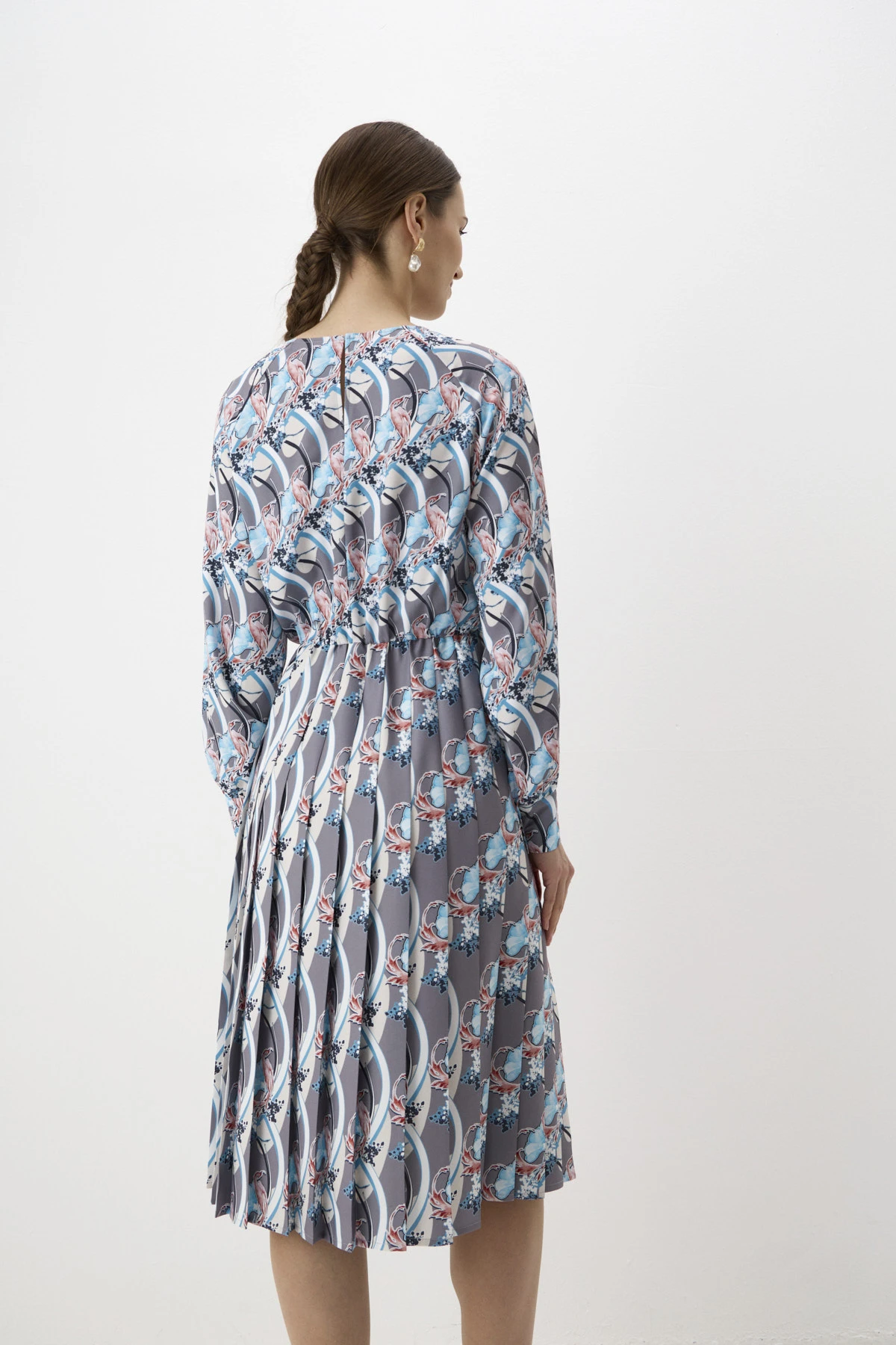 Эффектное платье из тактильно приятной ткани и комфортным кроем, подчёркивающим достоинства фигуры. Односторонние складки на юбке А-силуэта создают эффектный объём. Таинственный и яркий принт в лёгкой сюрреалистичной манере открывает перед нами сокровищницы галерей Эрмитажа. Алмазная брошь «Цветущая ветвь», цветы из лепнины и восхитительный механический павлин из знаменитых часов Екатерины II – эстетическое воплощение эпохи. Благодаря палитре контрастных цветов – терракотовый, бирюзовый, песочный, белый, серый – платье станет основой образа для обладательниц разных цветотипов и по-разному «заиграет», стоит лишь добавить к нему пояс или другой аксессуар.