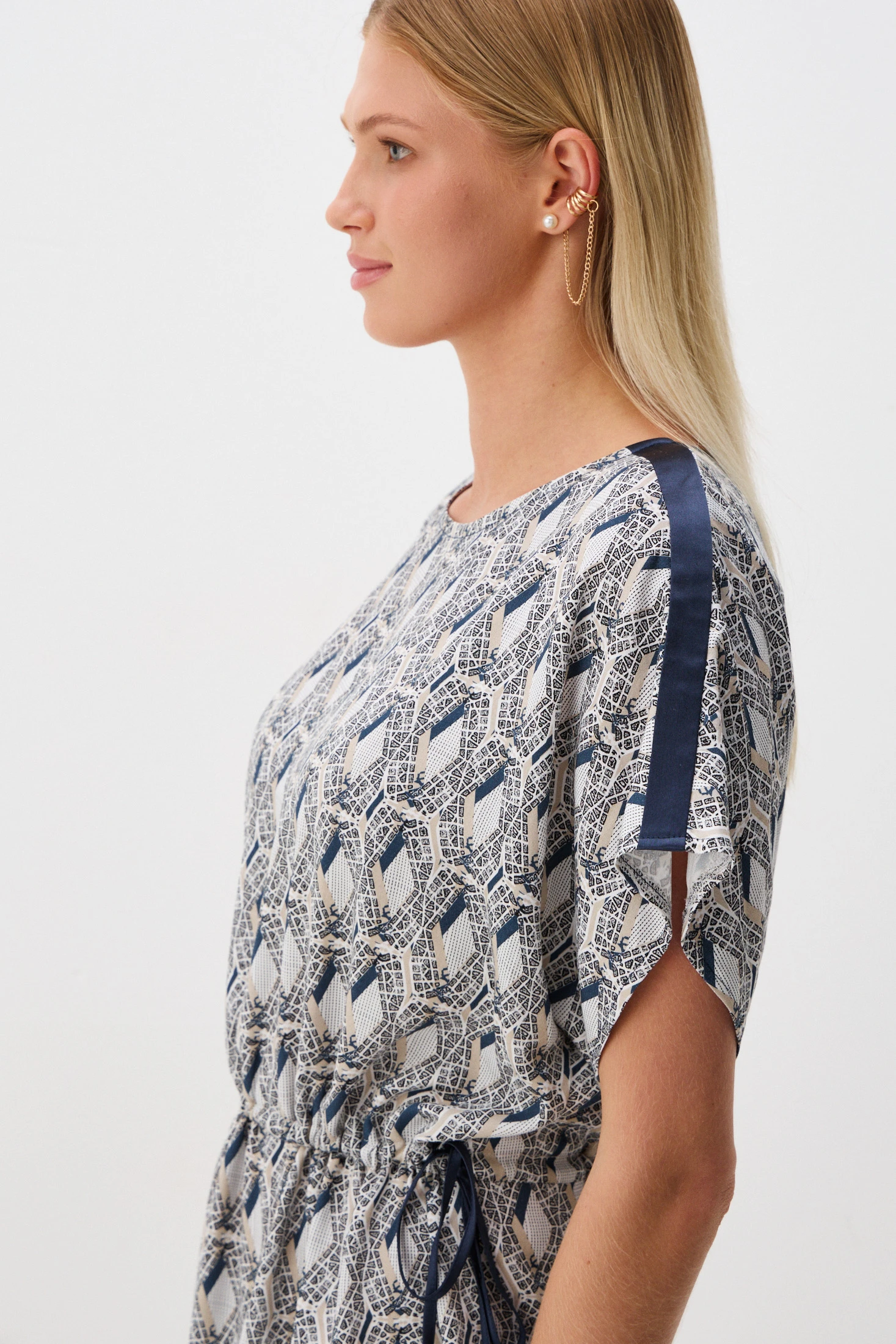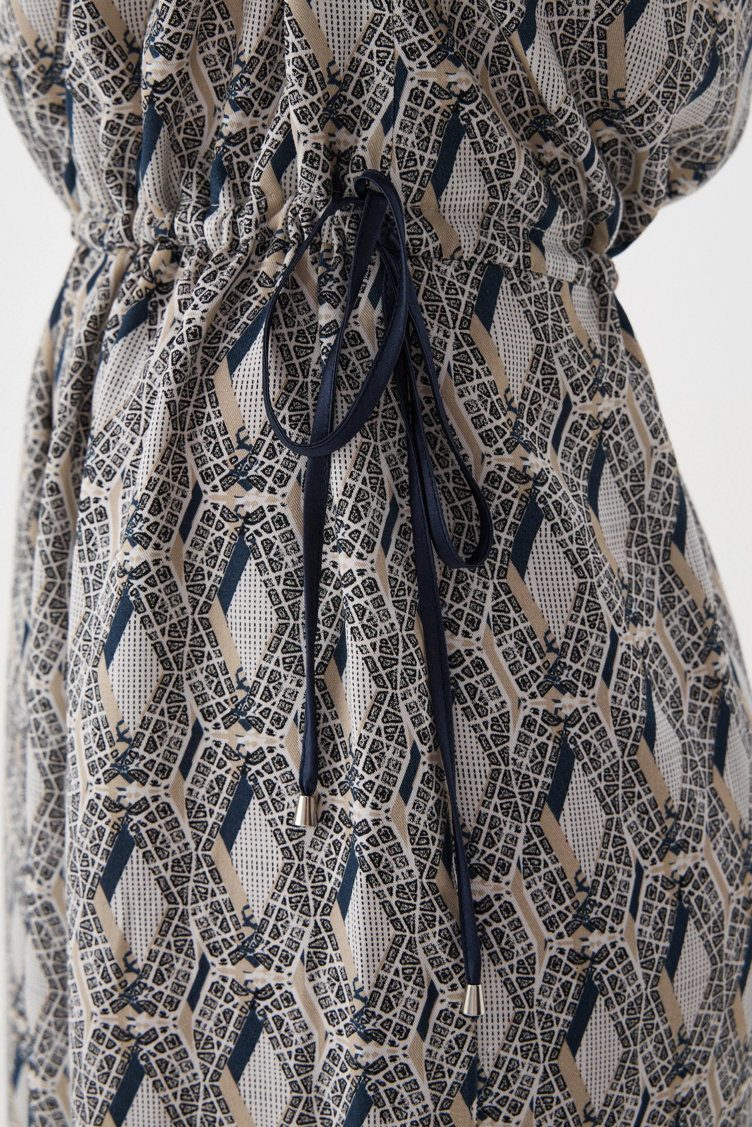 Абстрактный геометричный авторский принт в синих и песочных оттенках изображает перед нами Летний сад с высоты птичьего полёта: элементы карты, словно витраж, складываются в единую гармоничную картину. Геометрические фигуры, заключённые в ромбы в 3D-обрисовке – не что иное, как элементы карты Летнего сада.