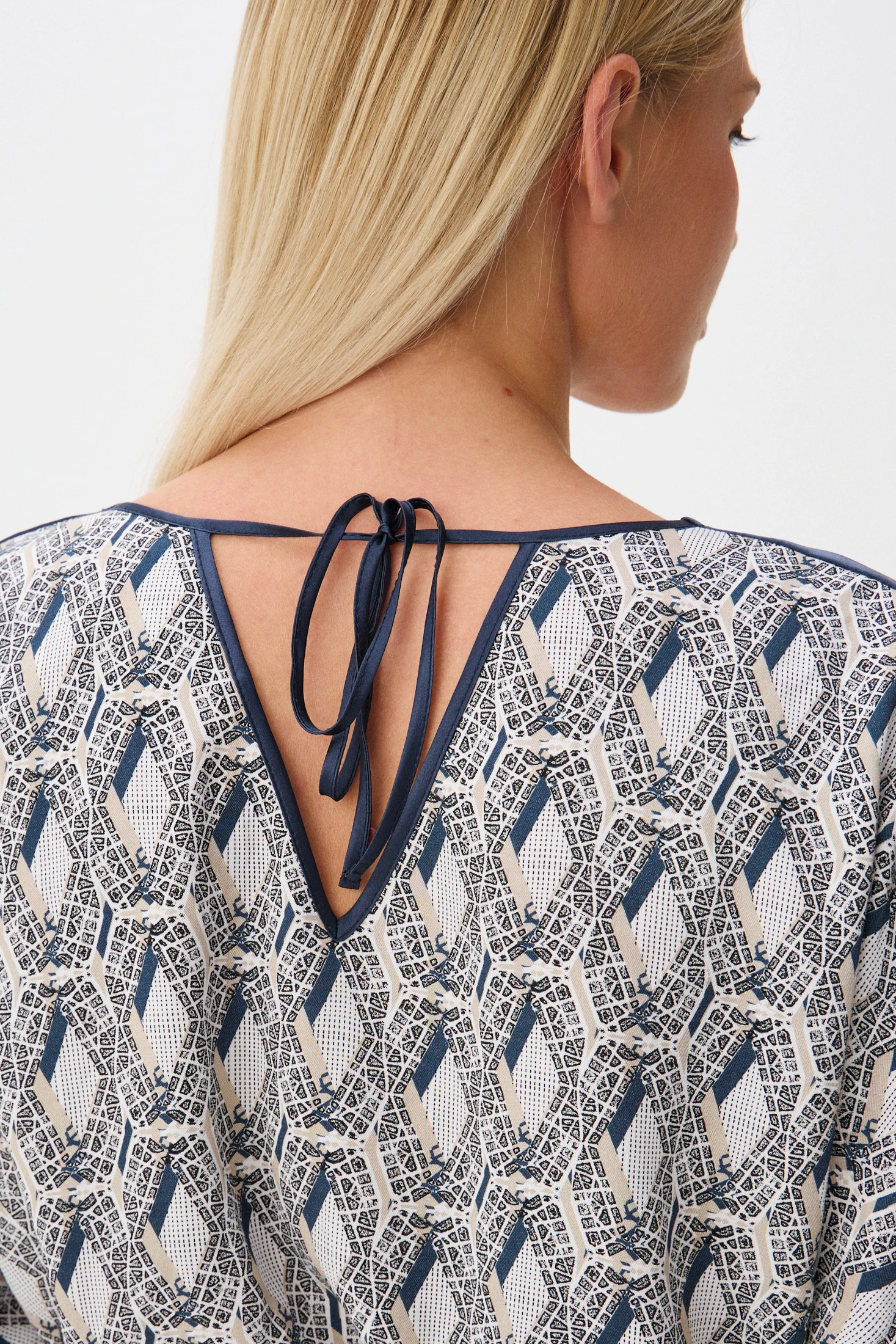 - По переду – круглый вырез горловины, по спинке – глубокий V-образный с контрастными завязками-тесёмками