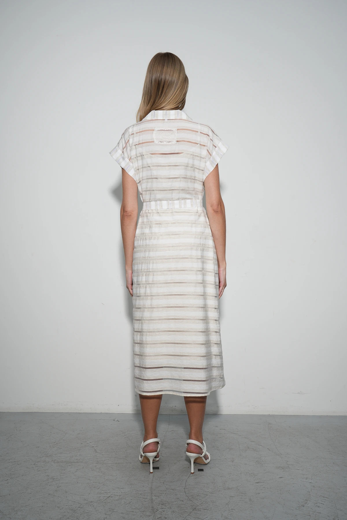 Прямой крой платья длины миди с английским воротником и застёжкой-поло привносит строгий акцент в расслабленный силуэт. Цельновыкроенные рукава малой длины обеспечивают свободу движений и лёгкость.