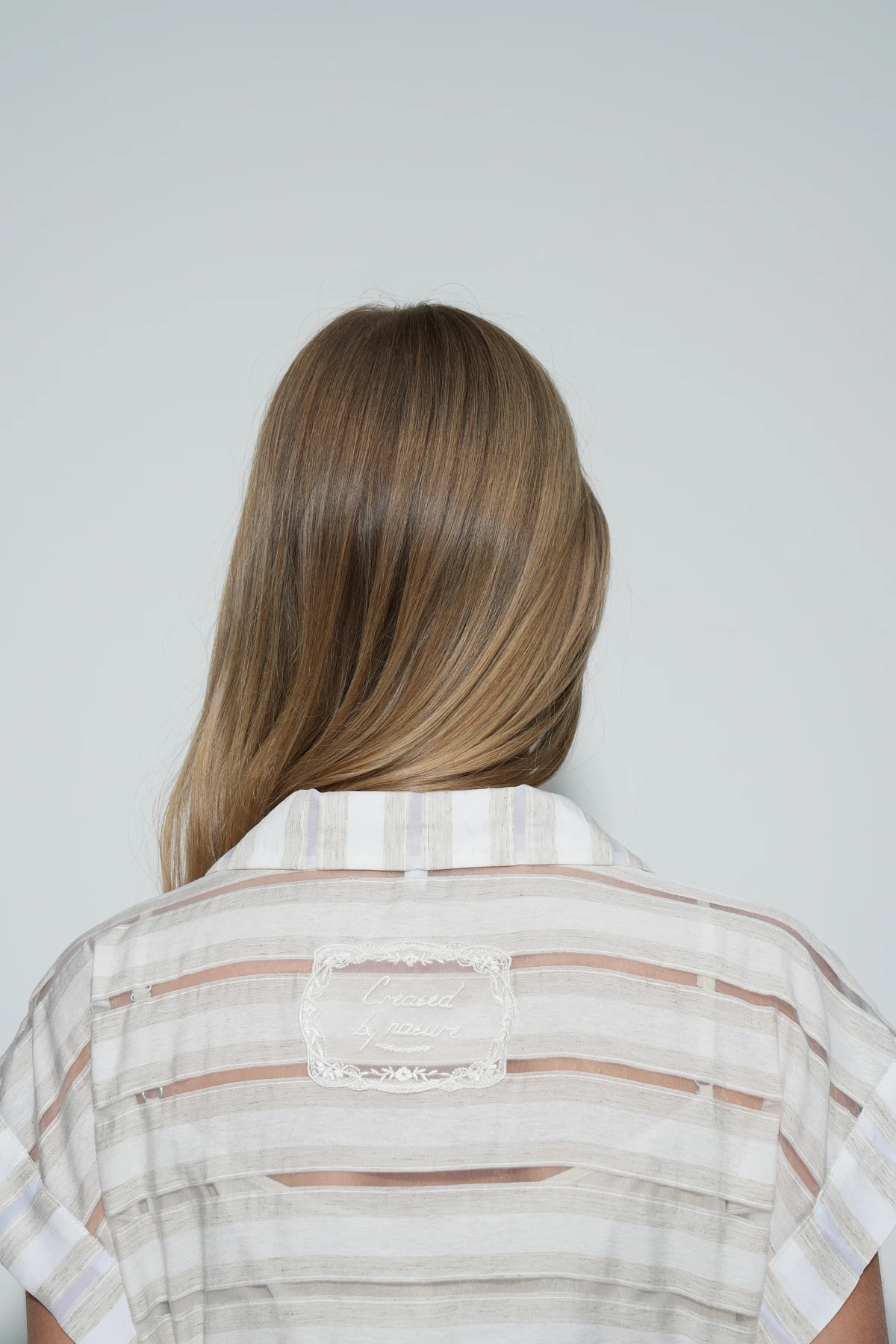 Главноая изюминка модели - авторская вышивка по сетке, напоминающая «патч» с надписью «created by nature» (с англ. «создано природой»), подчёркивающая природное вдохновение модели. Застёжка-поло выполнена на две светлые роговые пуговицы. Модель дополнена поясом из основной ткани.