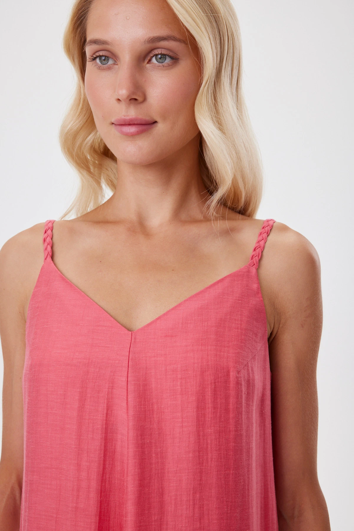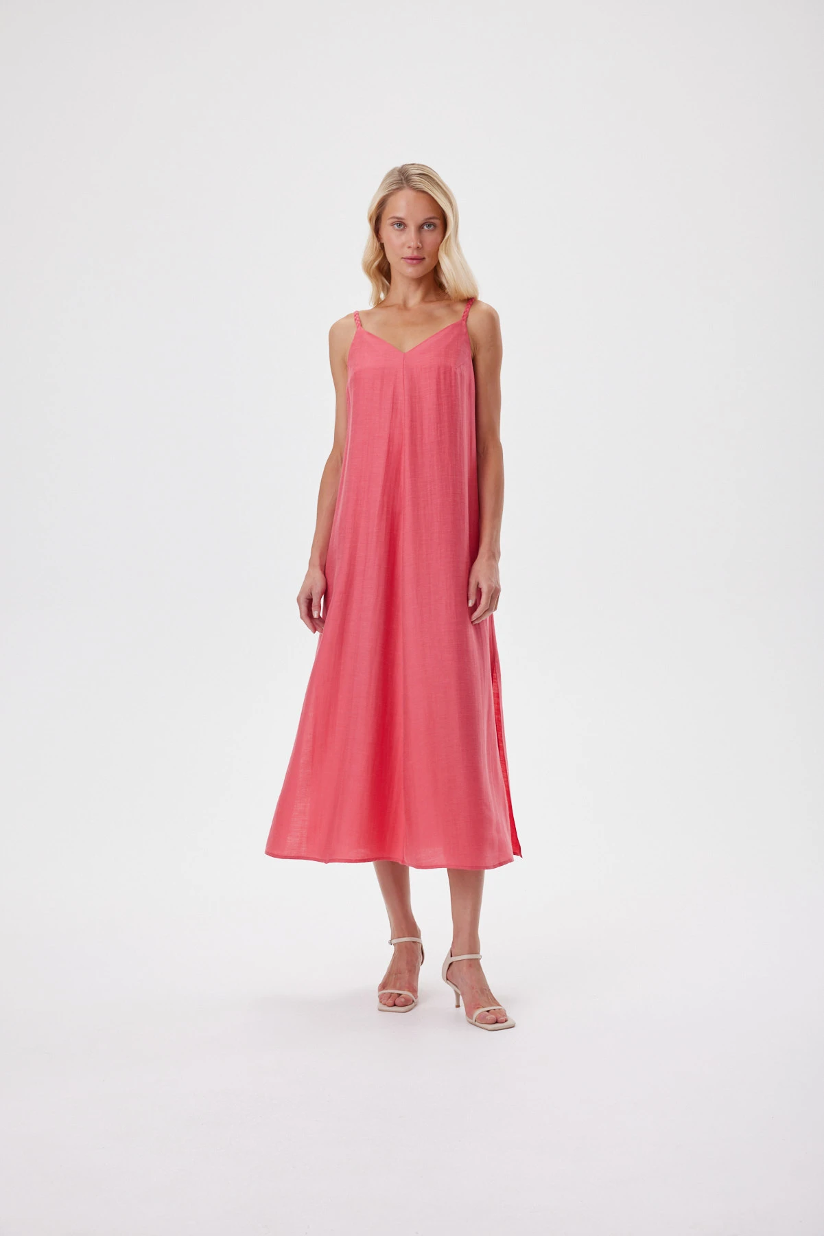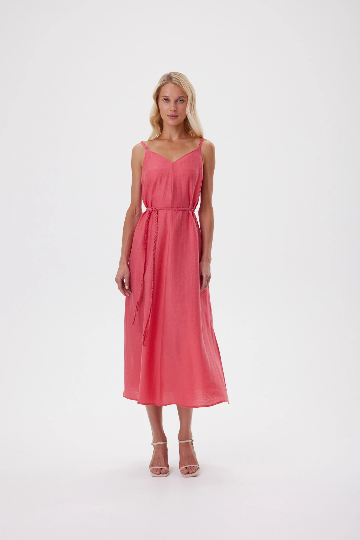 Коралловое платье в расслабленном А-силуэте мягко скользит вдоль тела и создаёт лёгкую, воздушную вертикаль. Высокие боковые разрезы добавляют шагу пластичности: подол деликатно раскрывается в движении, делая силуэт визуально стройнее. Уникальности модели добавляют бретели-косы, полностью сплетённые вручную. Каждая коса создаётся отдельно: специалисты контролируют толщину, плотность и ровность переплетения. Смесовый состав из льна и лиоцелла даёт идеальное летнее ощущение. Для дневных образов платье сочетается с плоскими сандалиями, а для вечерних — с каблуком и лаконичными украшениями.