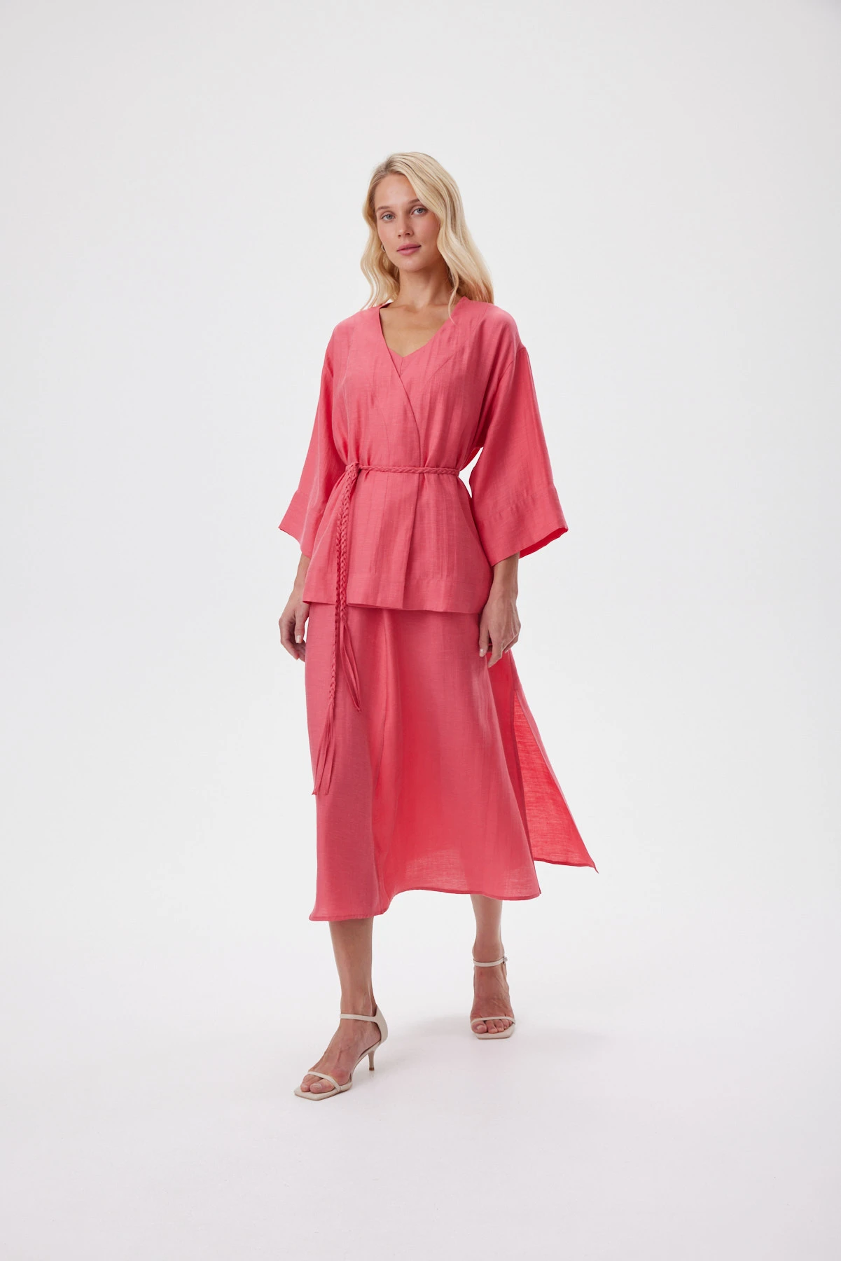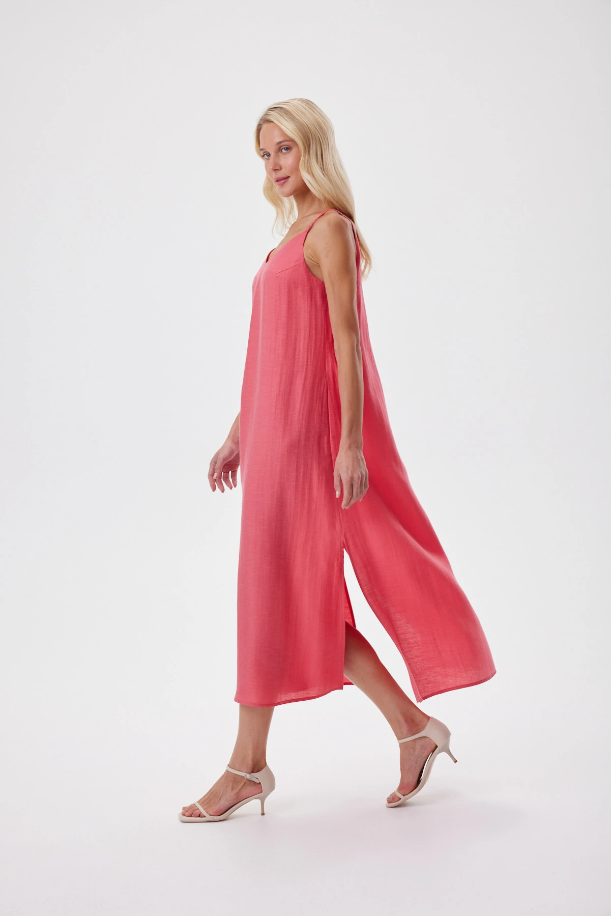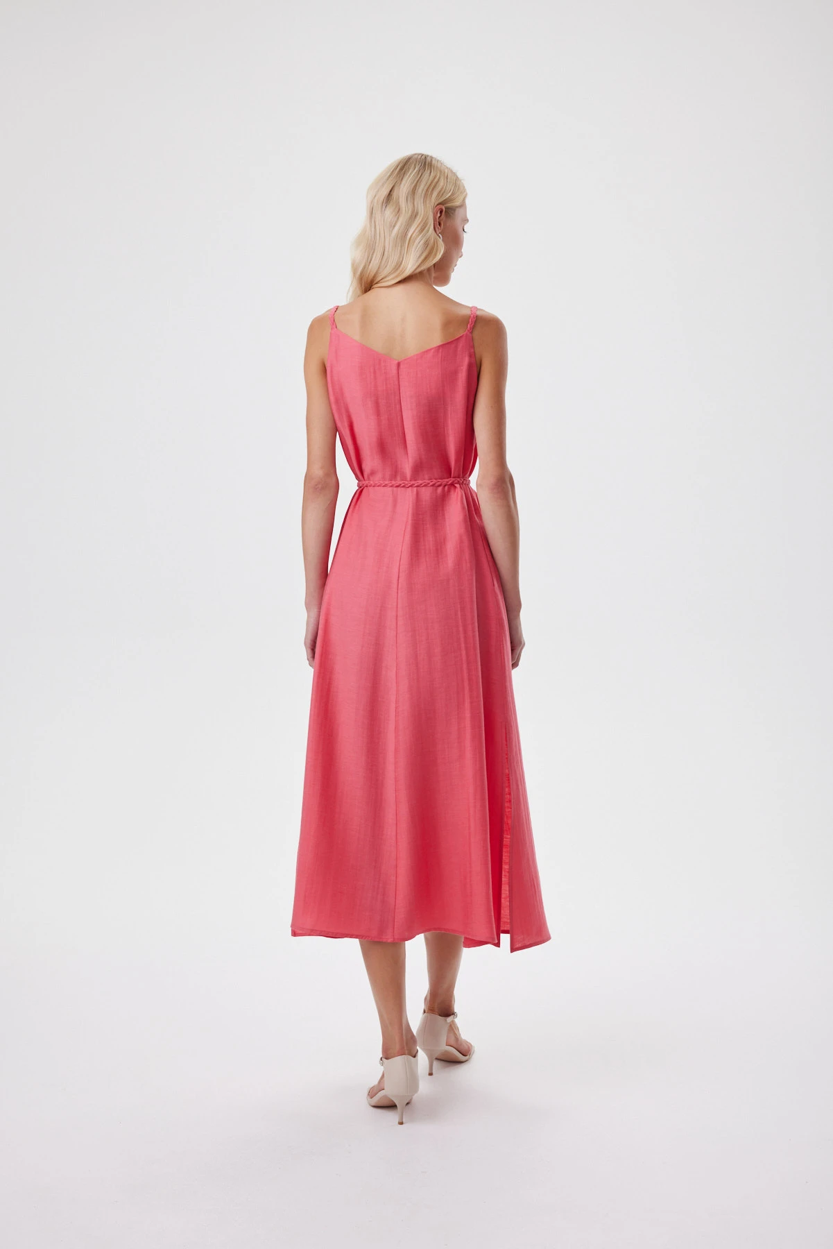 Коралловое платье в расслабленном А-силуэте мягко скользит вдоль тела и создаёт лёгкую, воздушную вертикаль. Высокие боковые разрезы добавляют шагу пластичности: подол деликатно раскрывается в движении, делая силуэт визуально стройнее. Уникальности модели добавляют бретели-косы, полностью сплетённые вручную. Каждая коса создаётся отдельно: специалисты контролируют толщину, плотность и ровность переплетения. Смесовый состав из льна и лиоцелла даёт идеальное летнее ощущение. Для дневных образов платье сочетается с плоскими сандалиями, а для вечерних — с каблуком и лаконичными украшениями.