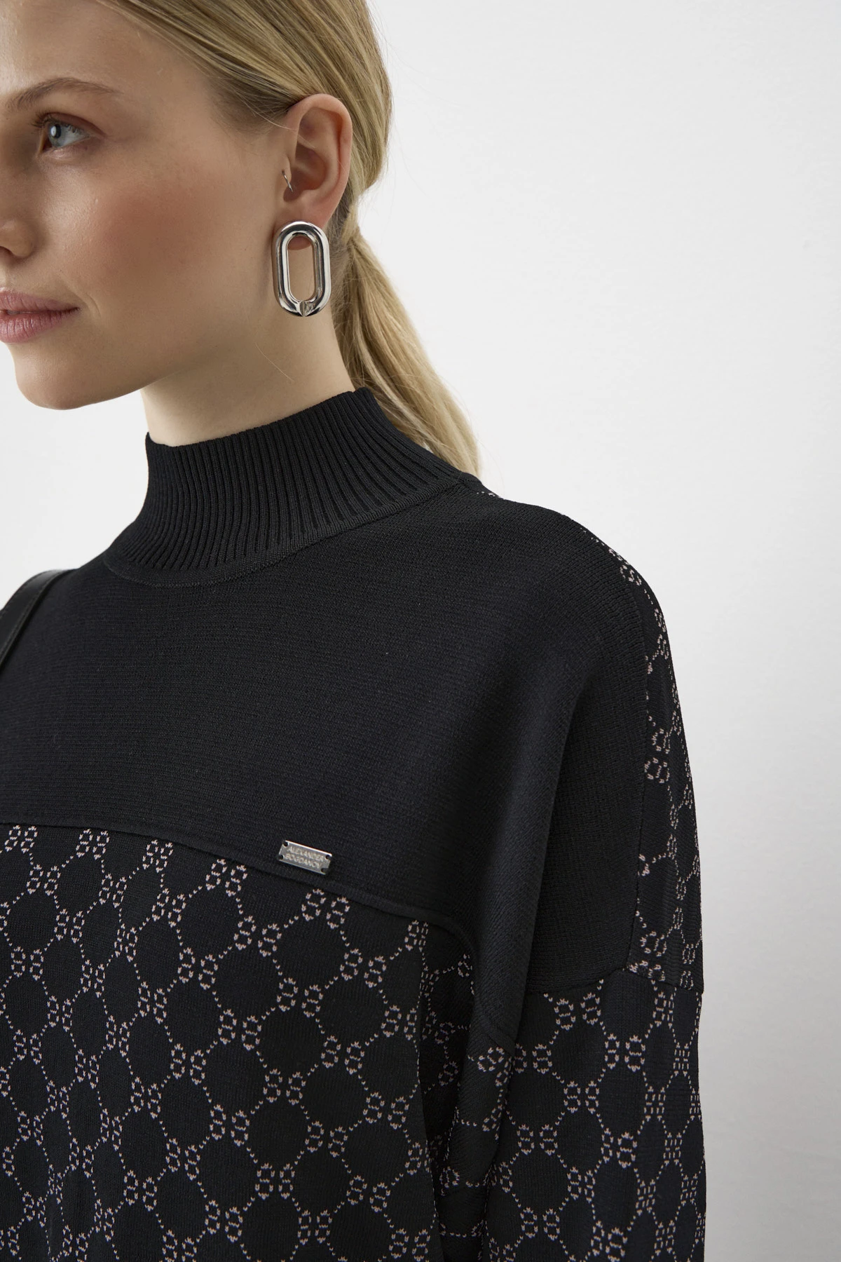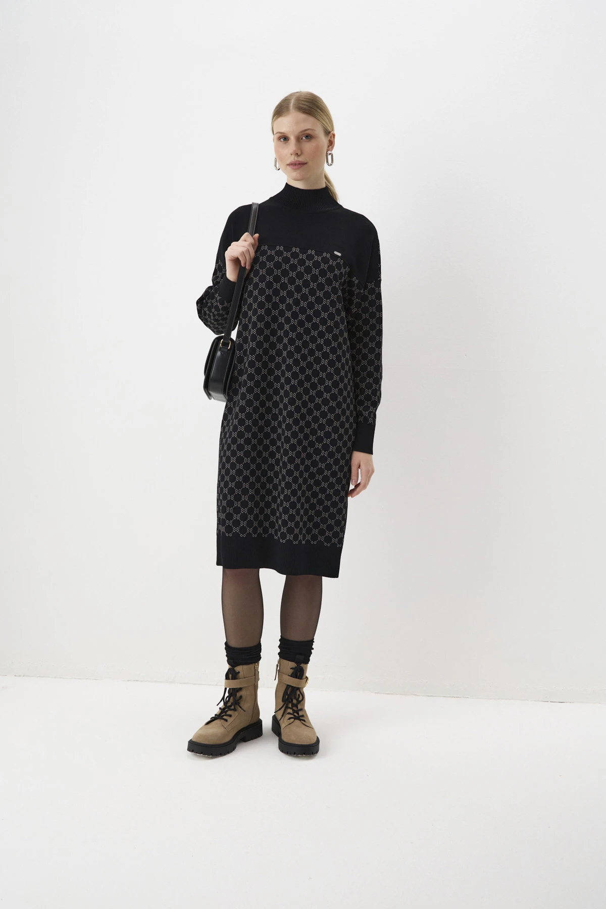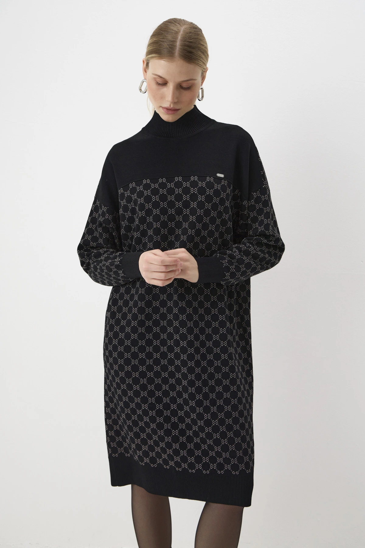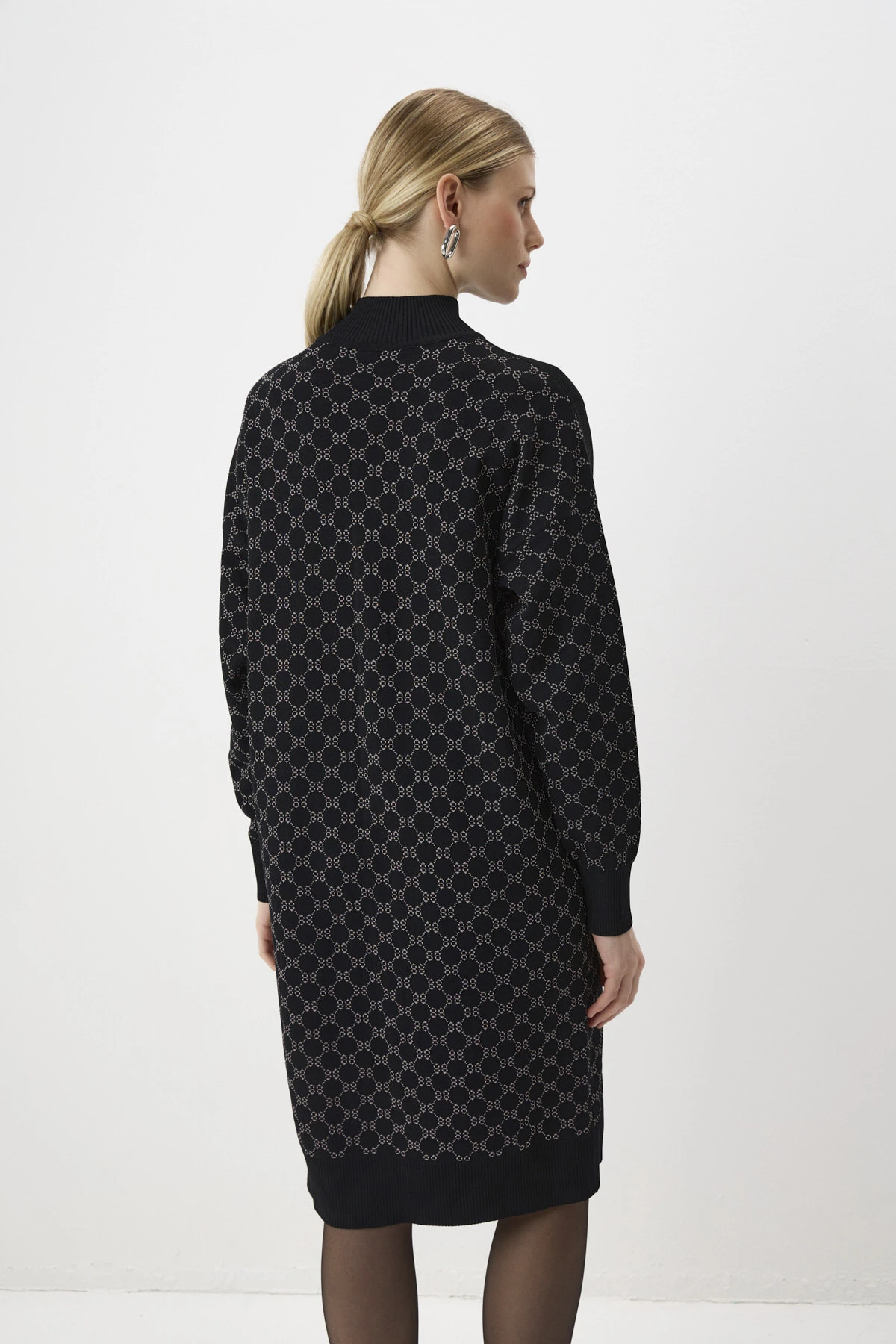 Трикотажное платье – must have холодного сезона! Модель выполнена из трикотажного полотна на основе вискозы. Вывязанный на фоне глубокого оттенка «затмение» узор в нежном оттенке «пралине» сочетает в себе полифонию смыслов - монограмма «88» символизирует год создания бренда и магическую бесконечность. Монохромное решение в портретной зоне подчёркивает выразительность черт лица. Воротник-стойка, манжеты рукавов и низ платья оформлены монохромной бейкой в «рубчик». По переду – брендированная фурнитура из шлифованного металла.