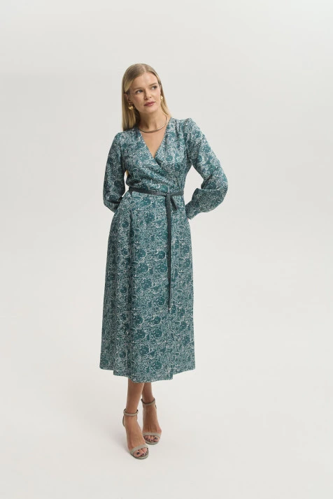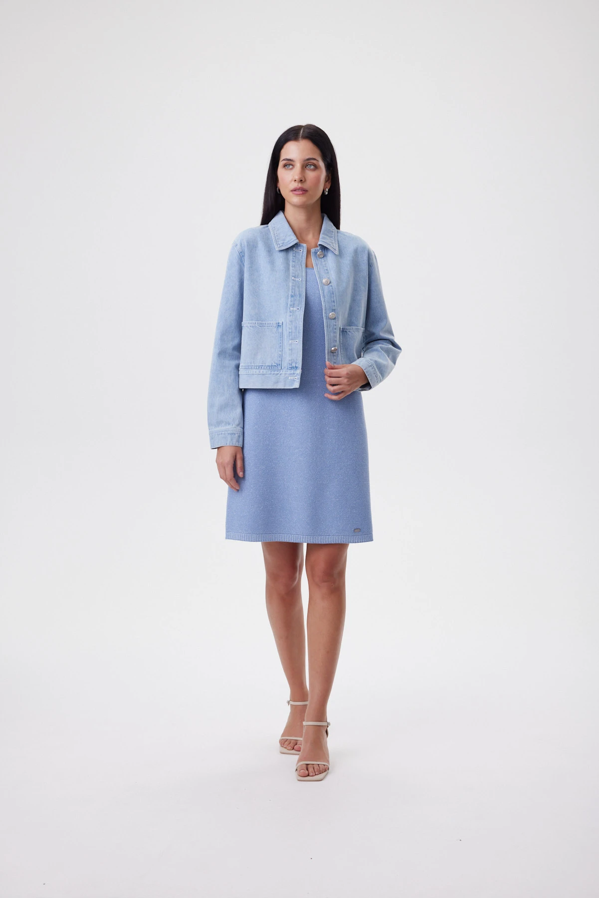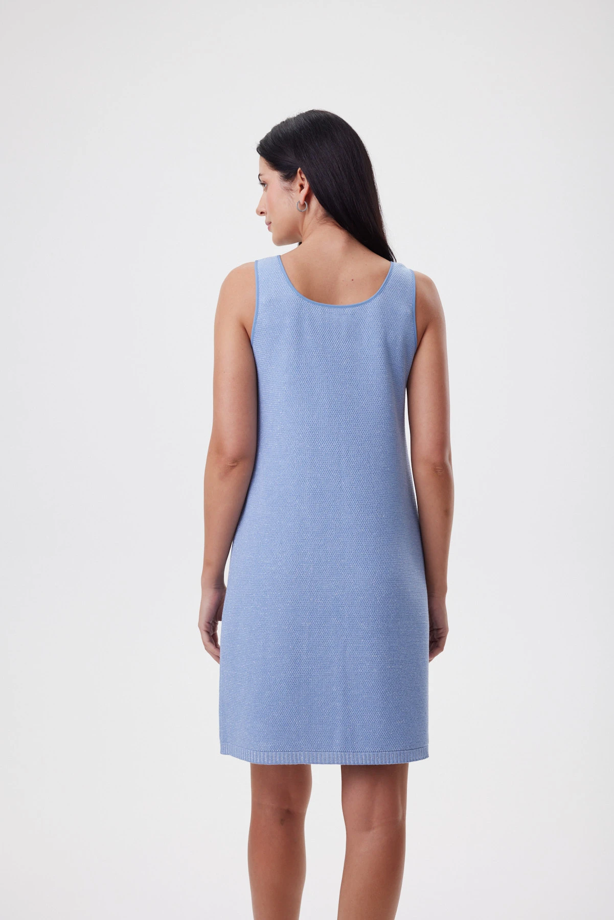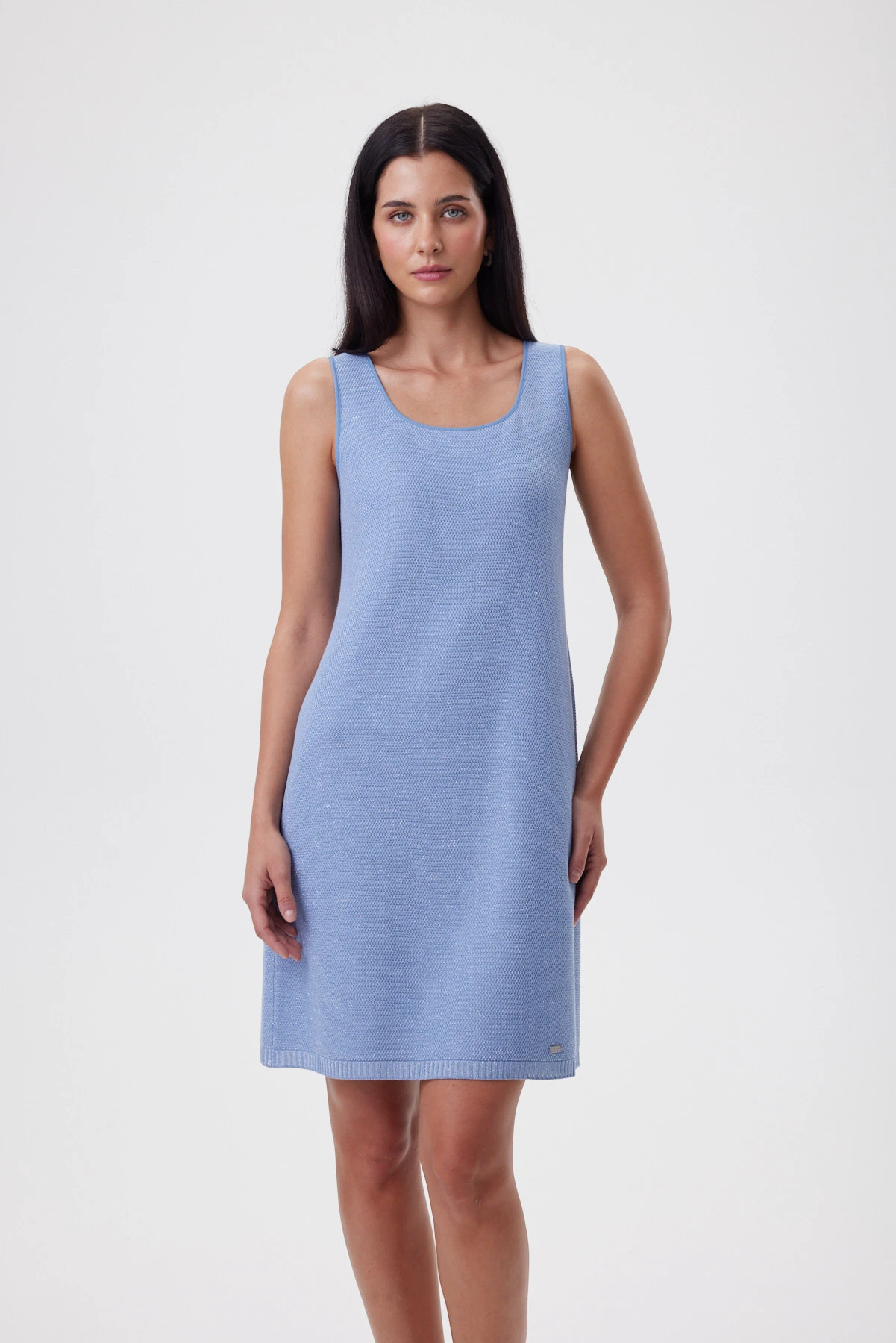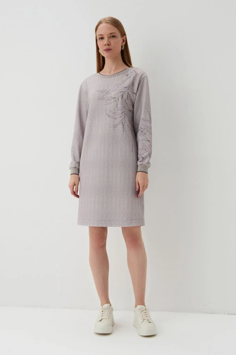 Трикотаж вязаного платья имеет продуманную толщину и вес — полотно не обтекает фигуру, а мягко формирует силуэт, скрывая то, что не нужно подчёркивать. Лёгкое А-силуэтное расширение балансирует пропорции. Фактура трикотажа выверена до нюансов: полотно мягкое, но стабильное — держит форму, не вытягивается и сохраняет аккуратный вид даже после длительного сидения. Состав работает на эффект и практичность: вискоза дарит нежность, метанит — деликатное внутреннее сияние, акрил стабилизирует петли, а небольшой процент полиэстера повышает износостойкость. Горловина и проймы обработаны тонкими швейными окантовками в тон, благодаря чему края выглядят особенно элегантно.