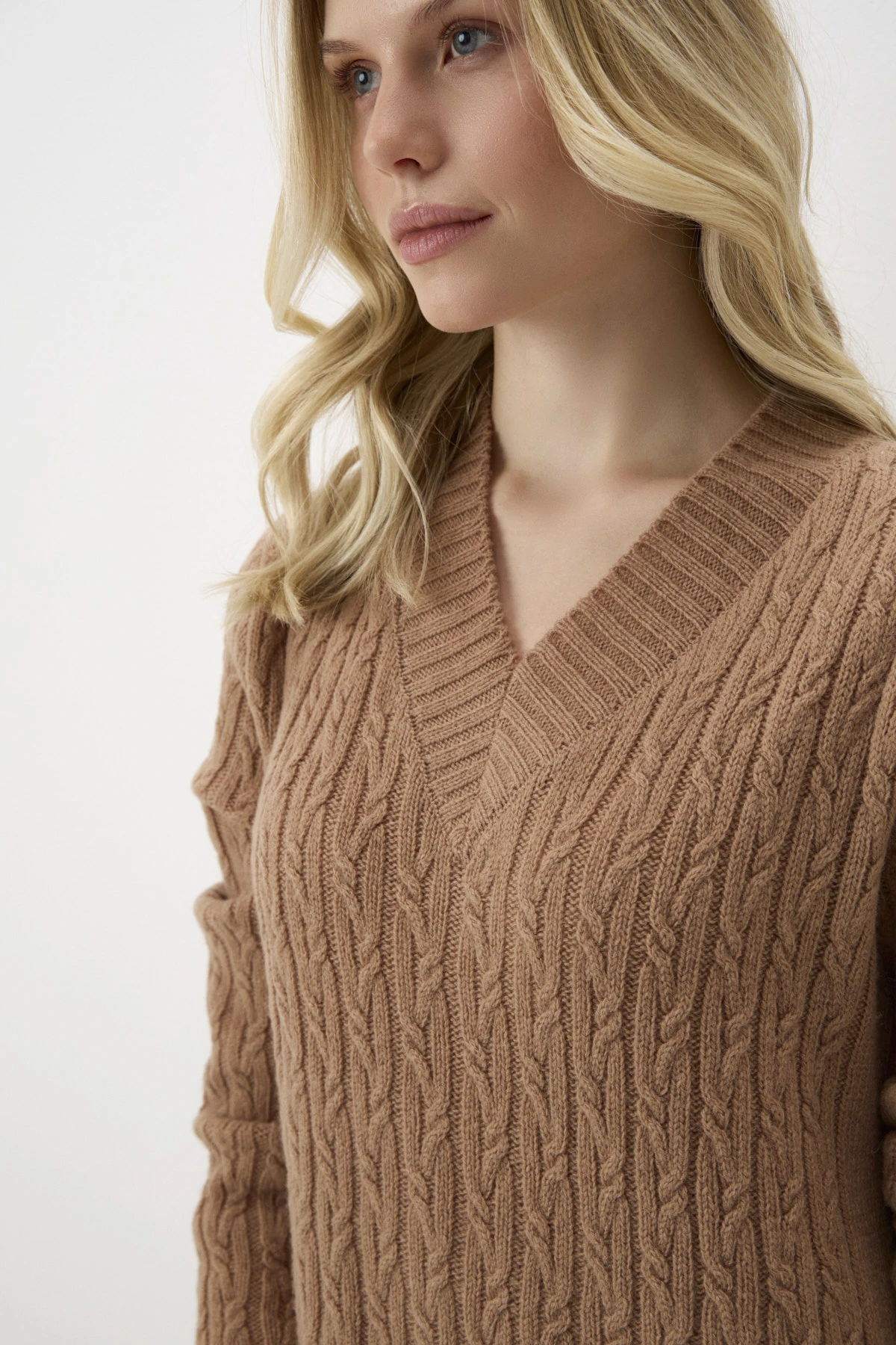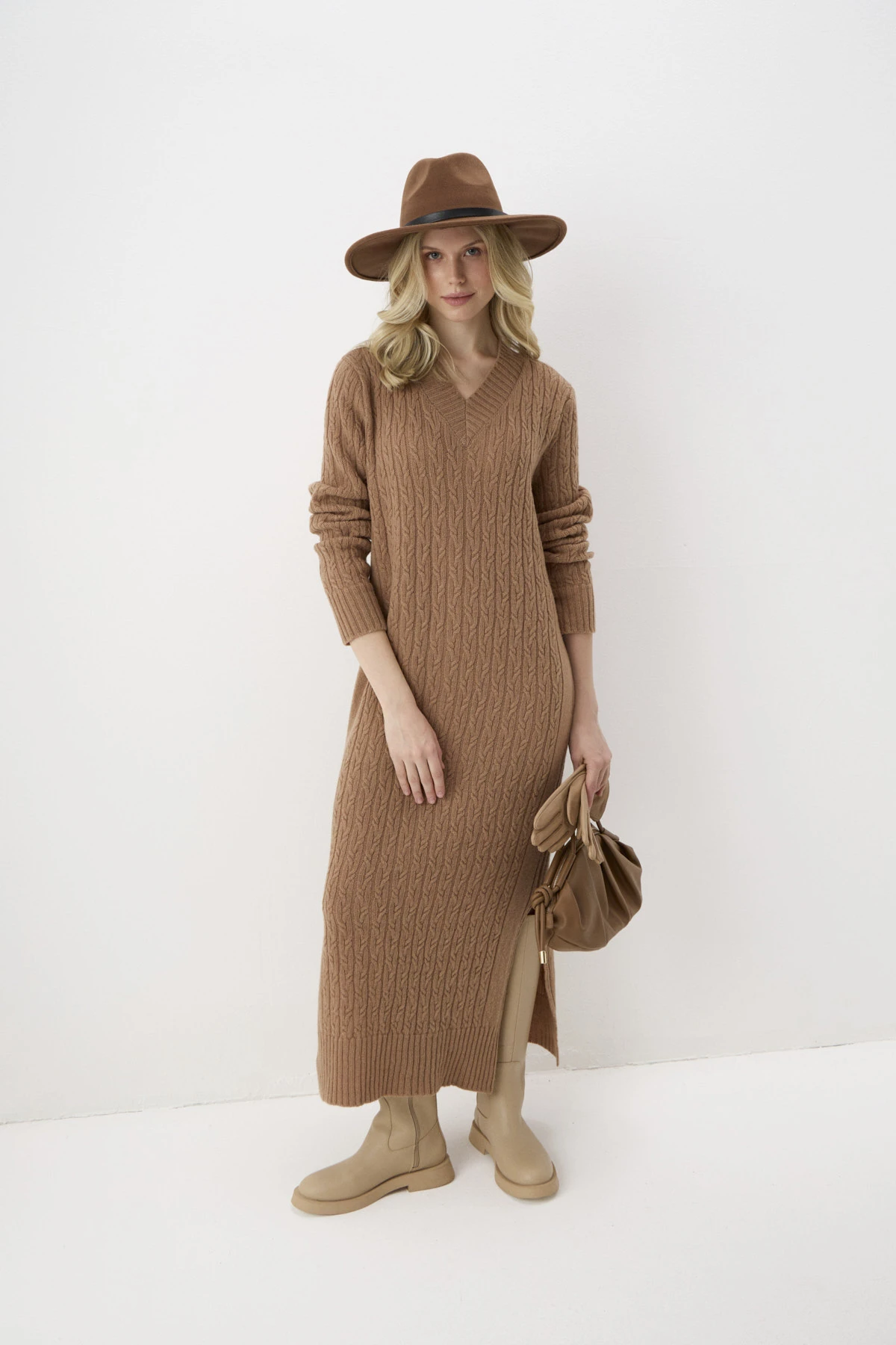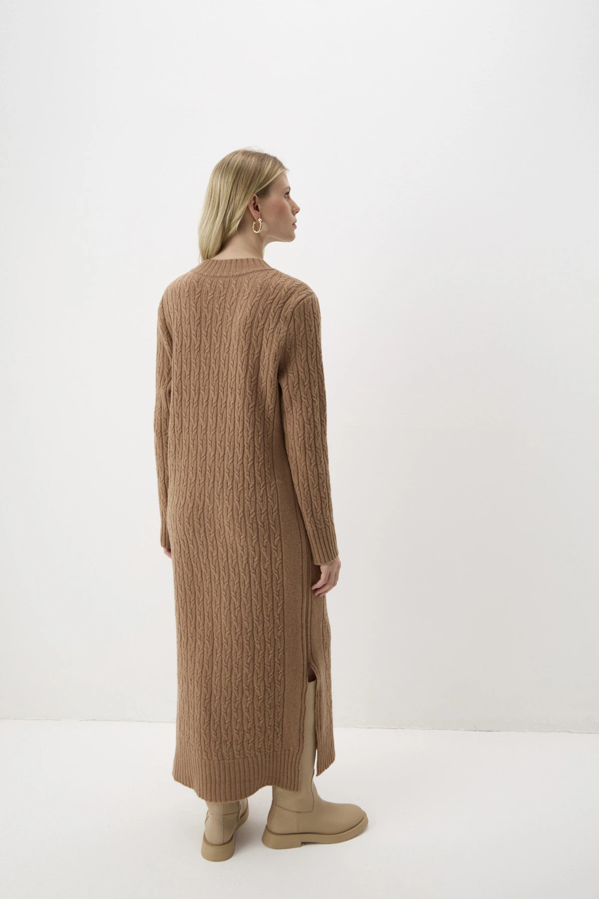 Трикотажное платье-макси создаст уютное настроение. Модель выполнена из натуральной благородной шерсти в оттенке «солёная карамель», который раскрывается в разных типах вязки – гладь, косы и «рубчик». В боковых швах – разрезы для комфорта в движении. V-образный вырез горловины, манжеты рукавов и низ платья оформлены вязкой в «рубчик».