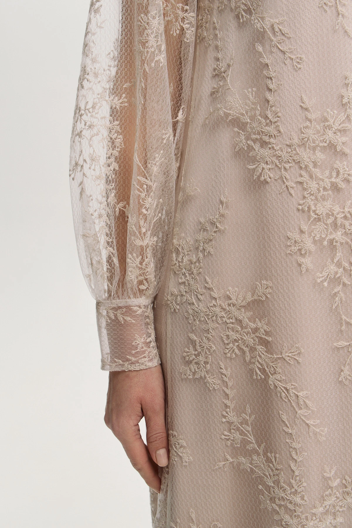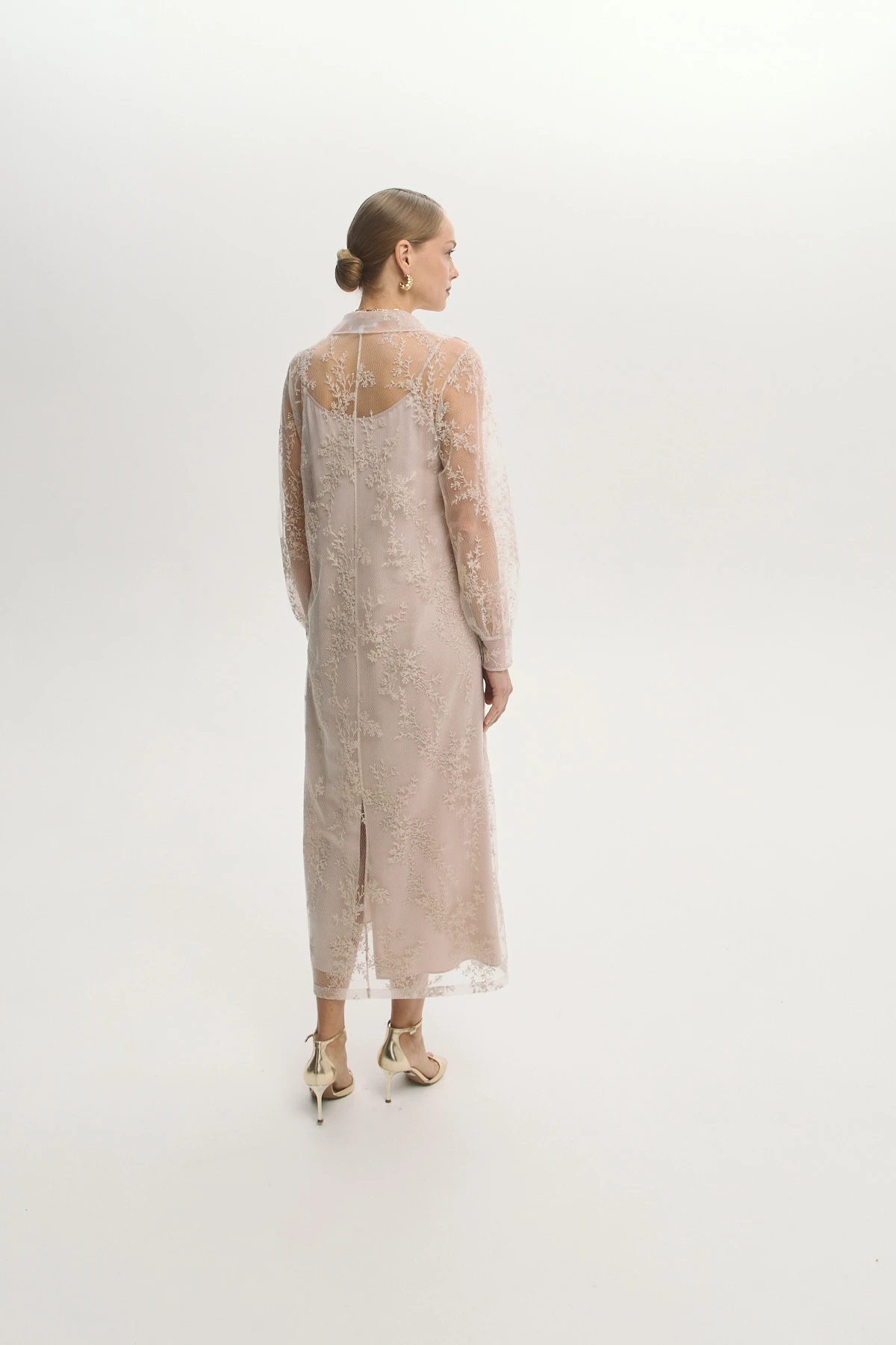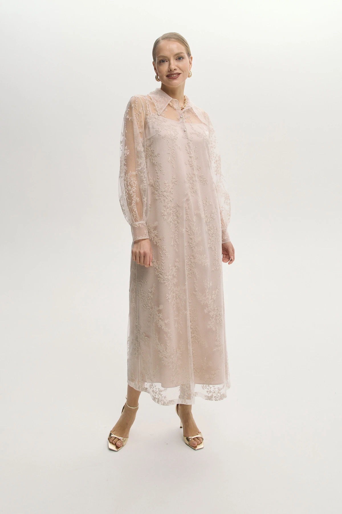 Платье свободного силуэта длины макси – богемное решение для вечернего выхода. Эффектное кружево с изящной вышивкой создаёт утончённый образ. Тончайшая отделка каждого шва придаёт дизайнерский характер модели. Молочный оттенок идеально подчёркивает нежность кожи, делая образ свежим и лёгким. Съёмная комбинация из гигроскопичной вискозы обеспечит комфорт.