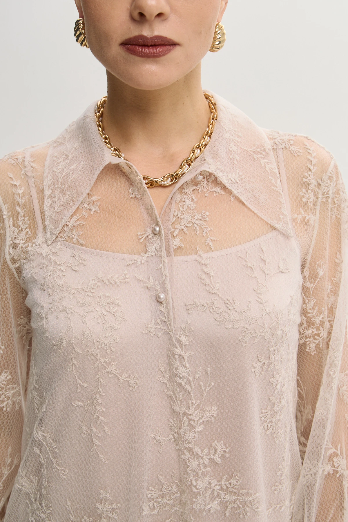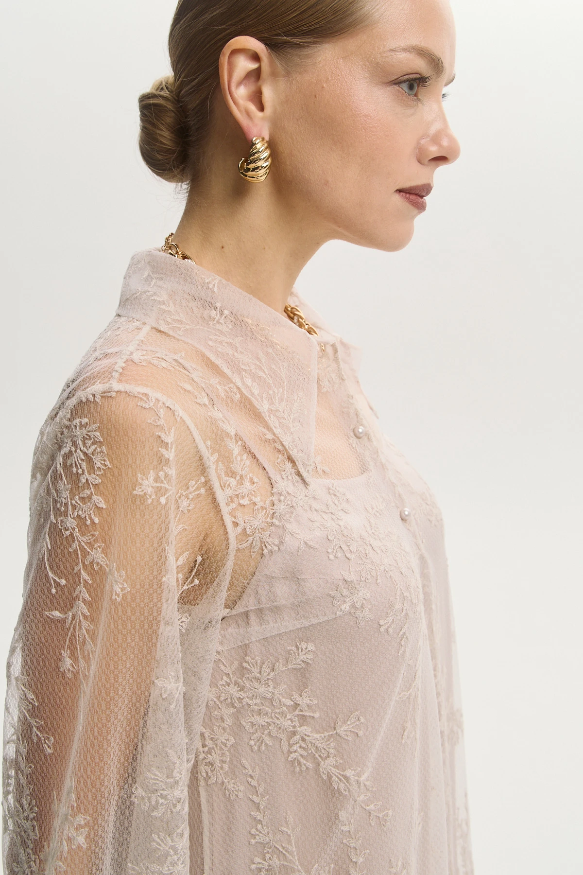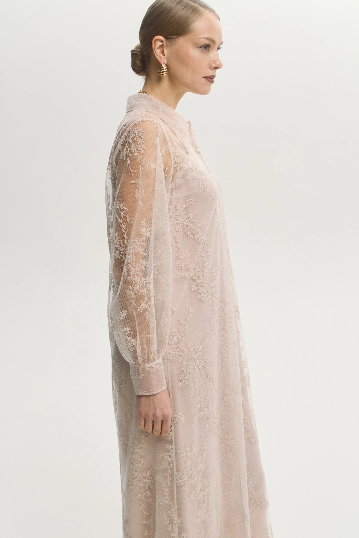 Платье свободного силуэта длины макси – богемное решение для вечернего выхода. Эффектное кружево с изящной вышивкой создаёт утончённый образ. Тончайшая отделка каждого шва придаёт дизайнерский характер модели. Молочный оттенок идеально подчёркивает нежность кожи, делая образ свежим и лёгким. Съёмная комбинация из гигроскопичной вискозы обеспечит комфорт.
