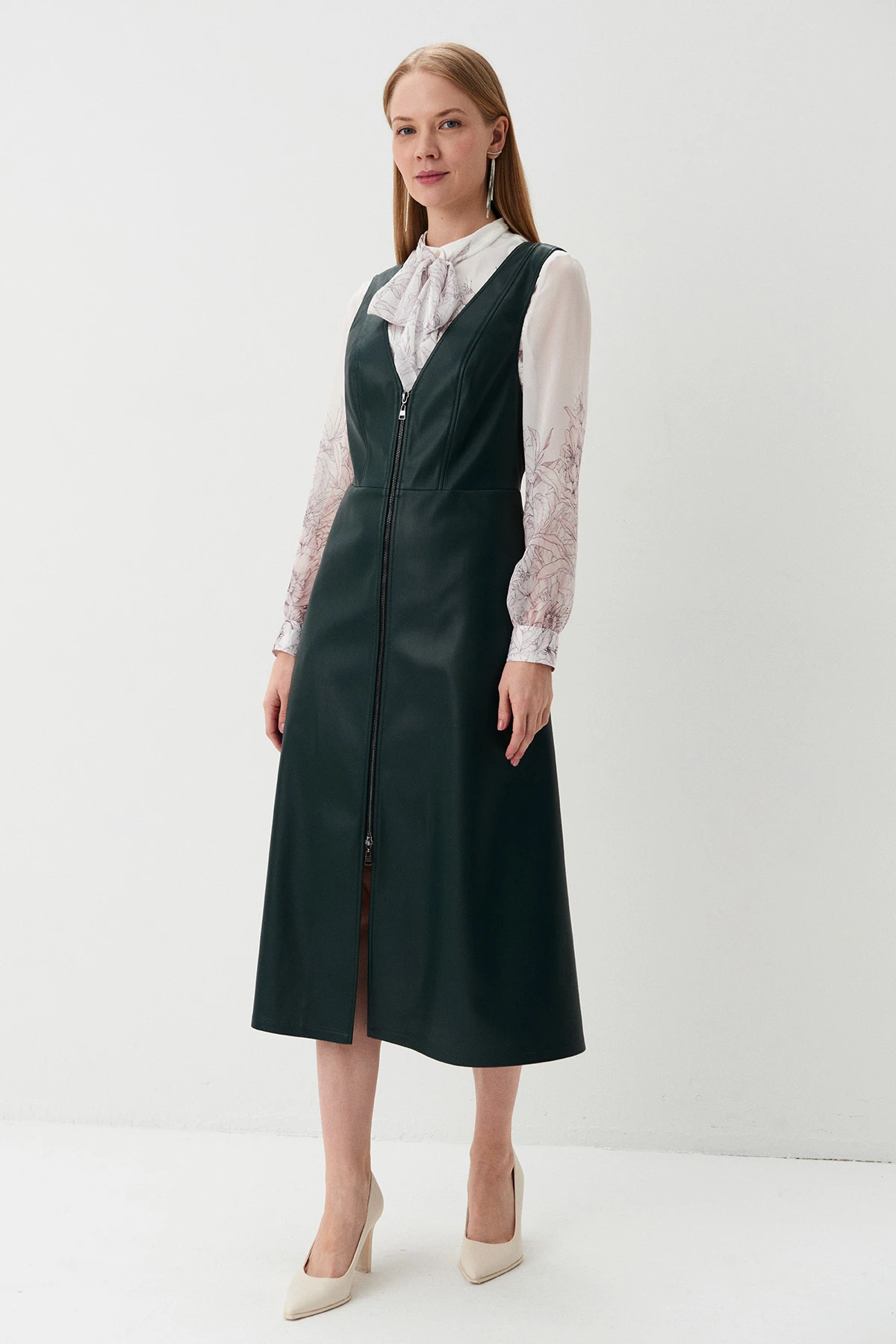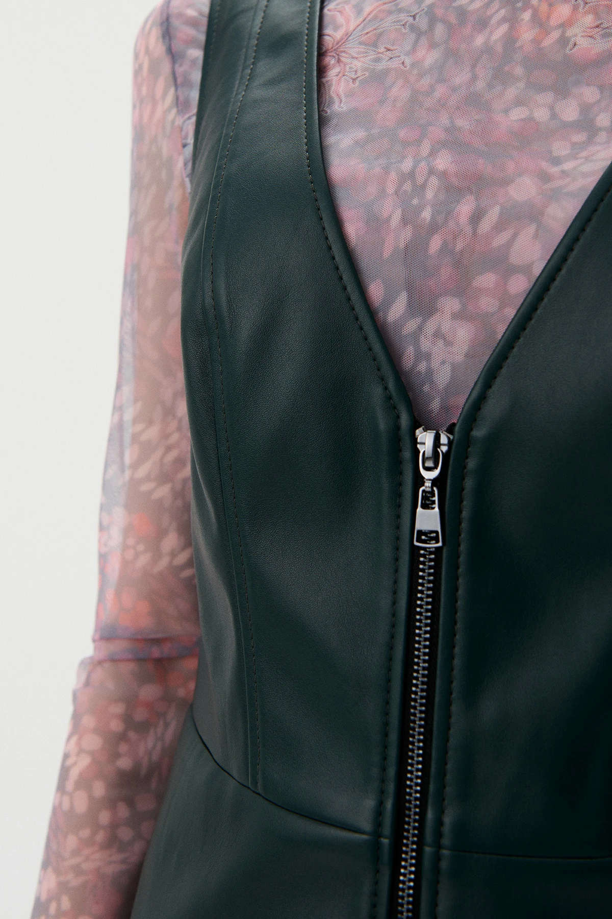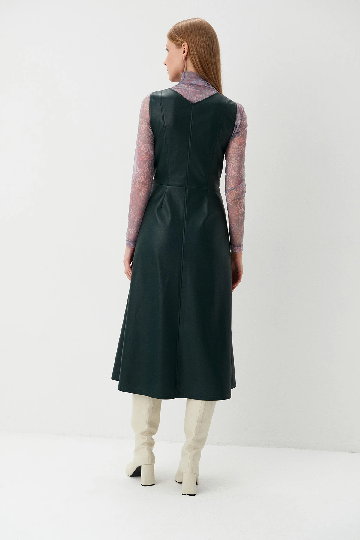 Ткань:Сарафан из экокожи насыщенного тёмно-зеленого оттенка. Экокожа – практичный материал, не требующий стирки. Прочное покрытие из полиуретана не трескается, не деформируется, долговечно и легко в уходе. Подклад из ткани смешанного состава с добавлением вискозы с авторским флоральным принтом.