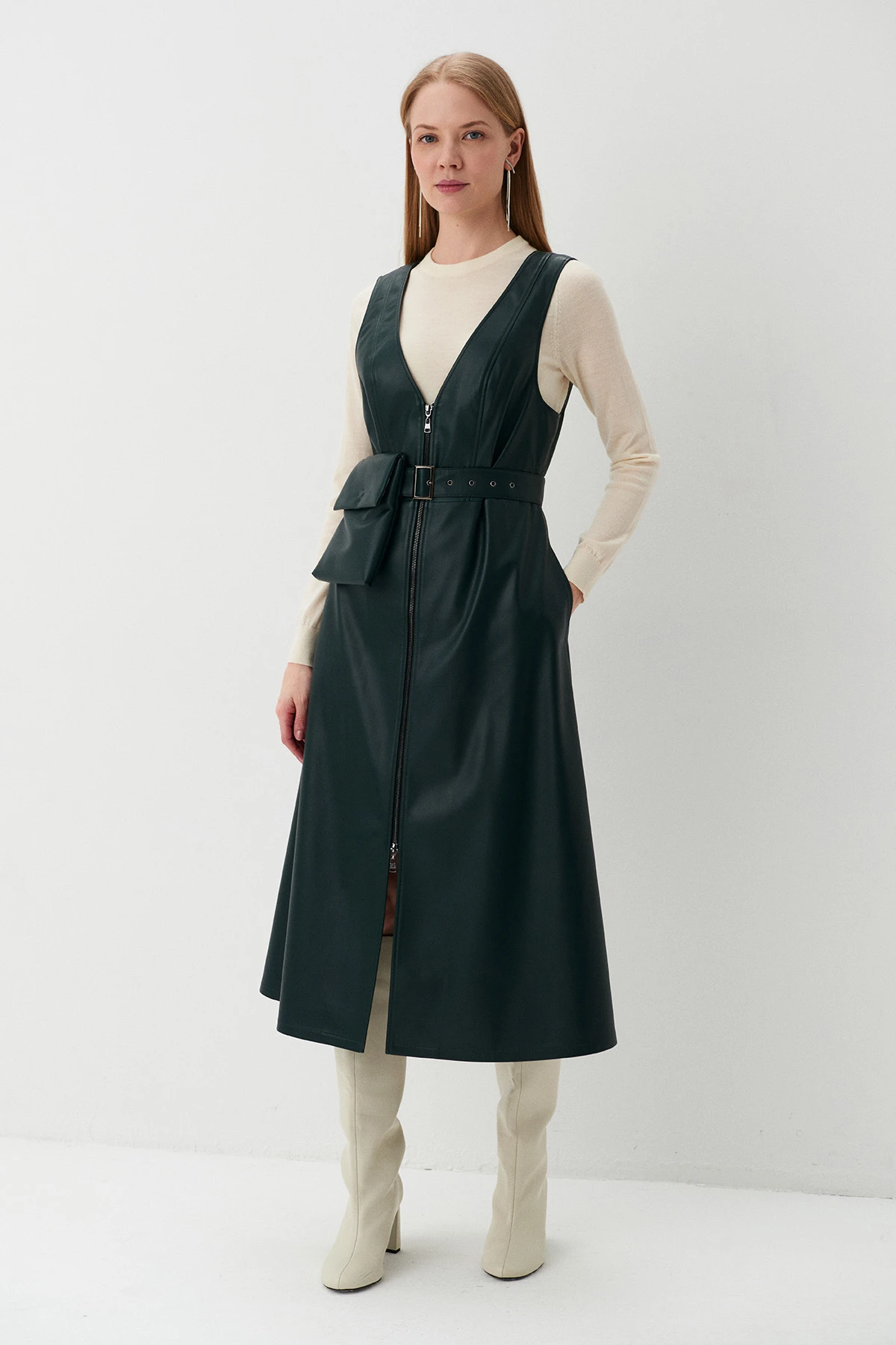 Отделка:Застёжка на двустороннюю молнию из шлифованного металла. Сарафан дополнен поясом с люверсами и чёрной перламутровой пряжкой, а также съёмной сумкой, застёгивающейся на брендированную кнопку.
