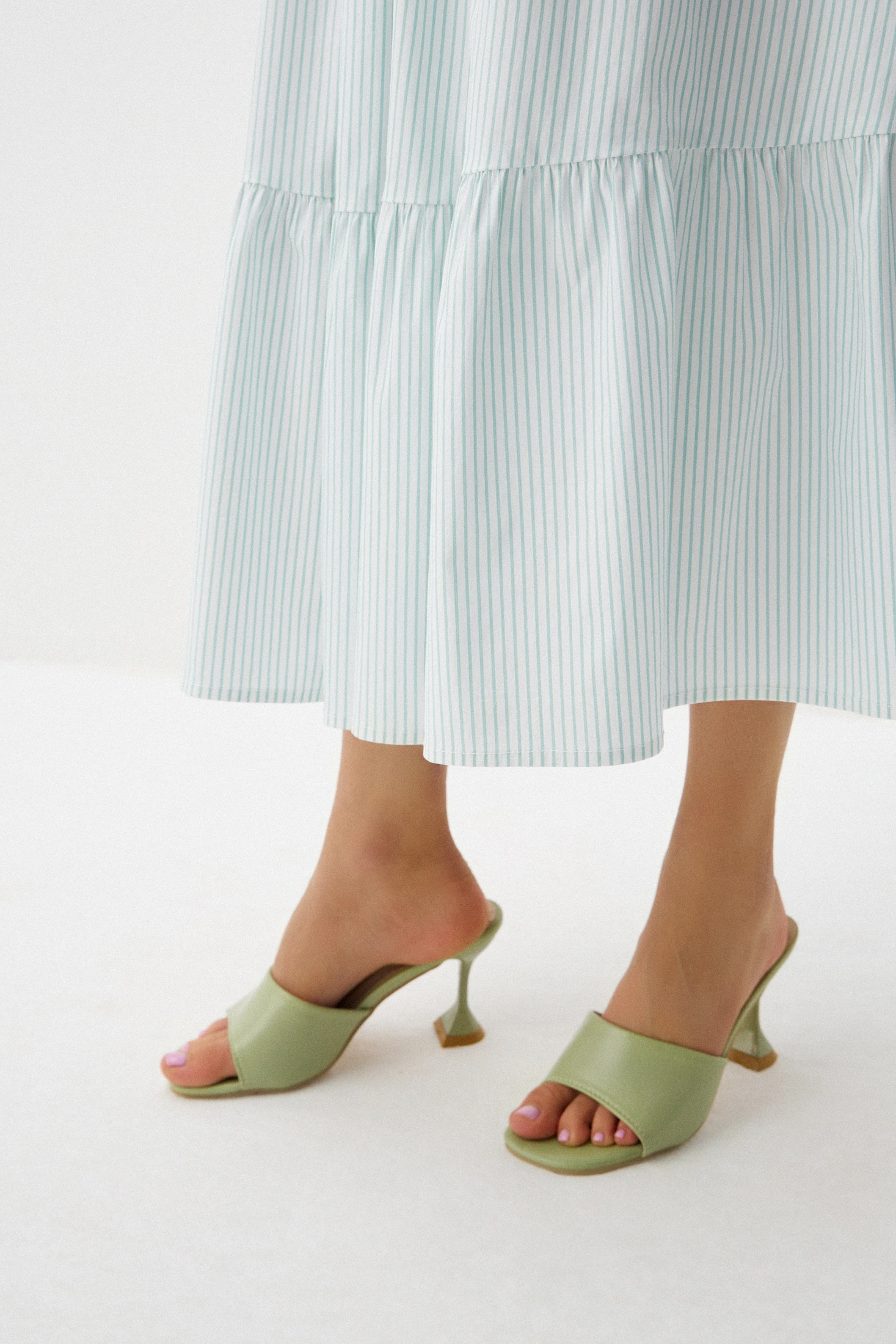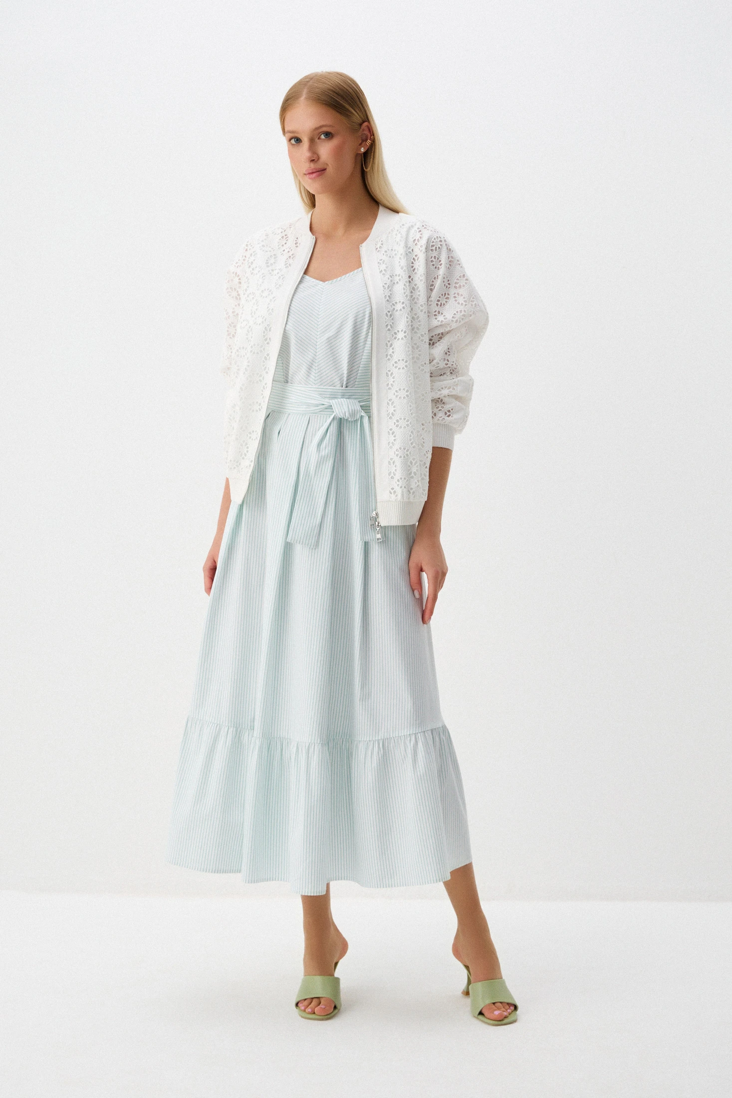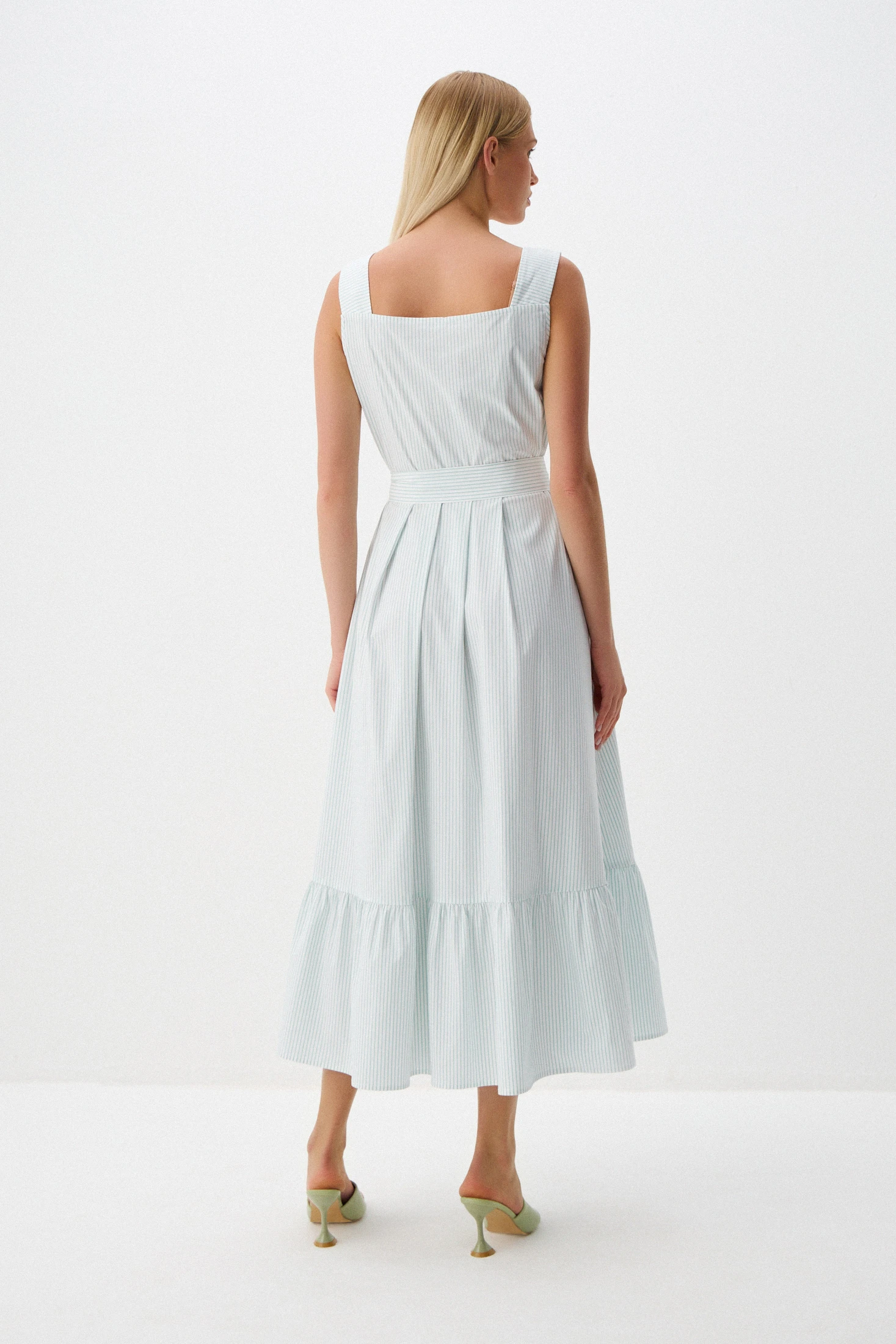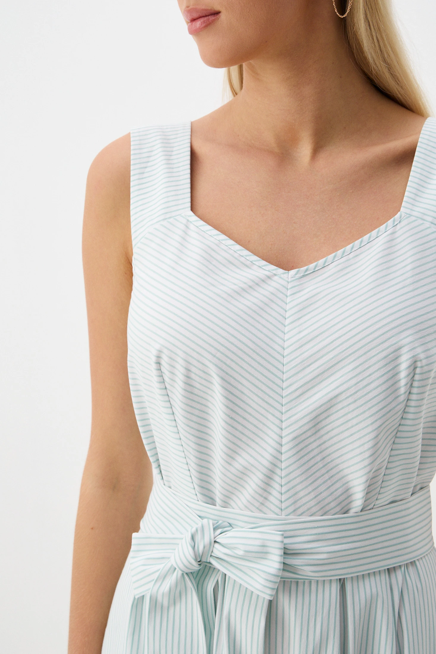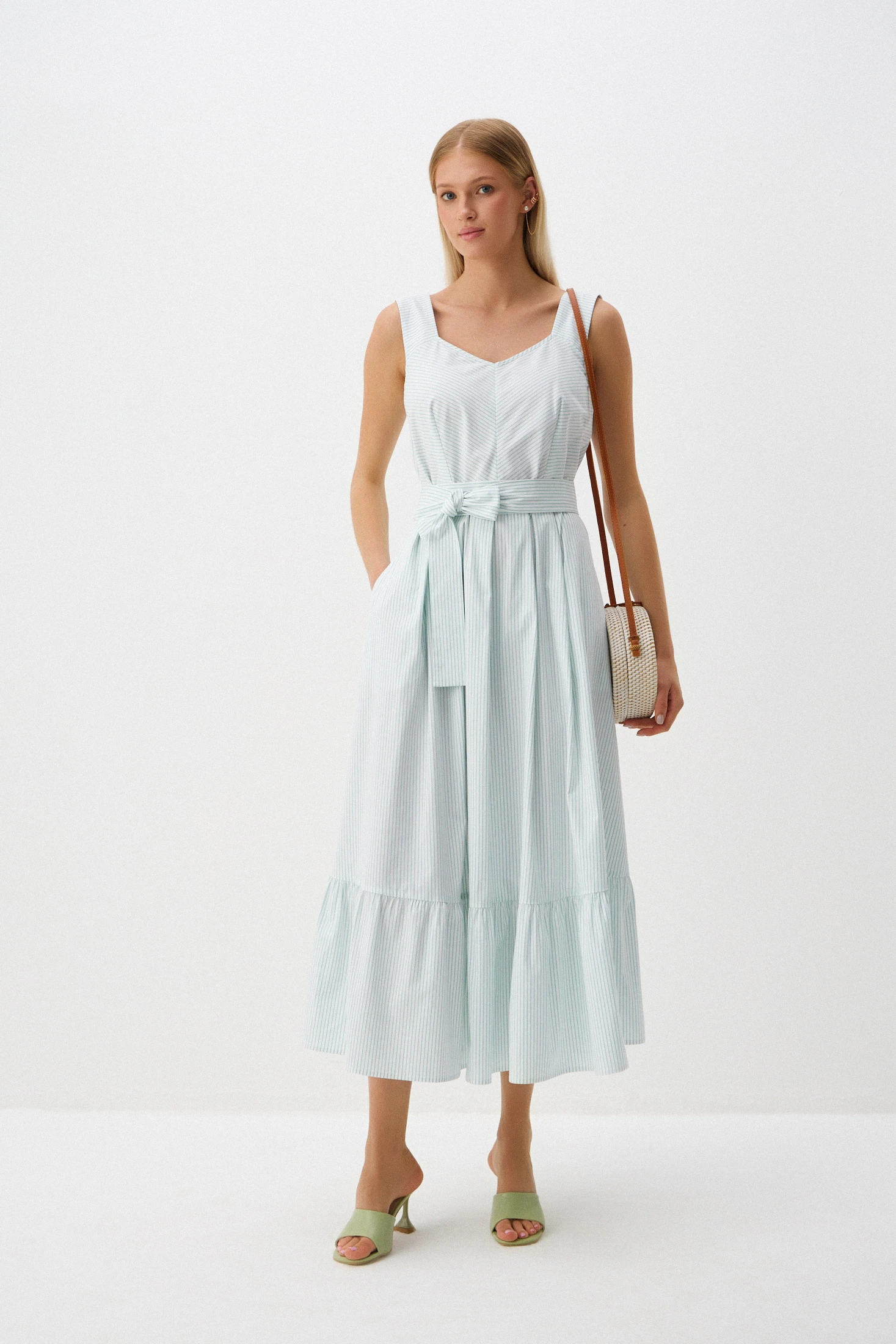 Пасторальный сарафан создан для того, чтобы подчеркнуть Вашу женственность и придать образу неповторимый шарм. Он станет отличным выбором для любительниц романтического стиля и лёгкости. Ткань на основе хлопка гигроскопична и воздухопроницаема. Полоски мятного оттенка разной направленности создают летнее игривое настроение. Длина миди и удобные карманы делают сарафан функциональным и практичным для повседневной носки. Этот сарафан идеально сочетает в себе стиль, комфорт и практичность, делая его отличным выбором для летних дней и ярких образов.