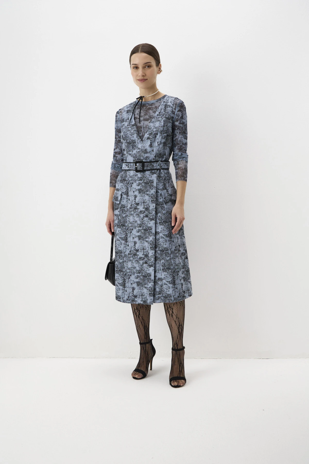 Сарафан из авторского жаккарда, созданного по эскизам дизайнеров бренда. Рисунок жаккарда отражает безмятежность и сказочность прогулок по любимому Петербургу. Сарафан отрезной по линии талии с V-образным вырезом и юбкой А-силуэта длины миди с глубоким запахом. Рельефы по лифу обеспечивают прилегание по фигуре. Отделка задаёт вертикаль и подчёркивает стройный силуэт. Сарафан дополнен поясом из основной ткани с бархатной пряжкой и шлёвками для него в области талии.